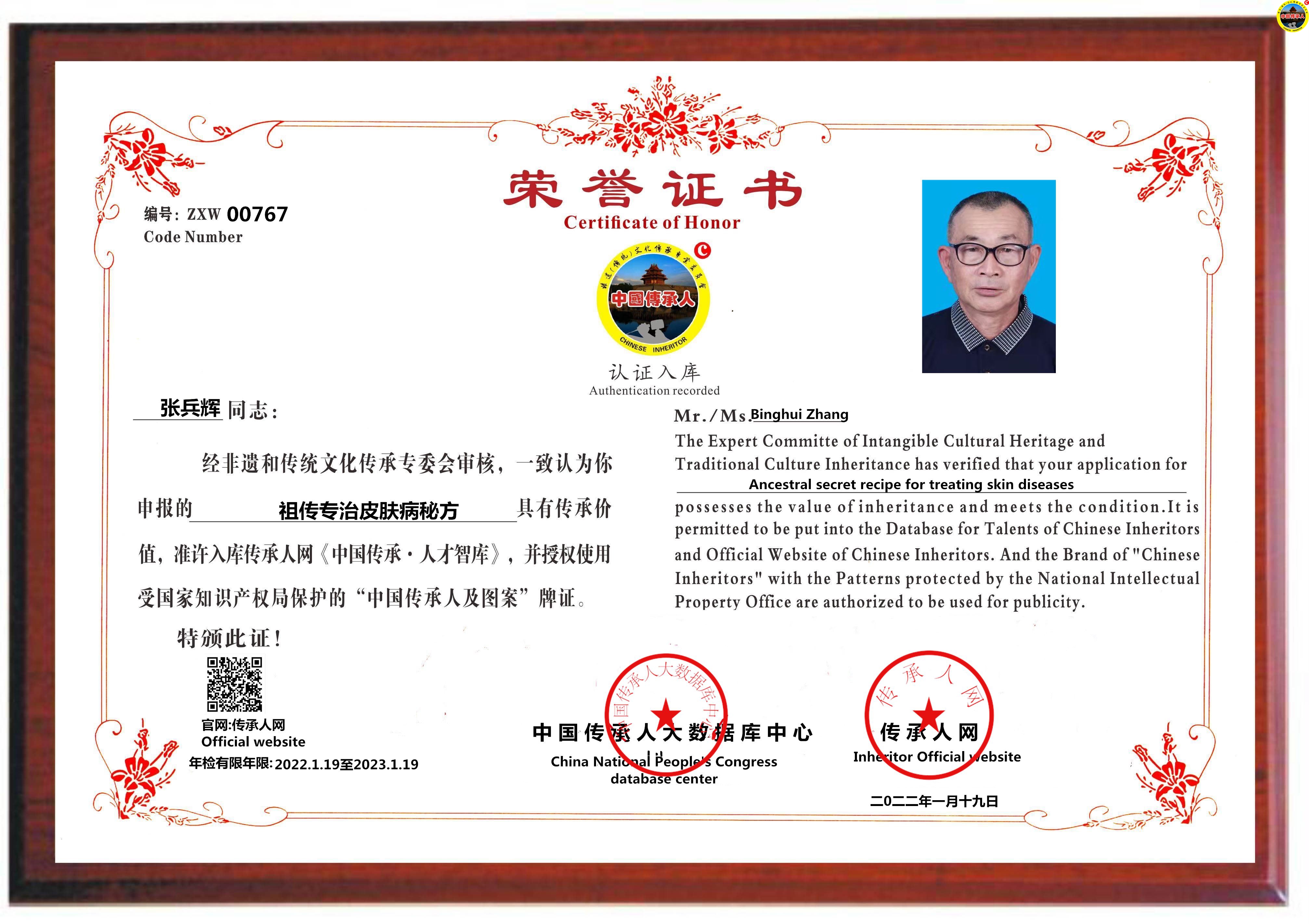 张兵辉从初中毕业开始从事中草药实用治疗一直至今,他沿用父亲传承的祖传秘方为身边的亲友、邻居解决病痛,其秘方主要治疗皮肤病、对于大小三阳、痛风、肠胃、肾结石、胆结石等也有良好的治愈效果,受到了大家的一致认可和好评。