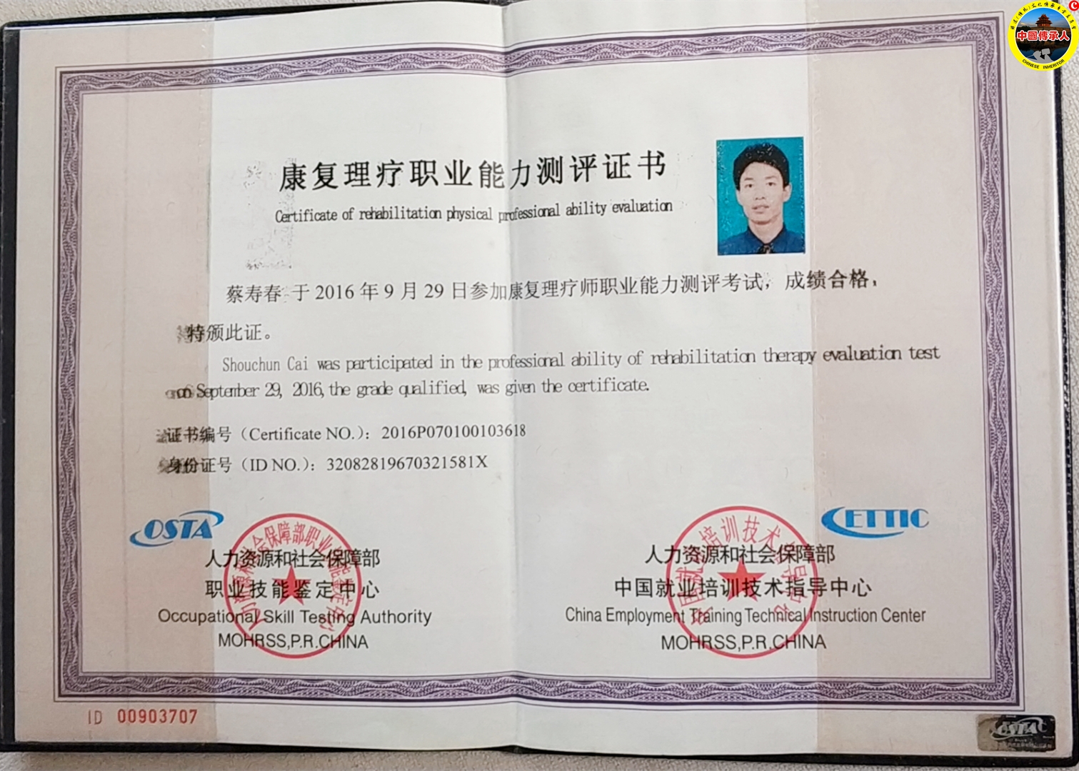 蔡寿春擅长针灸、推拿、按摩、敷贴等特色疗法,针对颈肩腰腿痛、妇科、高血压、糖尿病及失眠等疾病的治疗。他经过专业的学习,获得了针灸科医师证书、中医康复理疗职业能力测评证书等。目前已开展收徒培训,大力培训下一代,为传承中医康复疗法贡献一份力量。