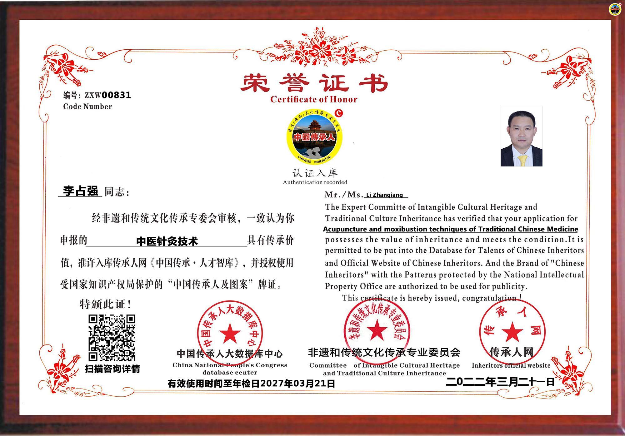 传承人网:2022年4月8日,广西南宁市李占强同志申报的“中医针灸技术”具有传承价值,准许入库传承人网《中国传承·人才智库》,并授权使  用受知识产权保护的“中国传承人及图”牌证。
