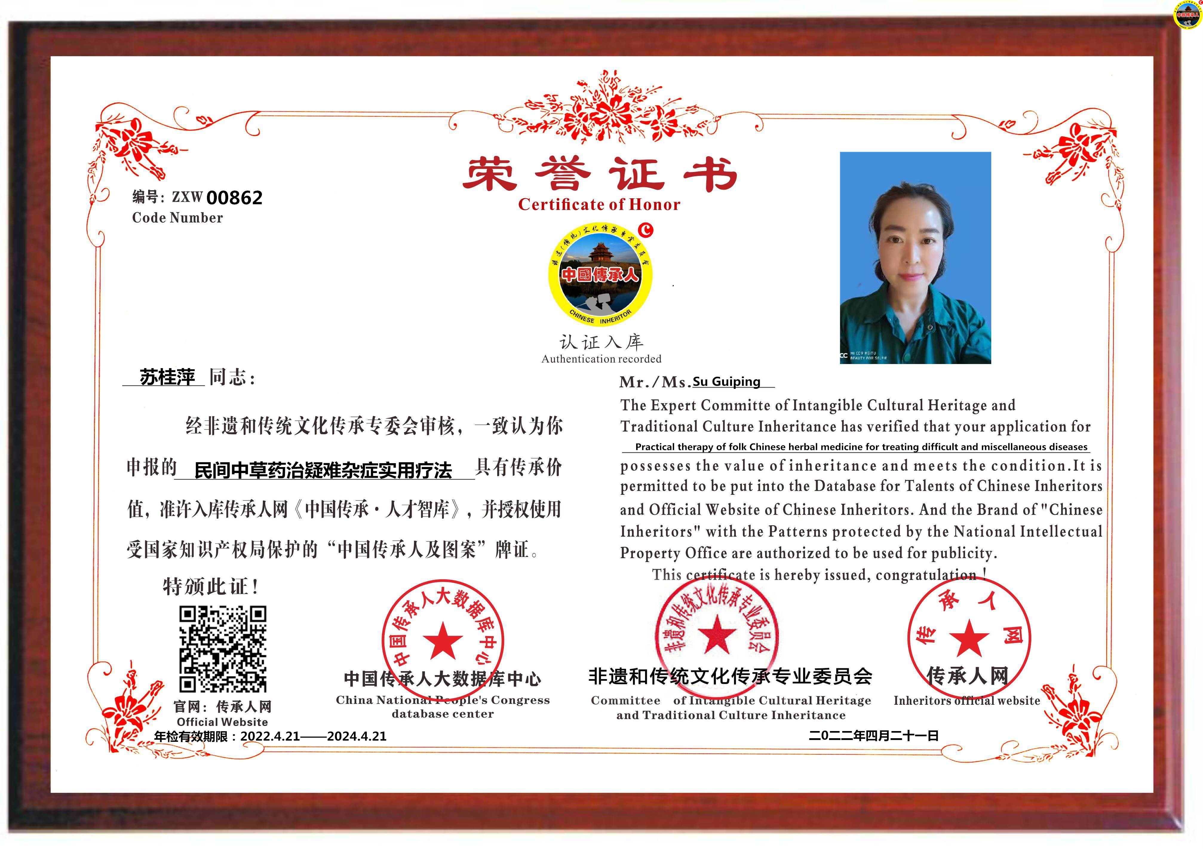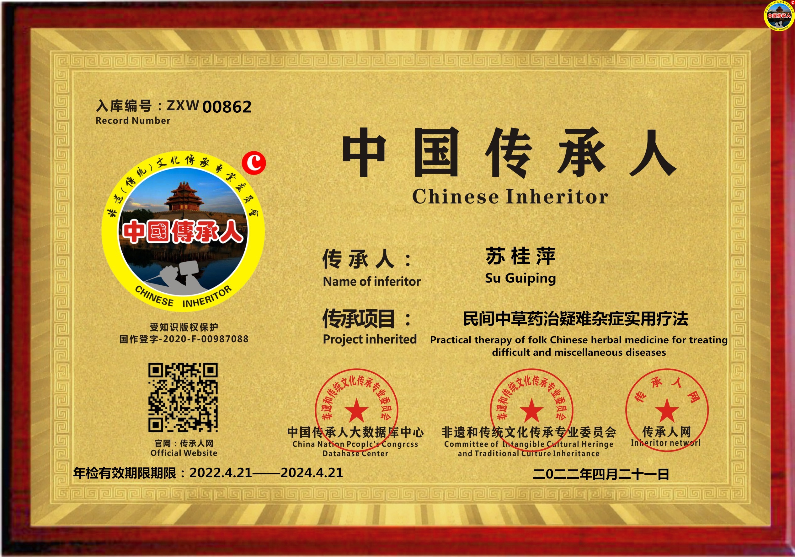 传承人网:2022年4月21日,经中国传承人大数据库中心非遗和传统文化传承专业委员会审核,认为辽宁省朝阳市苏桂萍同志申报的“民间中草药治疑难杂症实用疗法”具有传承价值,符合申报条件,准许入库传承人网《中国传承·人才智库》,并授权使用受知识产权保护的“中国传承人及图”牌证。