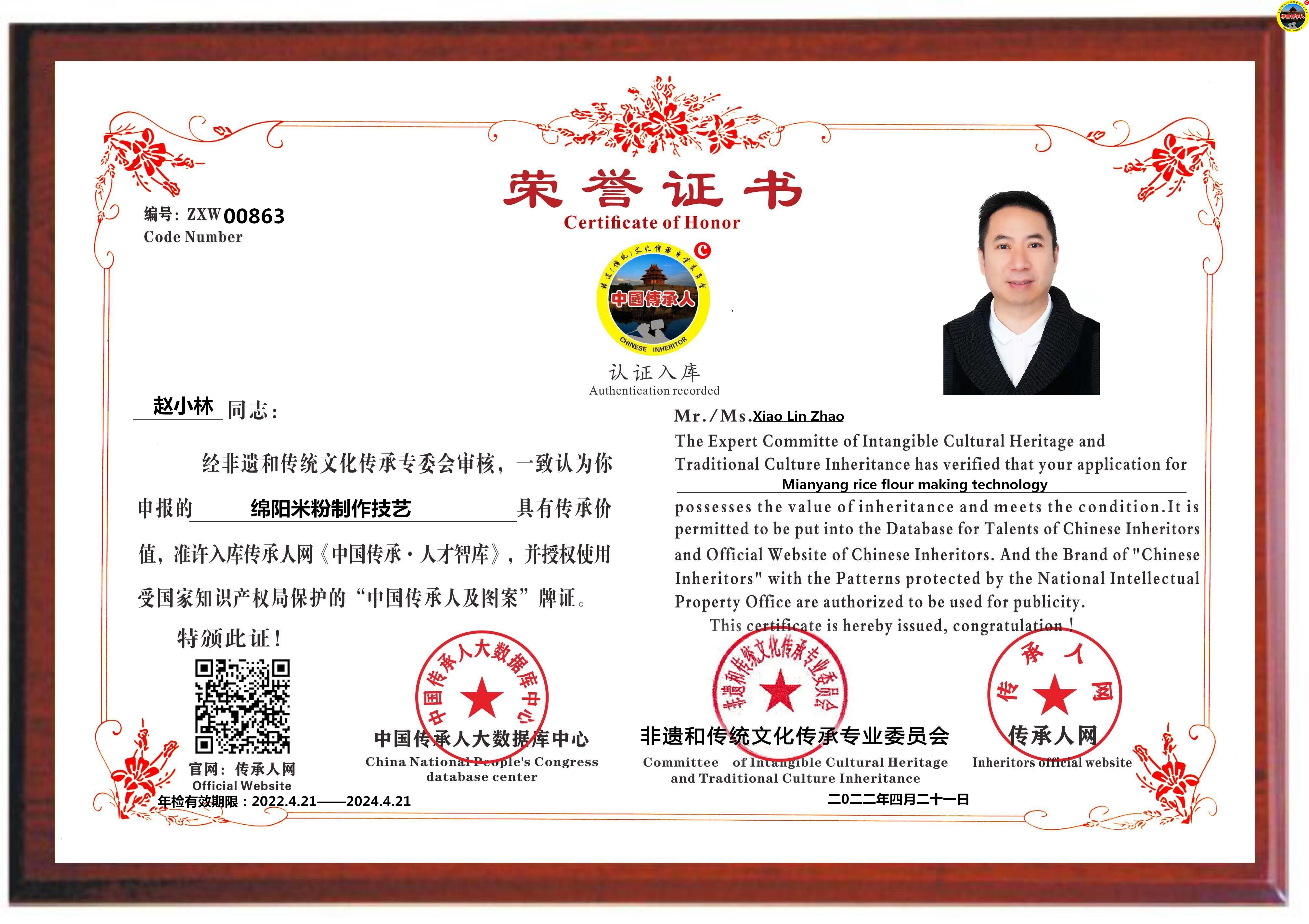 传承人网:2022年4月21日,经中国传承人大数据库中心非遗和传统文化传承专业委员会审核,认为四川省绵阳市赵小林同志申报的“绵阳米粉制作技艺”具有传承价值,符合申报条件,准许入库传承人网《中国传承·人才智库》,并授权使用受知识产权保护的“中国传承人及图”牌证。