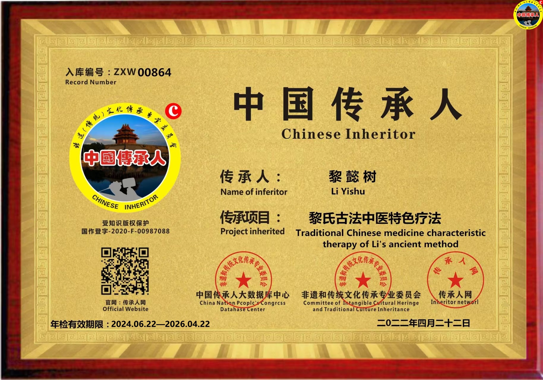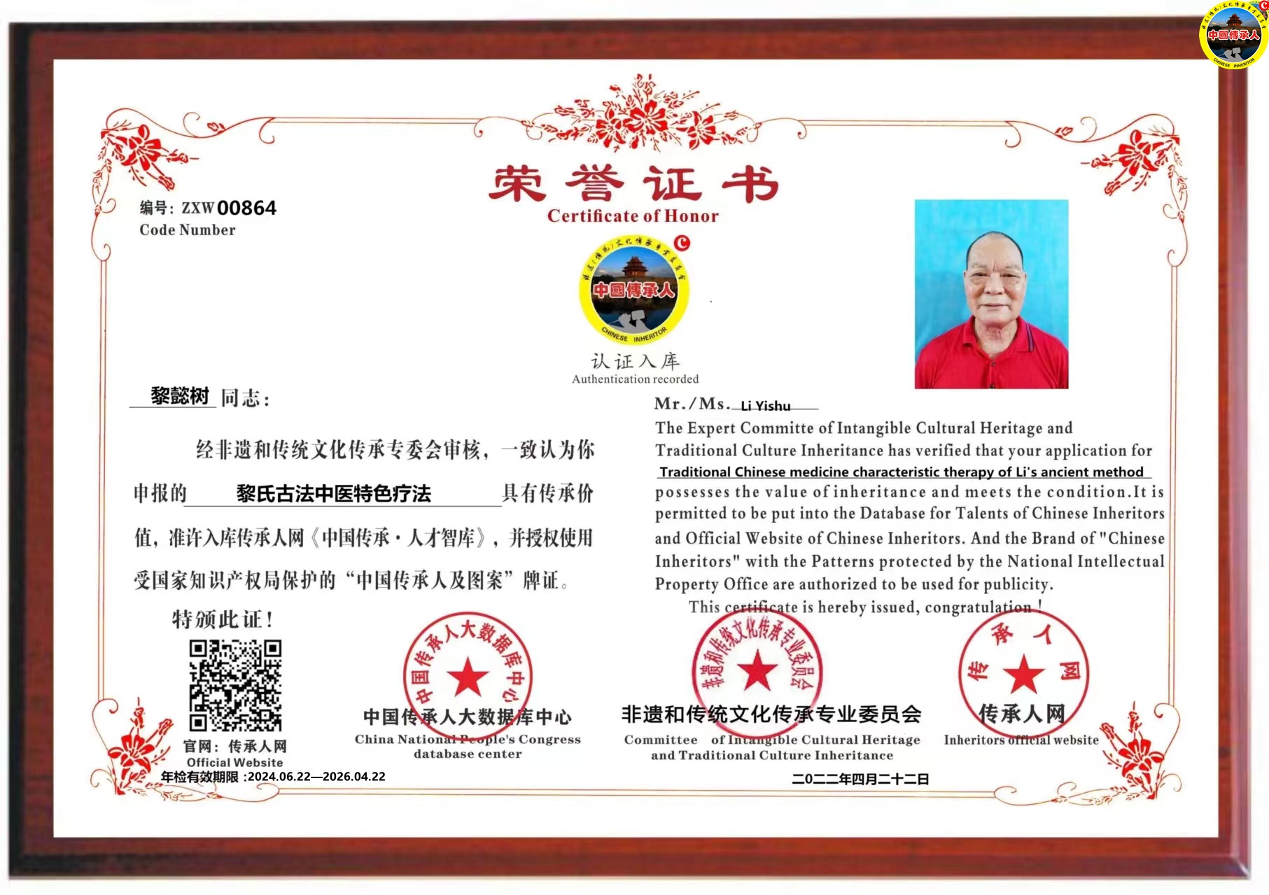 传承人网:2022年4月22日,经中国传承人大数据库中心非遗和传统文化传承专业委员会审核,认为广西兴业县黎懿树同志申报的“黎氏古法中医特色疗法”具有传承价值,符合申报条件,准许入库传承人网《中国传承·人才智库》,并授权使用受知识产权保护的“中国传承人及图”牌证。