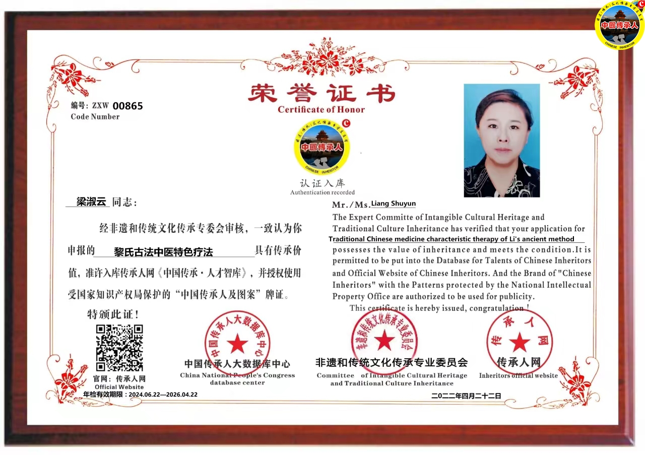 传承人网:2022年4月22日,经中国传承人大数据库中心非遗和传统文化传承专业委员会审核,认为黑龙江省大庆市梁淑云同志申报的“黎氏古法中医特色疗法”具有传承价值,符合申报条件,准许入库传承人网《中国传承·人才智库》,并授权使用受知识产权保护的“中国传承人及图”牌证。