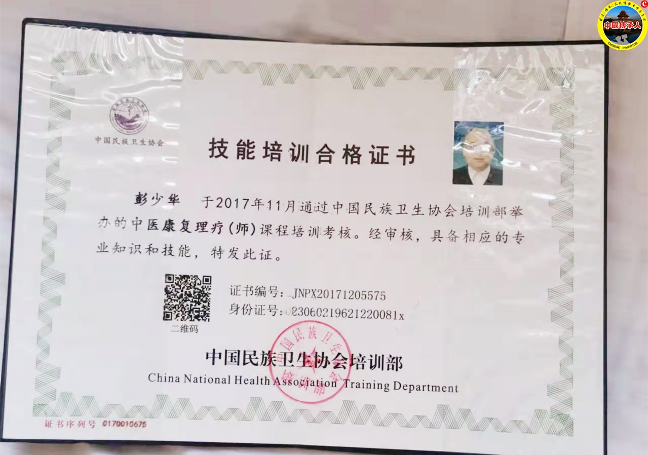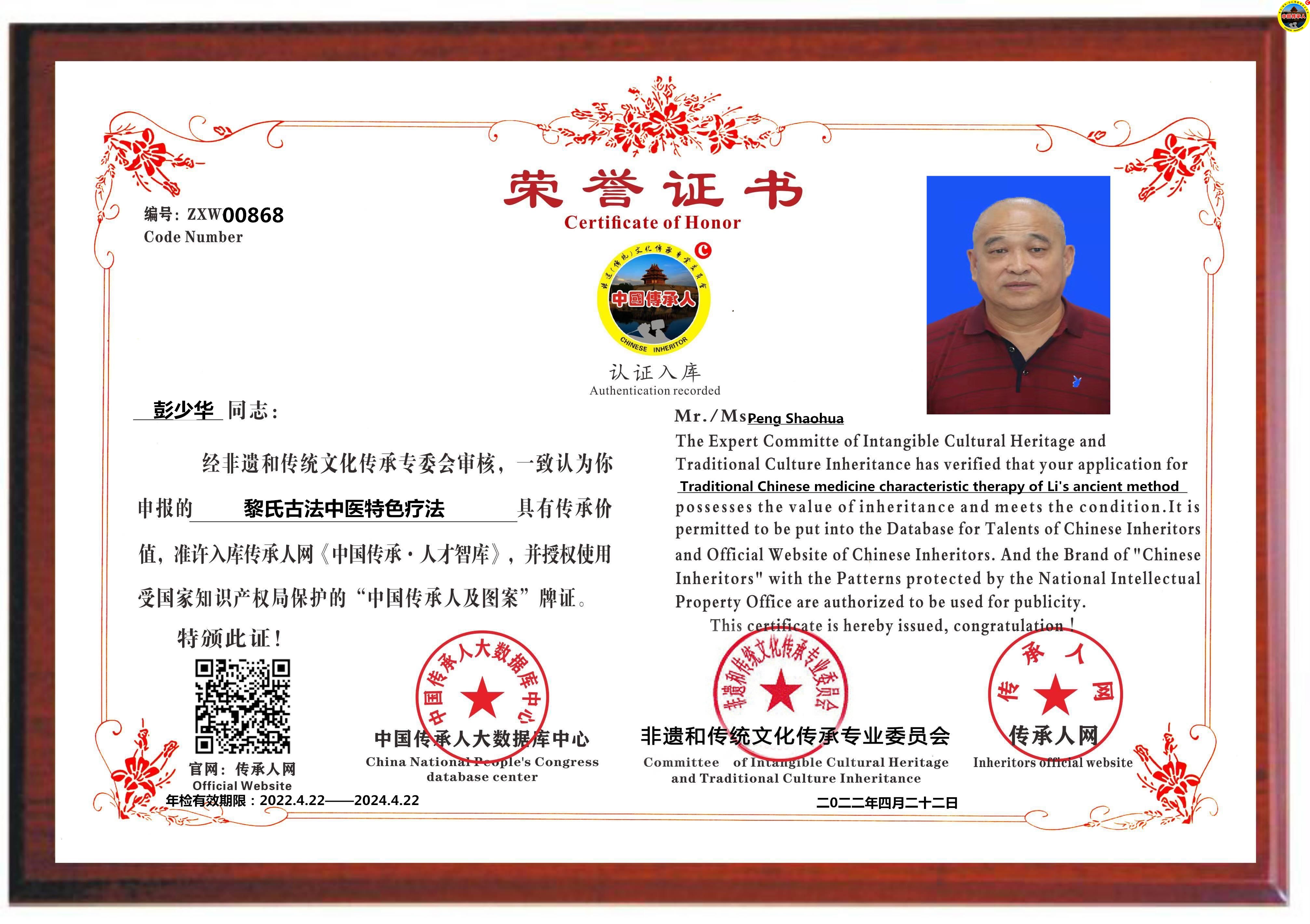 传承人网:2022年4月25日,经中国传承人大数据库中心非遗和传统文化传承专业委员会审核,认为黑龙江省大庆市彭少华同志申报的“黎氏古法中医特色疗法”具有传承价值,符合申报条件,准许入库传承人网《中国传承·人才智库》,并授权使用受知识产权保护的“中国传承人及图”牌证。