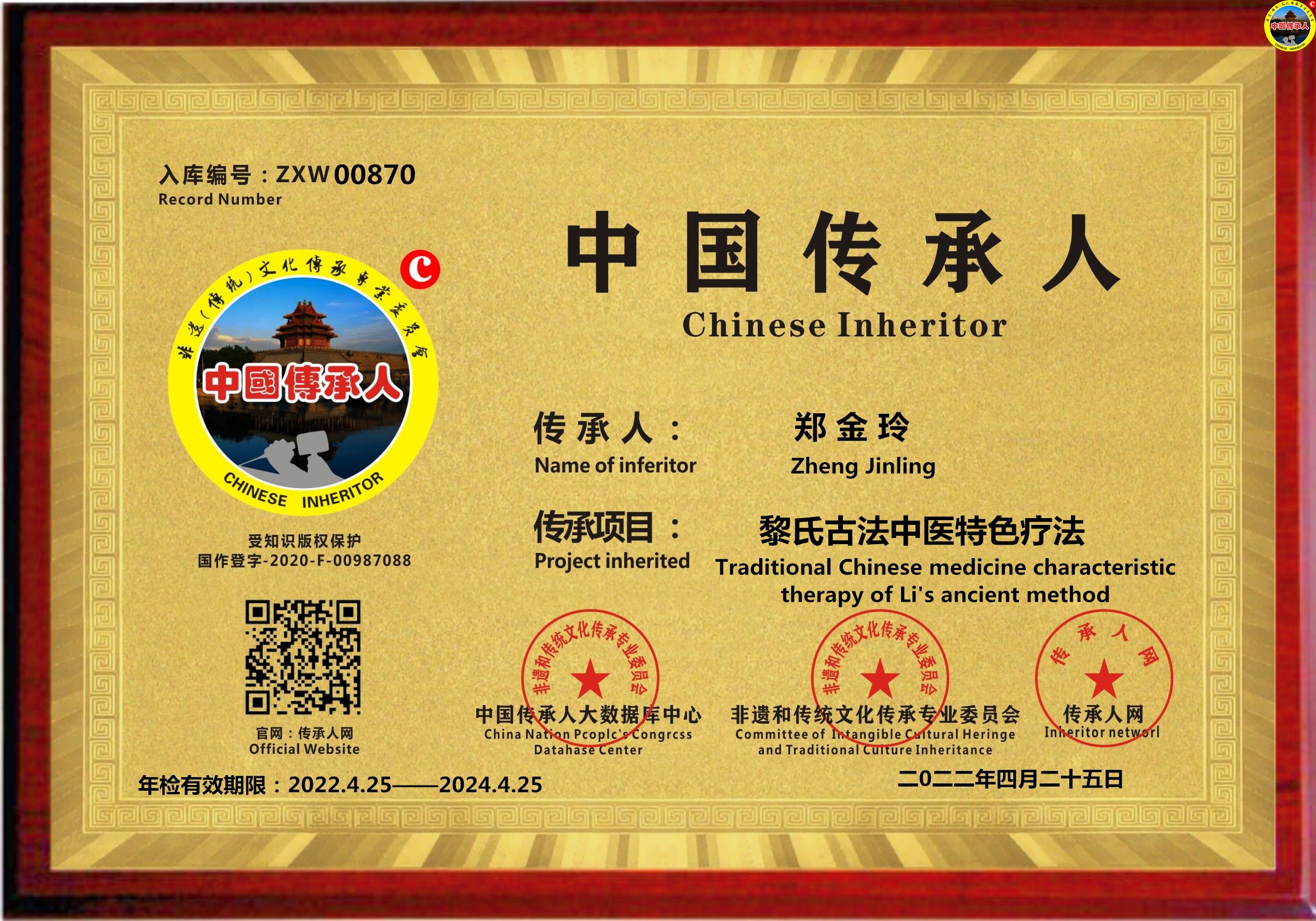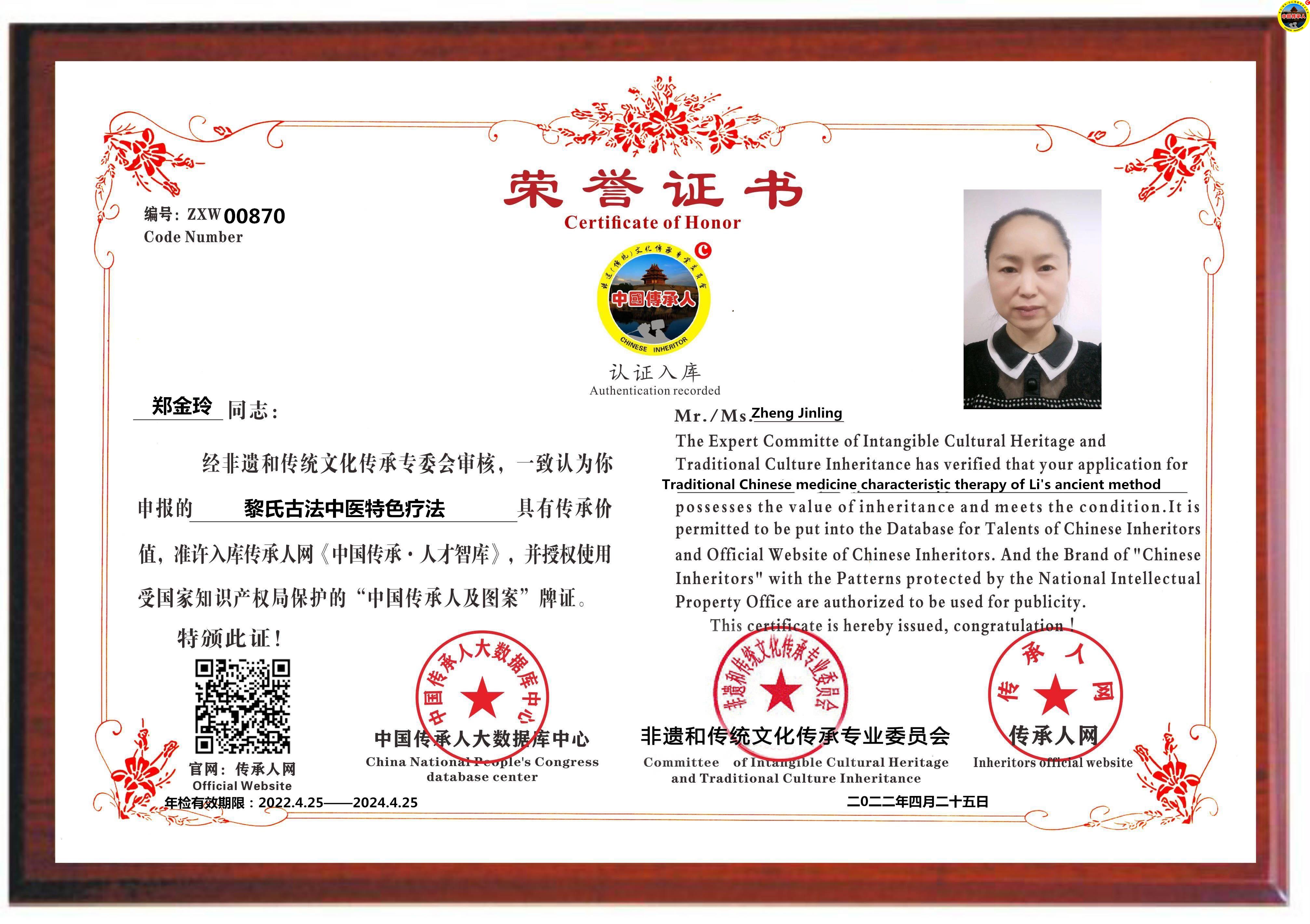 传承人网:2022年4月25日,经中国传承人大数据库中心非遗和传统文化传承专业委员会审核,认为黑龙江省大庆市郑金玲同志申报的“黎氏古法中医特色疗法”具有传承价值,符合申报条件,准许入库传承人网《中国传承·人才智库》,并授权使用受知识产权保护的“中国传承人及图”牌证。