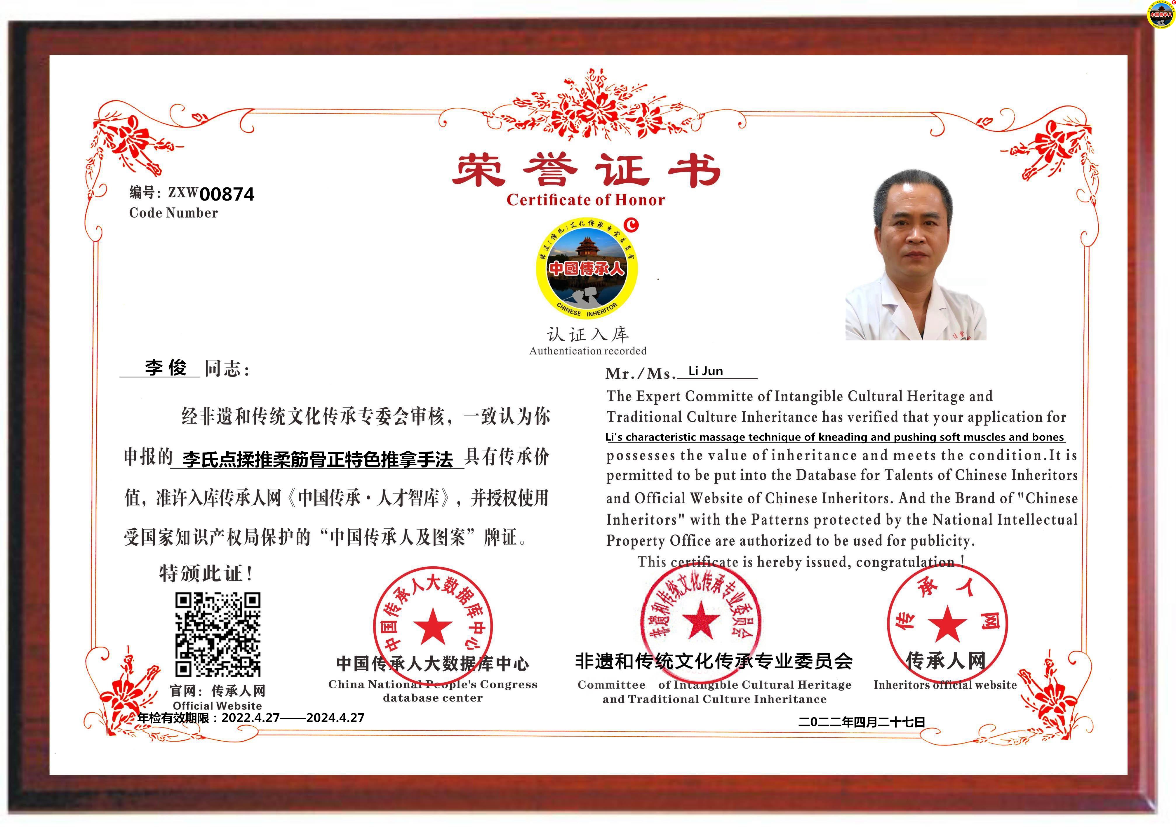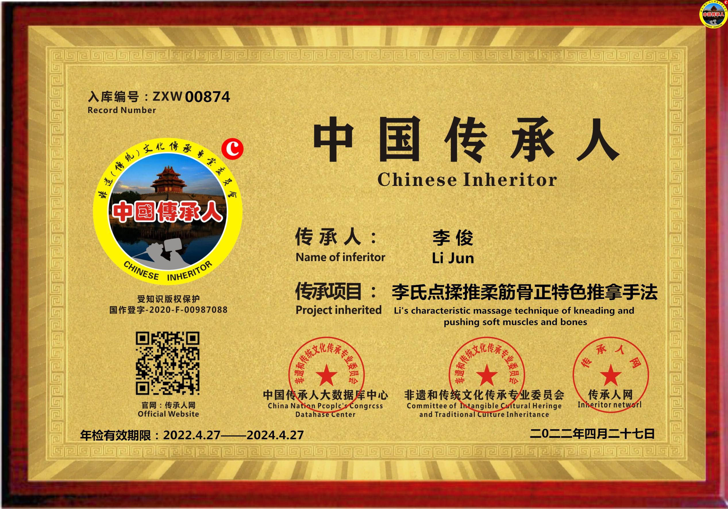 传承人网:2022年4月27日,经中国传承人大数据库中心非遗和传统文化传承专业委员会审核,认为广东省汕头市李俊同志申报的“李氏点揉推柔筋骨正特色推拿手法”具有传承价值,符合申报条件,准许入库传承人网《中国传承·人才智库》,并授权使用受知识产权保护的“中国传承人及图”牌证。