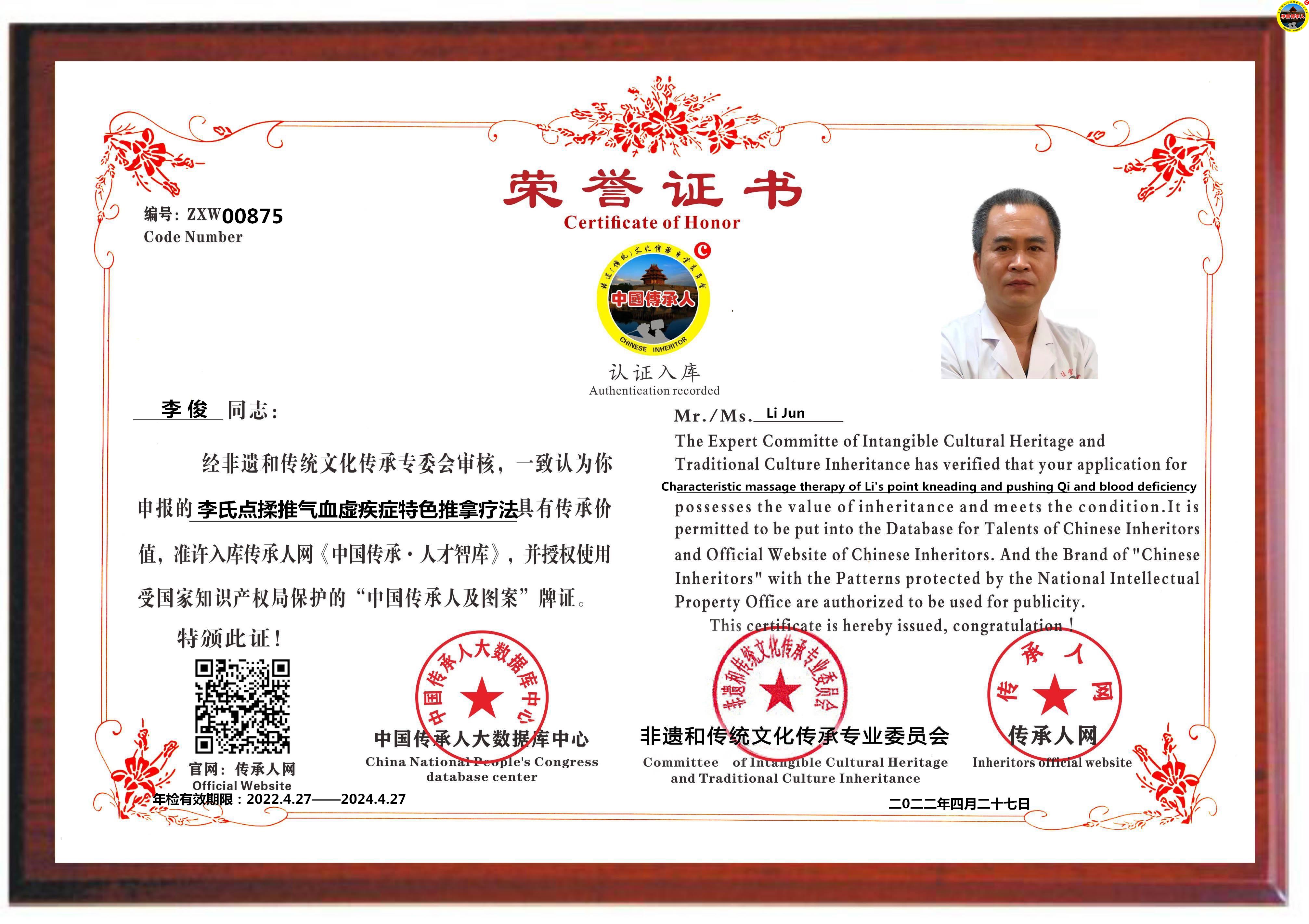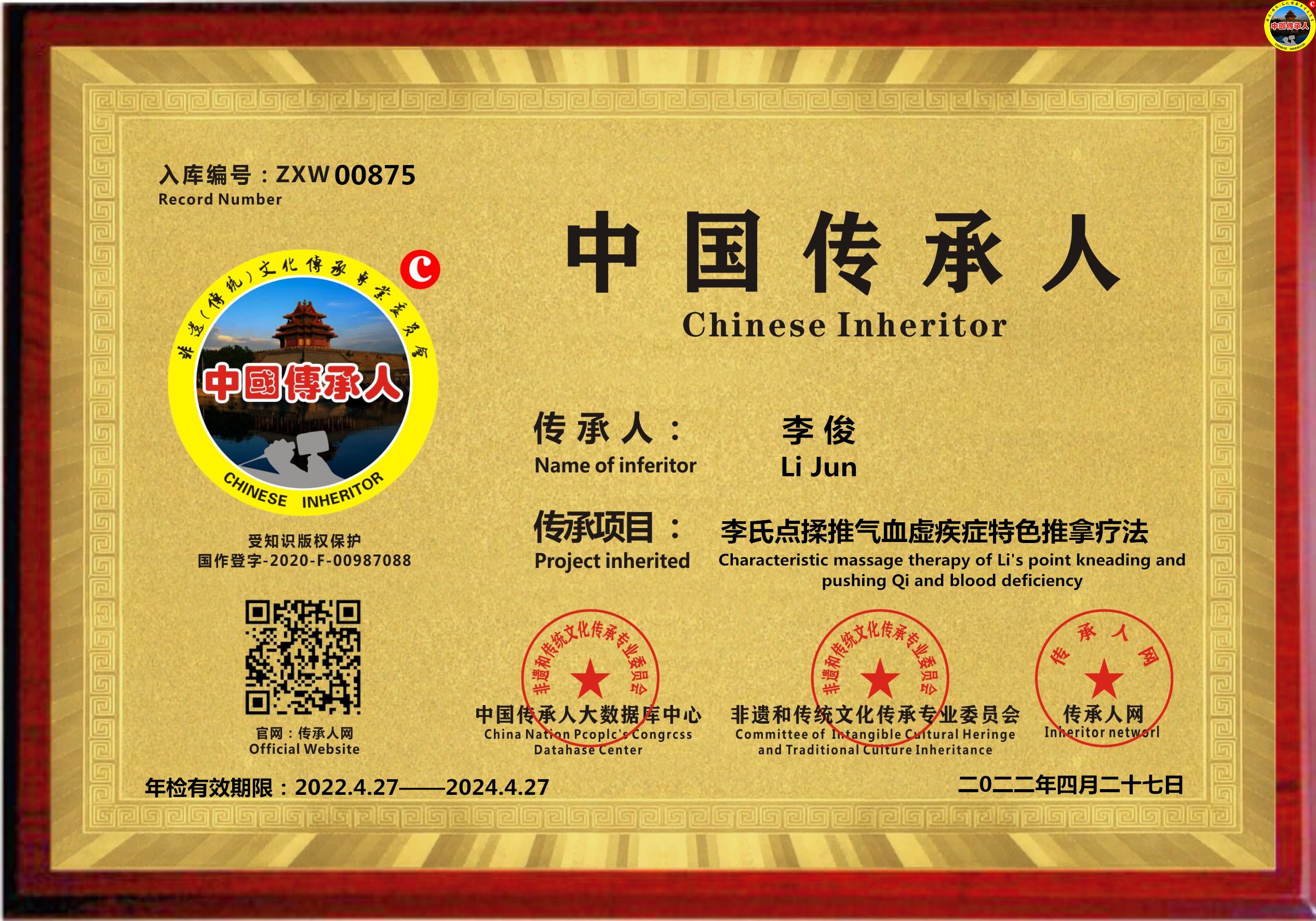 传承人网:2022年4月27日,经中国传承人大数据库中心非遗和传统文化传承专业委员会审核,认为广东省汕头市李俊同志申报的“李氏点揉推气血虚疾症特色推拿疗法”具有传承价值,符合申报条件,准许入库传承人网《中国传承·人才智库》,并授权使用受知识产权保护的“中国传承人及图”牌证。