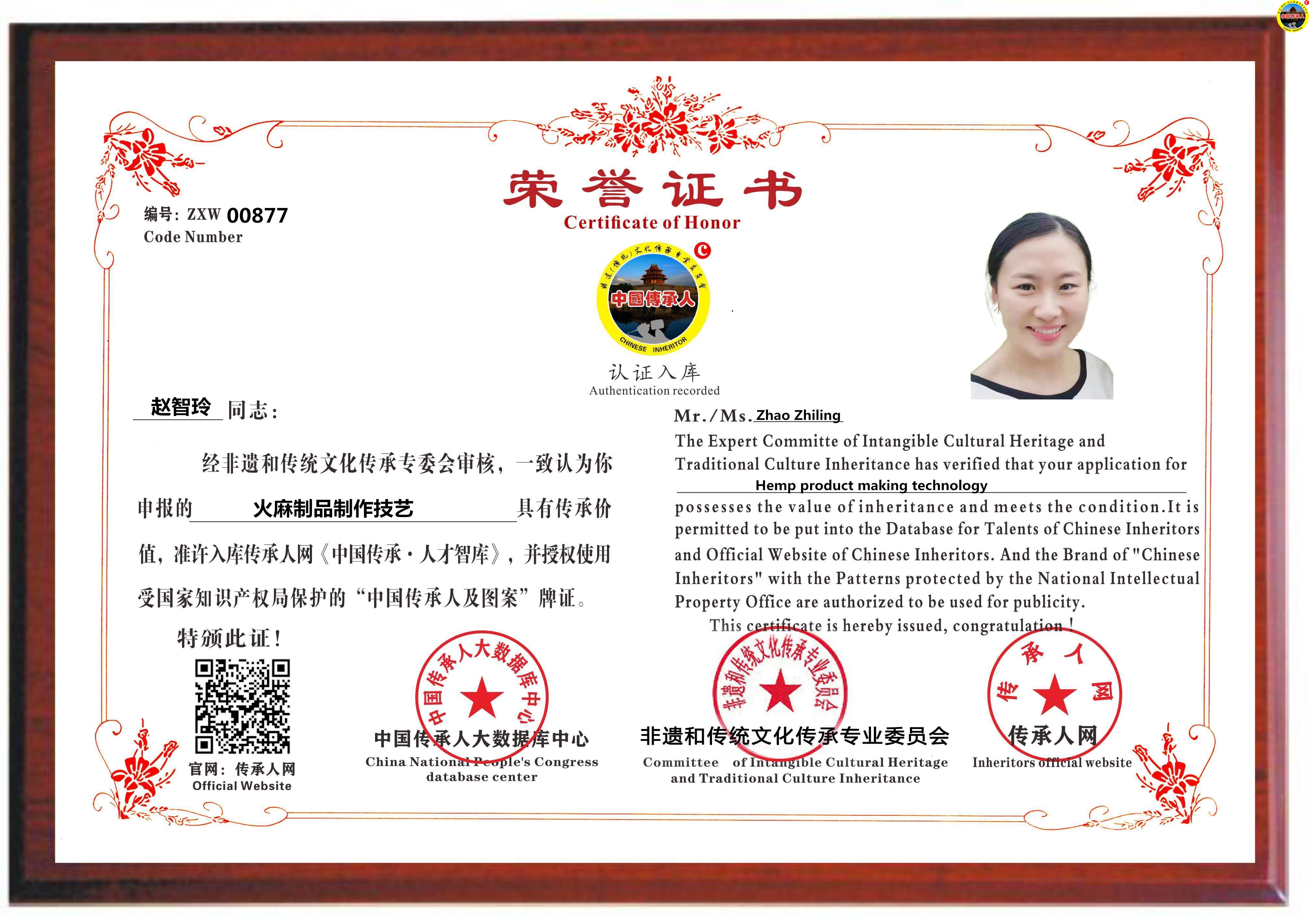 传承人网:2022年4月28日,经中国传承人大数据库中心非遗和传统文化传承专业委员会审核,认为广西河池市赵智玲同志申报的“火麻制品制作技艺”具有传承价值,符合申报条件,准许入库传承人网《中国传承·人才智库》,并授权使用受知识产权保护的“中国传承人及图”牌证。