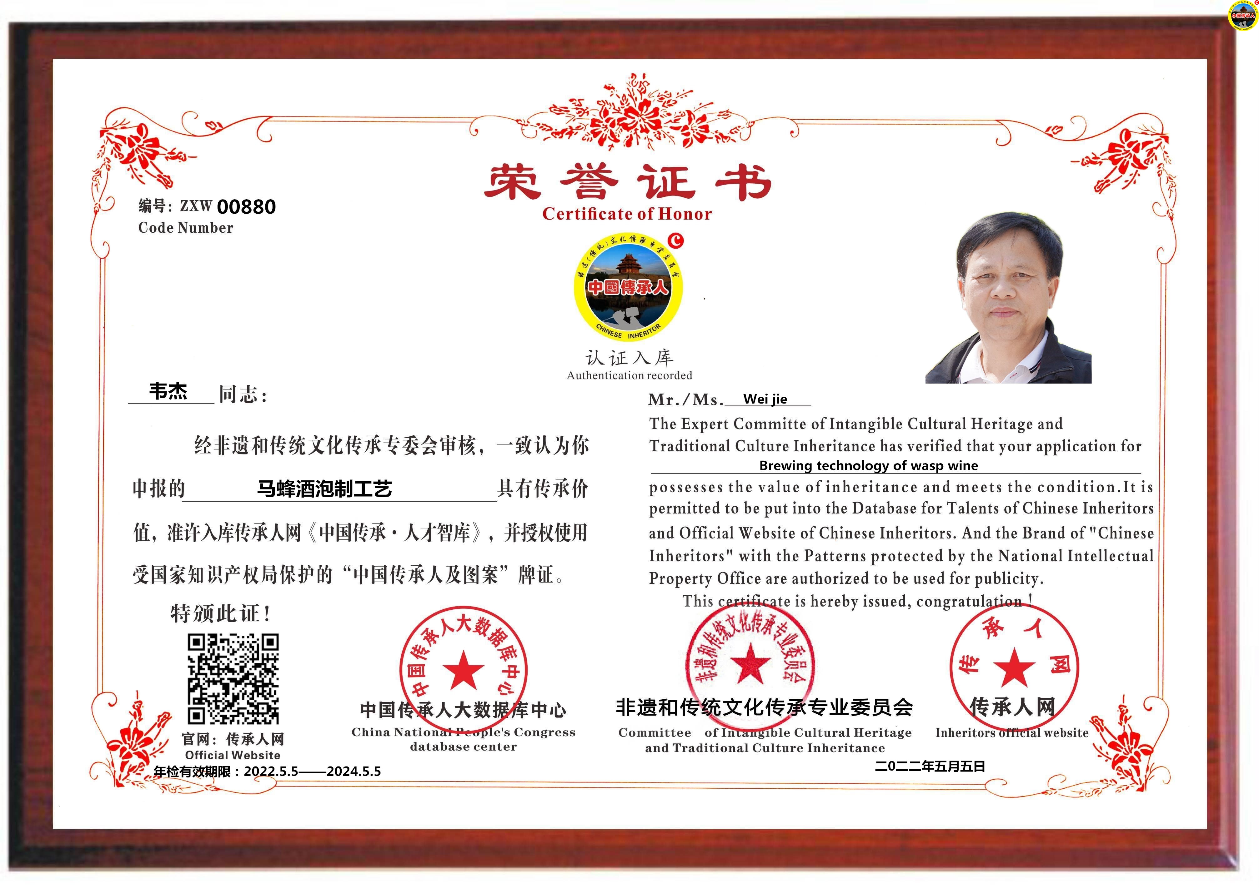 传承人网:2022年5月5日,经中国传承人大数据库中心非遗和传统文化传承专业委员会审核,认为广西河池市韦杰同志申报的“马蜂酒泡制工艺”具有传承价值,符合申报条件,准许入库传承人网《中国传承·人才智库》,并授权使用受知识产权保护的“中国传承人及图”牌证。