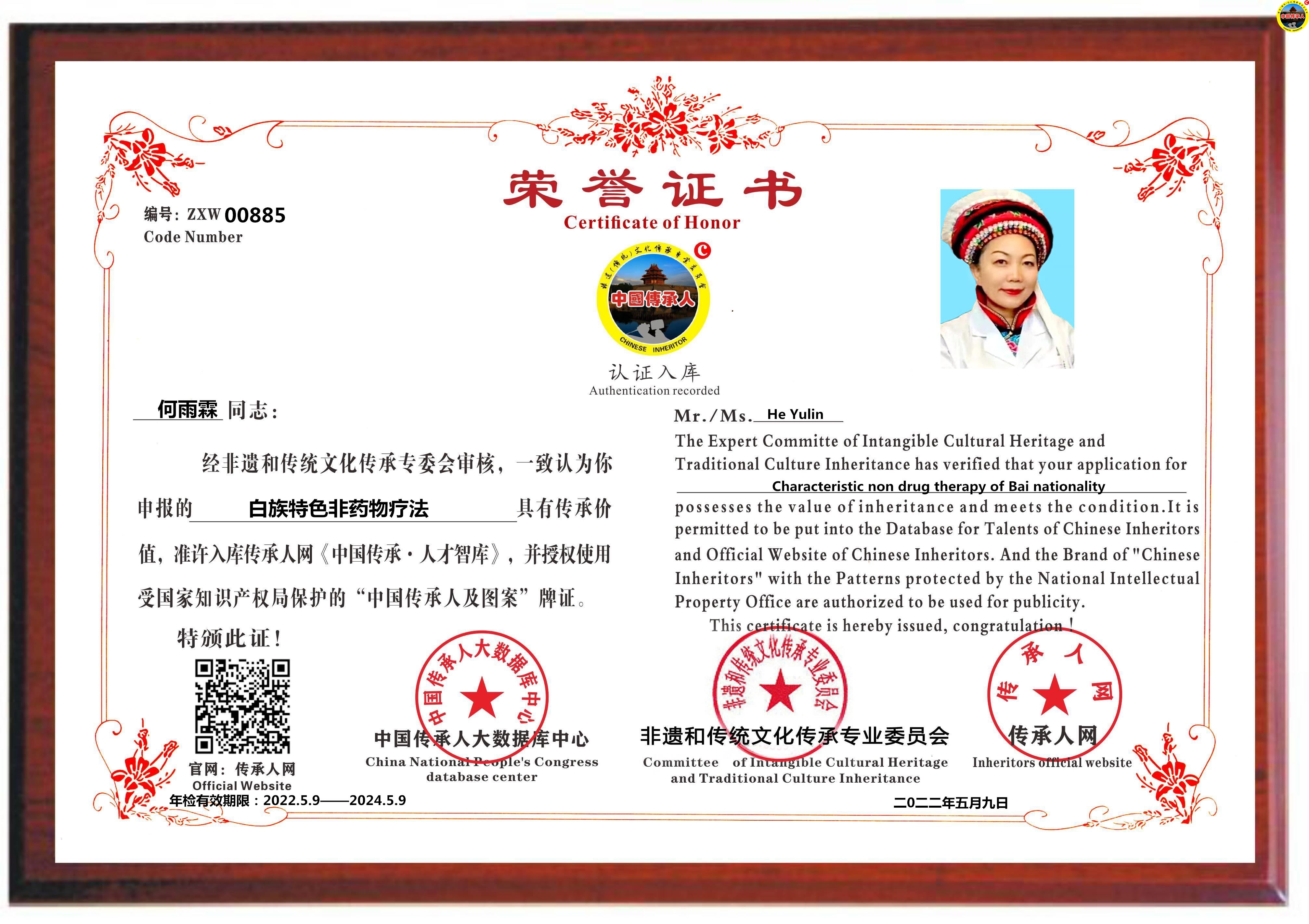 传承人网:2022年5月9日,经中国传承人大数据库中心非遗和传统文化传承专业委员会审核,认为云南省大理市何雨霖同志申报的“白族特色非药物疗法”具有传承价值,符合申报条件,准许入库传承人网《中国传承·人才智库》,并授权使用受知识产权保护的“中国传承人及图”牌证。