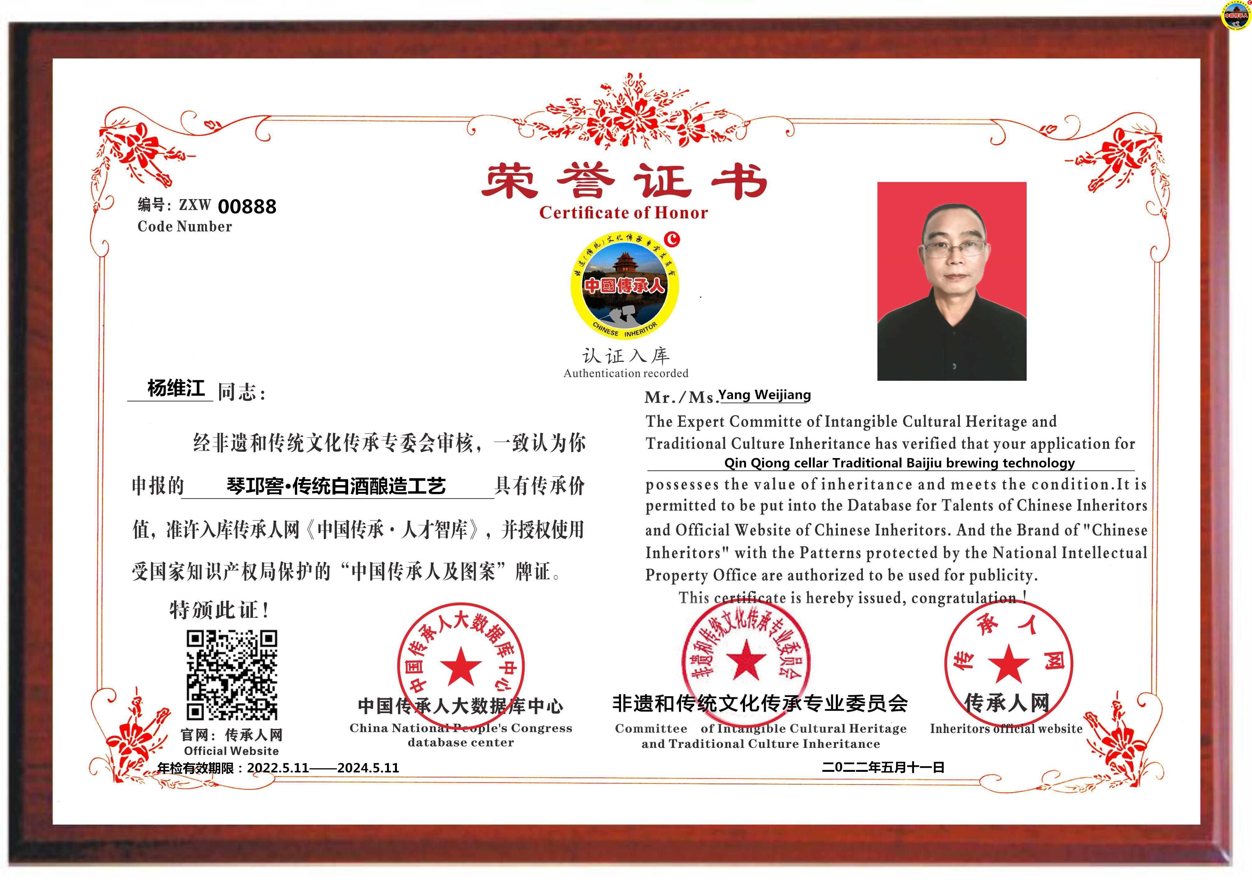 传承人网:2022年5月11日,经中国传承人大数据库中心非遗和传统文化传承专业委员会审核,认为四川省邛崃市杨维江同志申报的“琴邛窖·传统白酒酿造工艺”具有传承价值,符合申报条件,准许入库传承人网《中国传承·人才智库》,并授权使用受知识产权保护的“中国传承人及图”牌证。