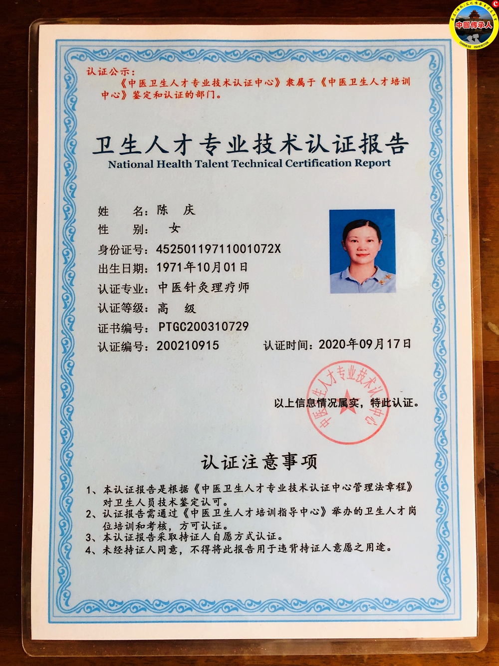 陈庆从小的时候就跟着叔父学习御灵针法,把脉,认药,制药。有了这些基础,她逐渐发现了人与天地的奥秘,人与自然相应的秘密,并沉溺其中,乐此不疲。御灵针法只在腹部行针以八卦的形式在神阙穴对应身体的各个部位,指下辩症清了,针一下去就缓解了。由于御灵针法手稿中采用了大量的道家词汇和图形,为了解开自己的许多疑惑和未知,她于2012年正式入道,遍访道家胜地,拜师道医绝学密法,游学全国道家洞天福地,历经八年有余。