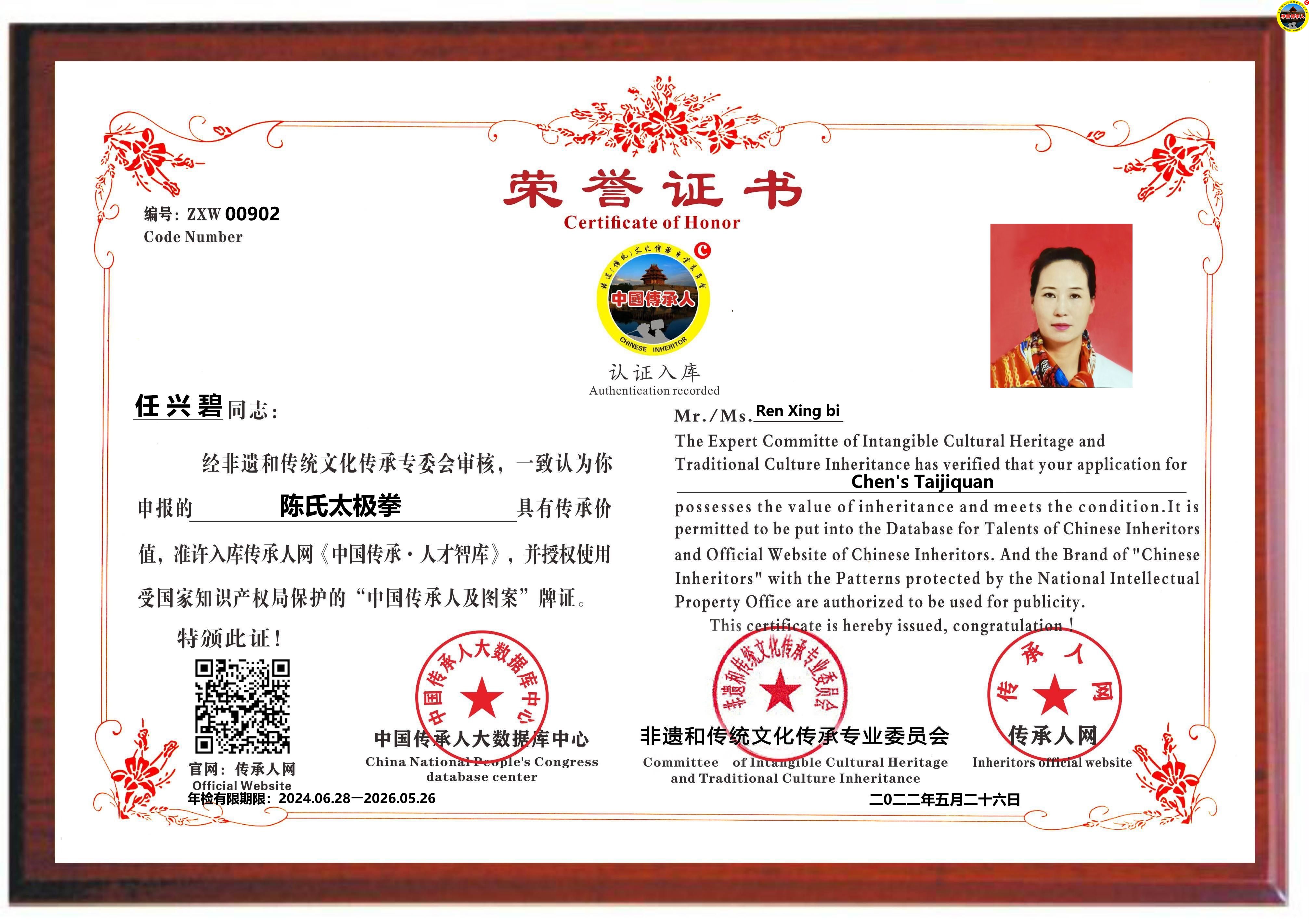 传承人网:2022年5月26日,经中国传承人大数据库中心非遗和传统文化传承专业委员会审核,认为广东省深圳市任兴碧同志申报的“陈氏太极拳”具有传承价值,符合申报条件,准许入库传承人网《中国传承·人才智库》,并授权使用受知识产权保护的“中国传承人及图”牌证。