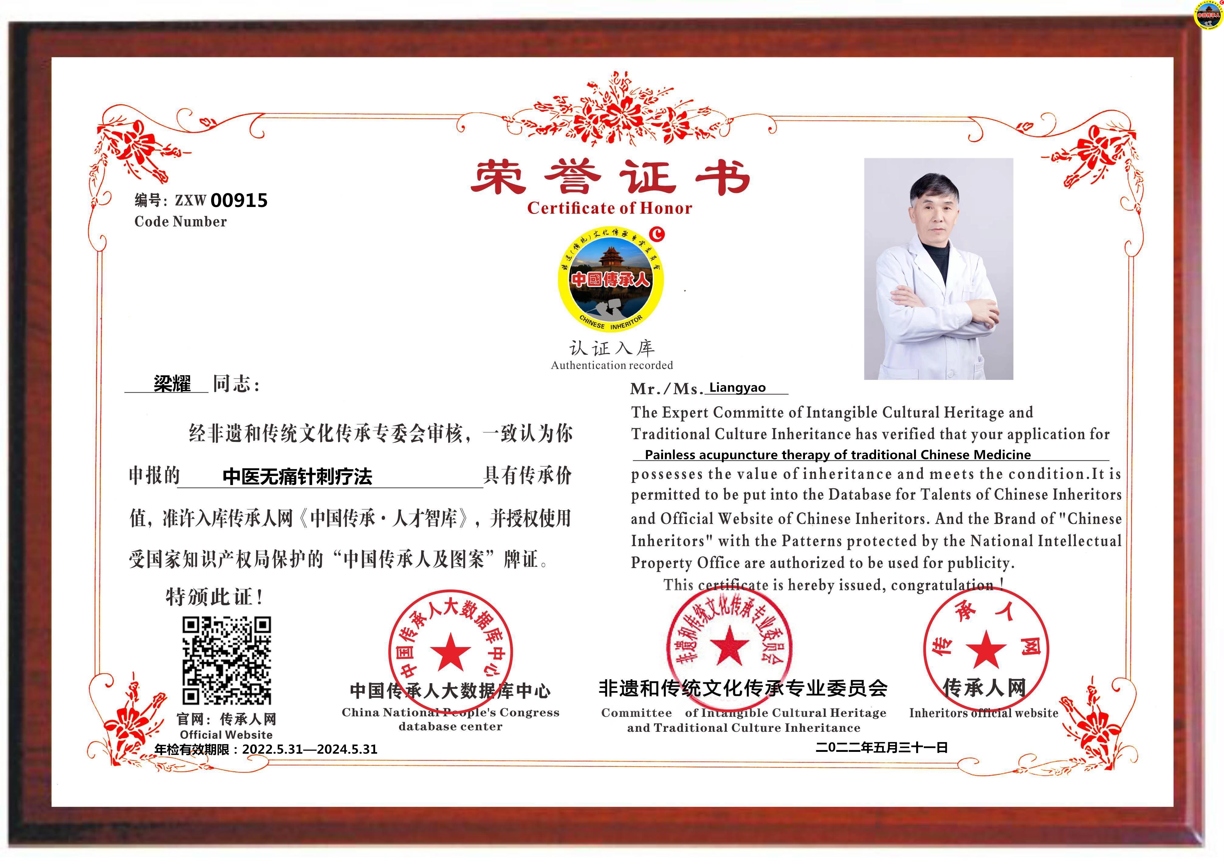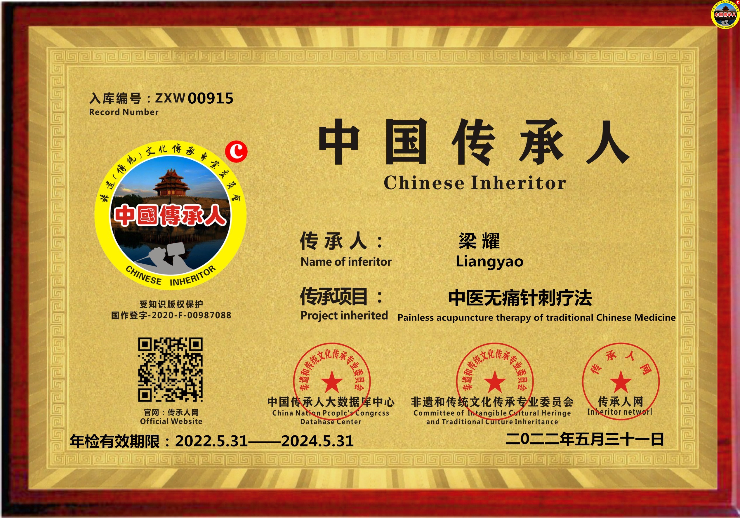 传承人网:2022年5月31日,经中国传承人大数据库中心非遗和传统文化传承专业委员会审核,认为贵州省遵义市梁耀同志申报的“中医无痛针刺疗法”具有传承价值,符合申报条件,准许入库传承人网《中国传承·人才智库》,并授权使用受知识产权保护的“中国传承人及图”牌证。