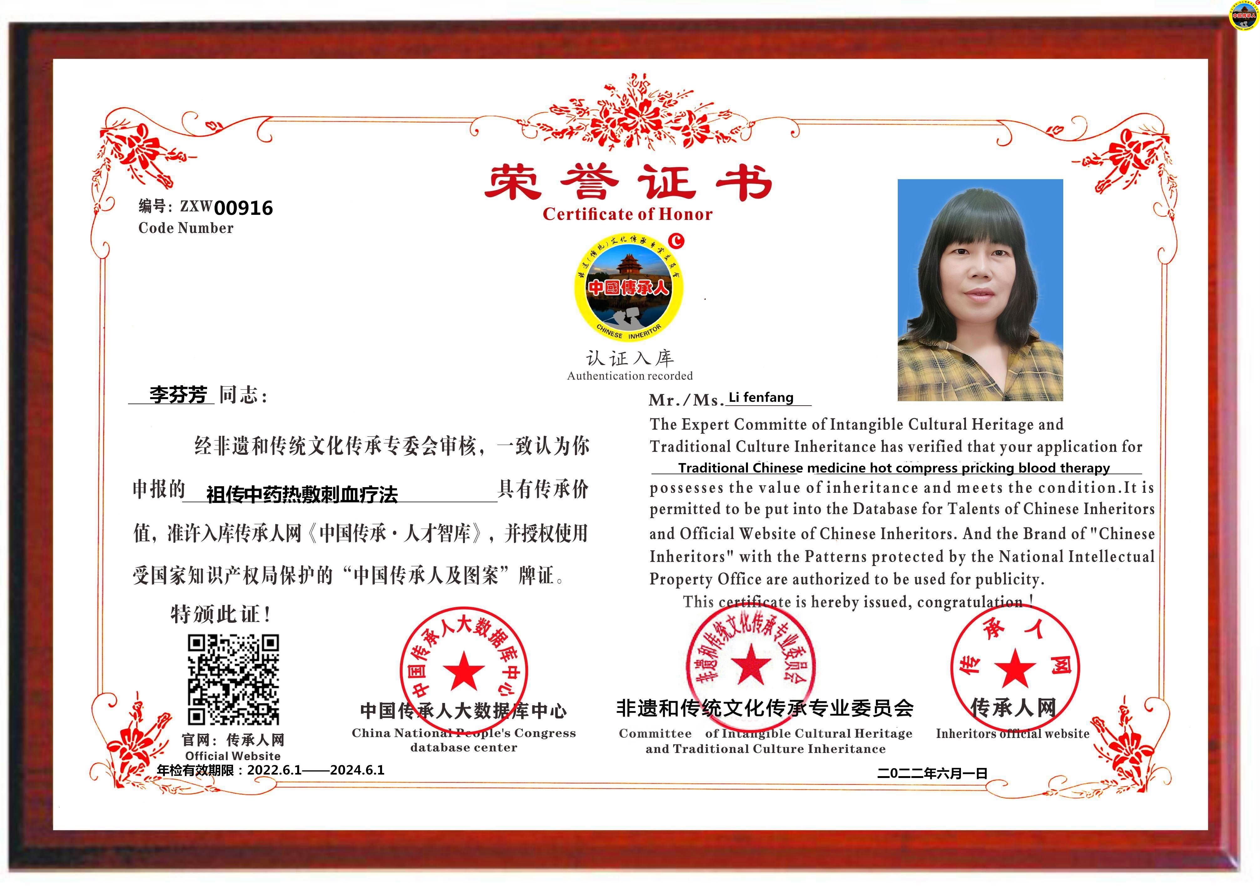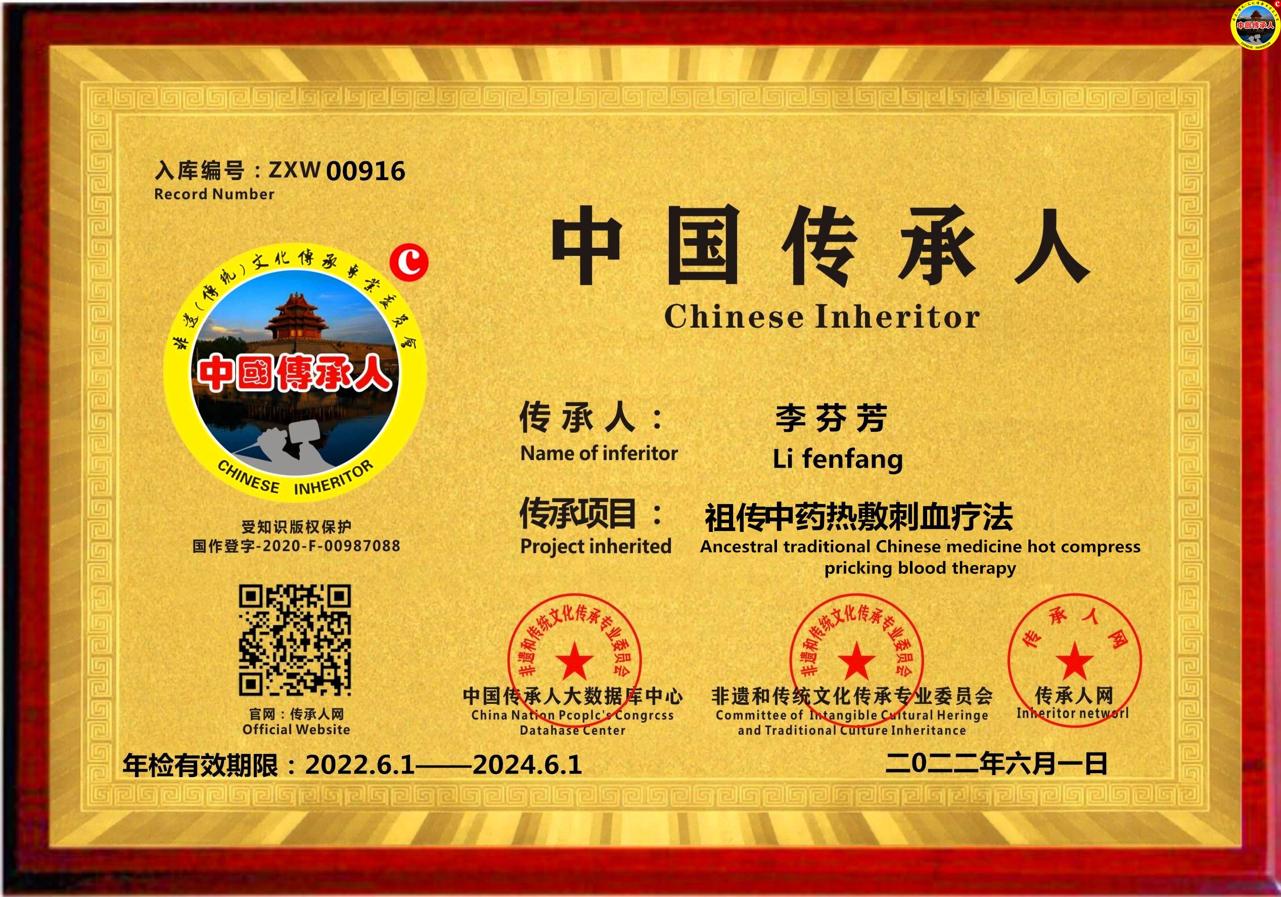 传承人网:2022年6月1日,经中国传承人大数据库中心非遗和传统文化传承专业委员会审核,认为湖南省邵阳市李芬芳同志申报的“祖传中药热敷刺血疗法”具有传承价值,符合申报条件,准许入库传承人网《中国传承·人才智库》,并授权使用受知识产权保护的“中国传承人及图”牌证。