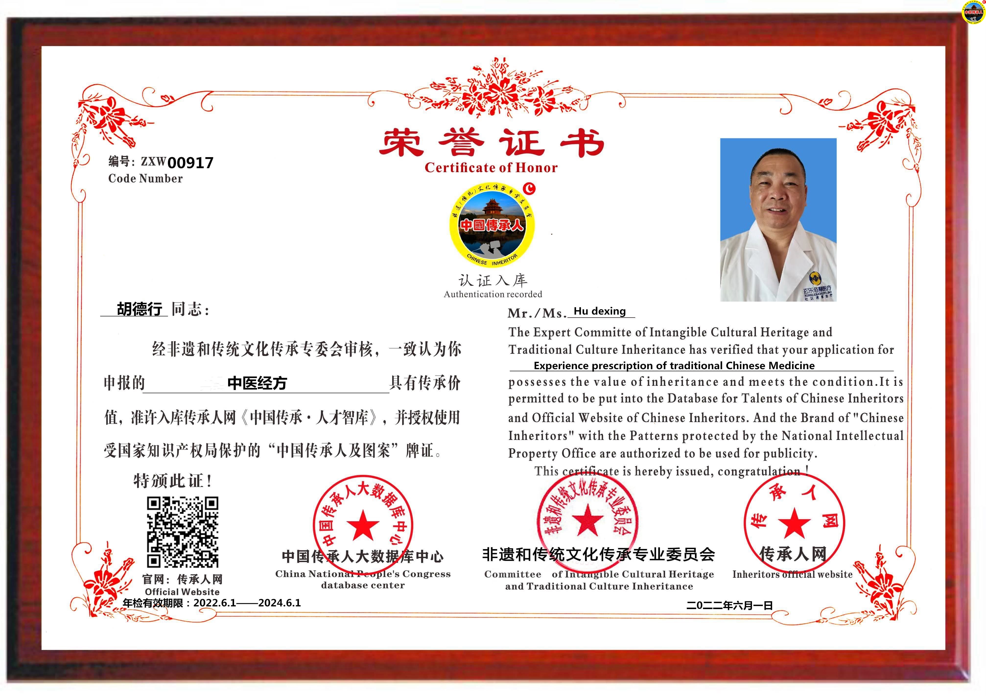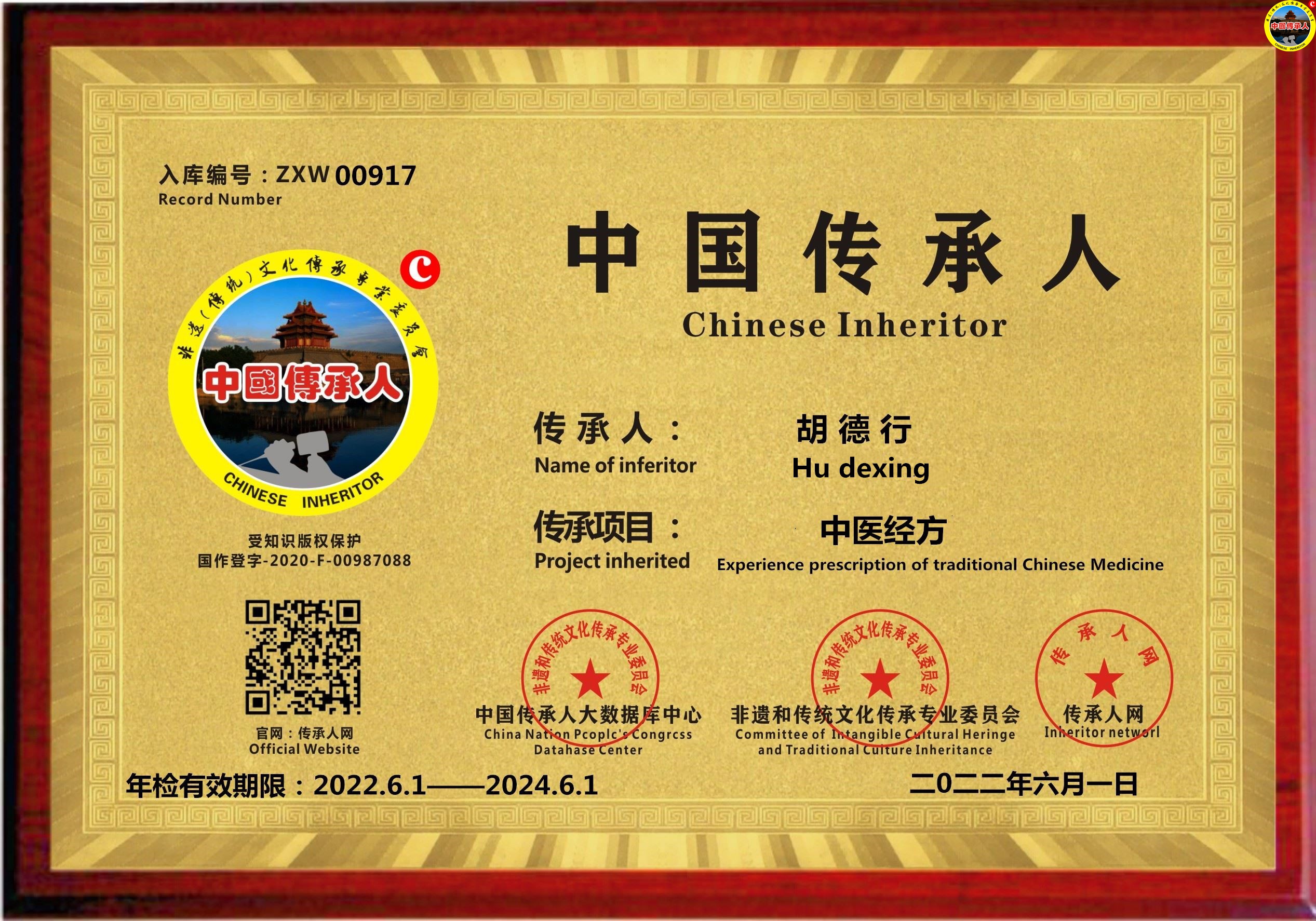 传承人网:2022年6月1日,经中国传承人大数据库中心非遗和传统文化传承专业委员会审核,认为安徽省芜湖市胡德行同志申报的“中医经方”具有传承价值,符合申报条件,准许入库传承人网《中国传承·人才智库》,并授权使用受知识产权保护的“中国传承人及图”牌证。