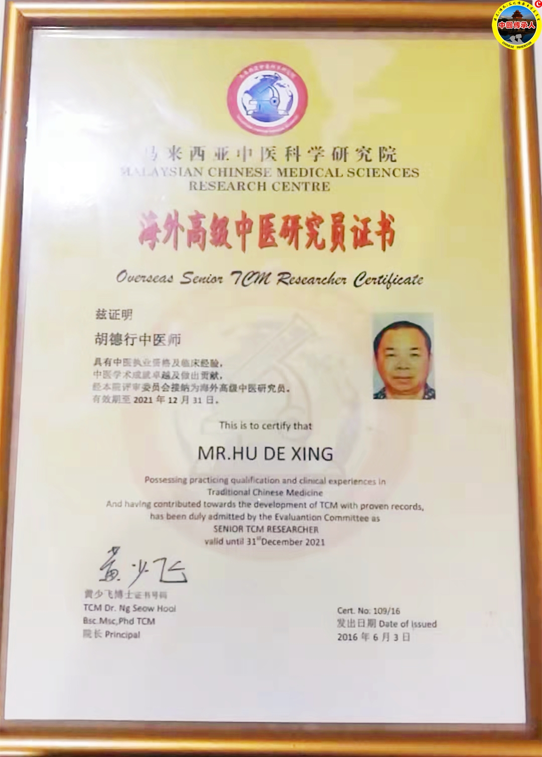 胡德行,1997年应邀到新加坡、马来西亚、印度尼西亚及菲律宾等东南亚国家去讲学交流,治疗病患,直至2020年才回中国,他在海外工作二十三年,并且得到马来西亚卫生部及马来西亚中医工会颁授的海外高级中医研究员证书。