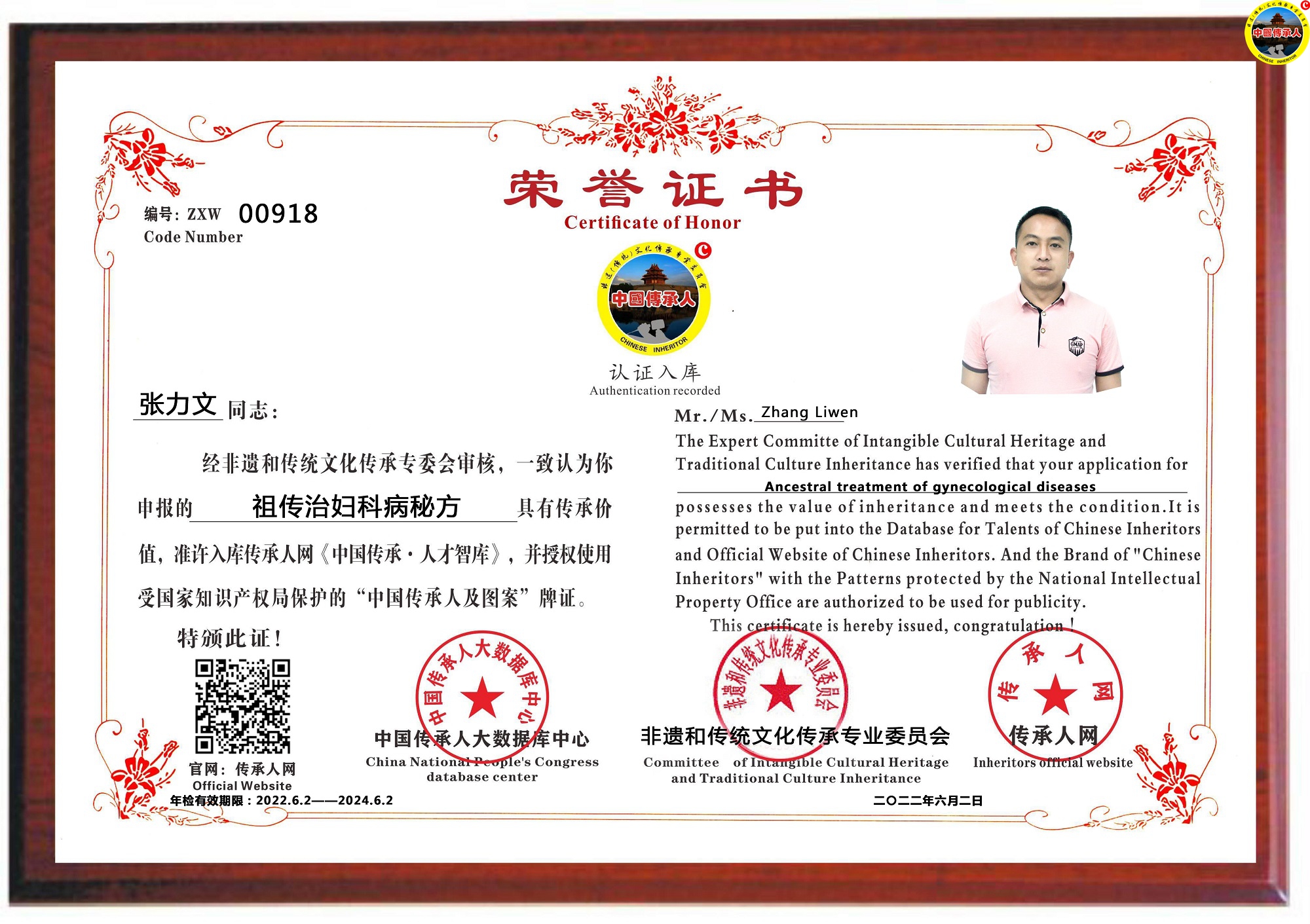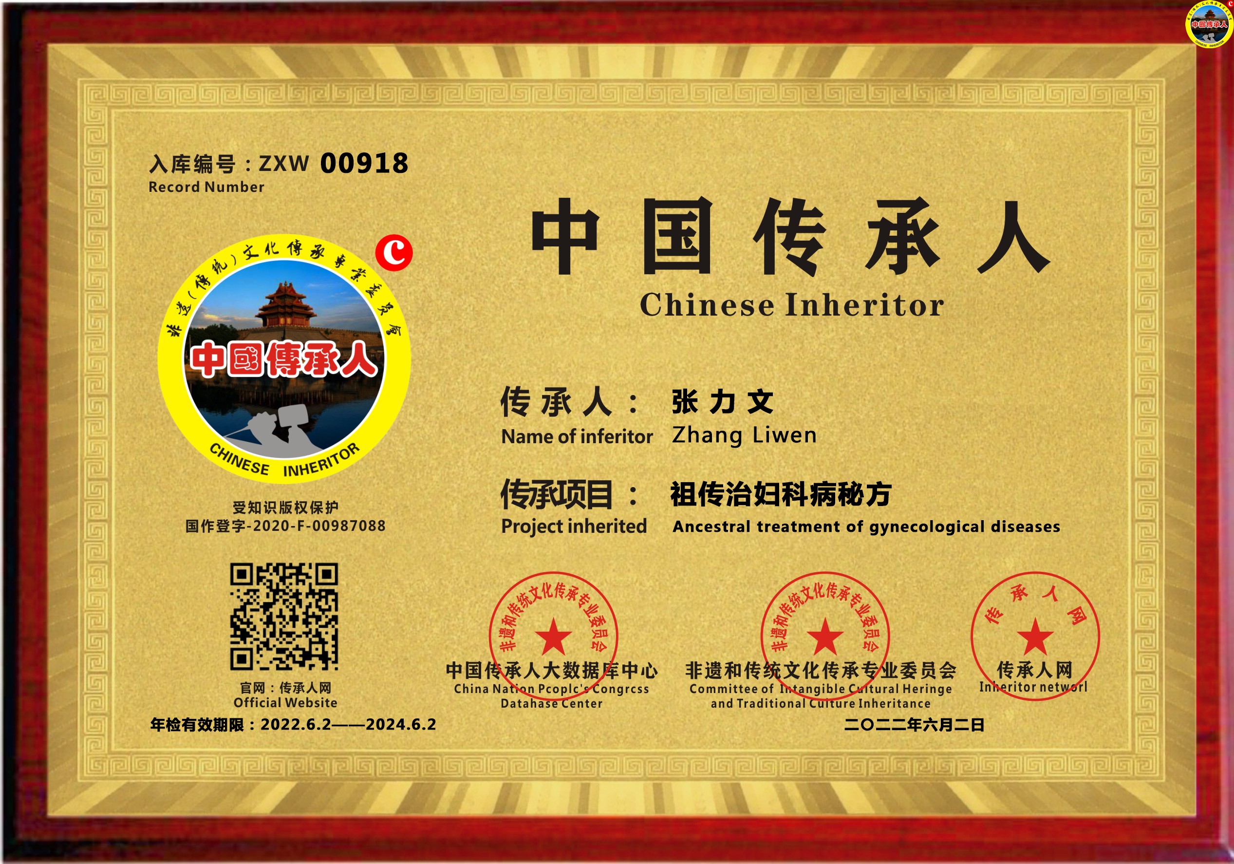 传承人网:2022年6月2日,经中国传承人大数据库中心非遗和传统文化传承专业委员会审核,认为云南省曲靖市张力文同志申报的“祖传治妇科病秘方”具有传承价值,符合申报条件,准许入库传承人网《中国传承·人才智库》,并授权使用受知识产权保护的“中国传承人及图”牌证。