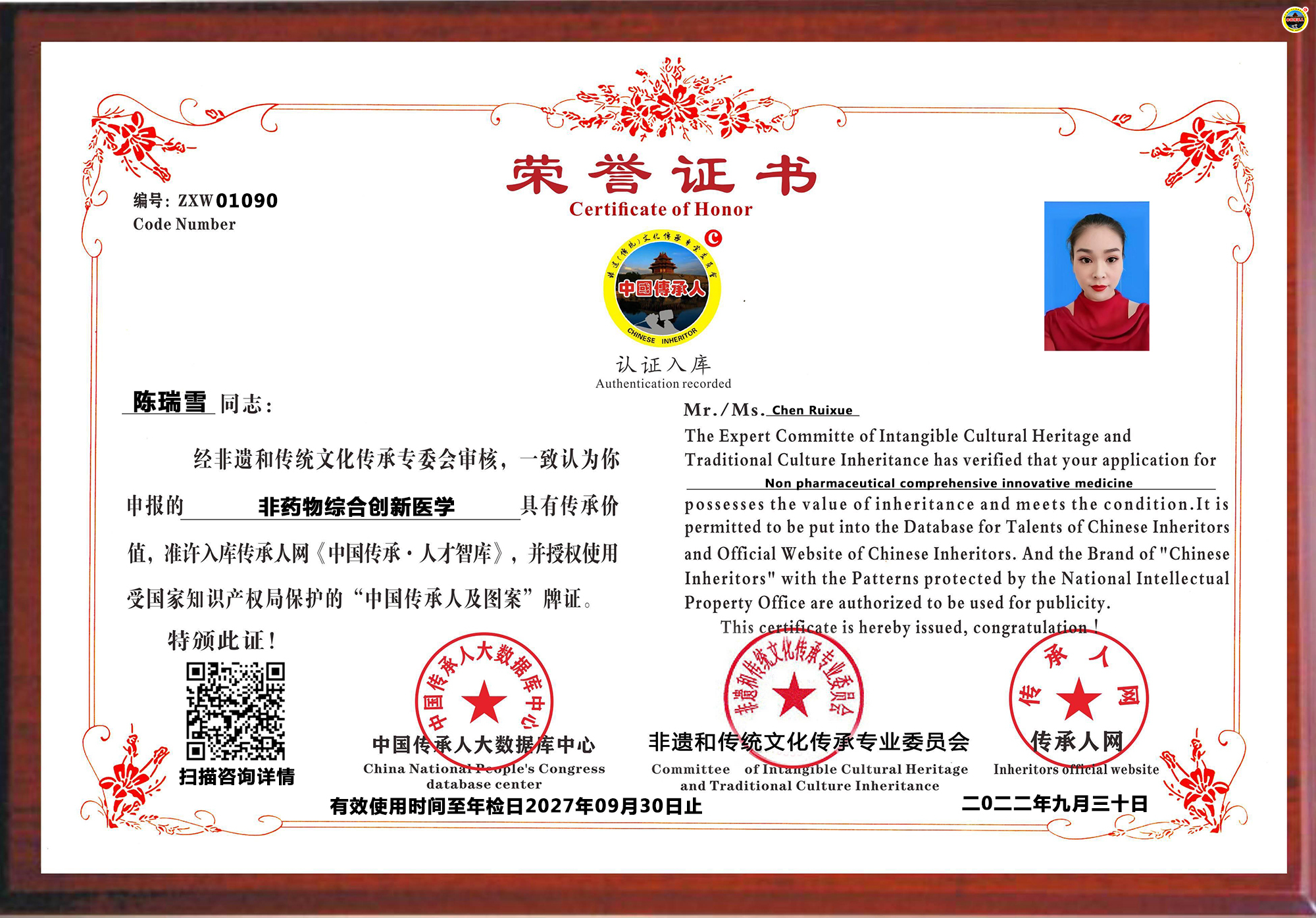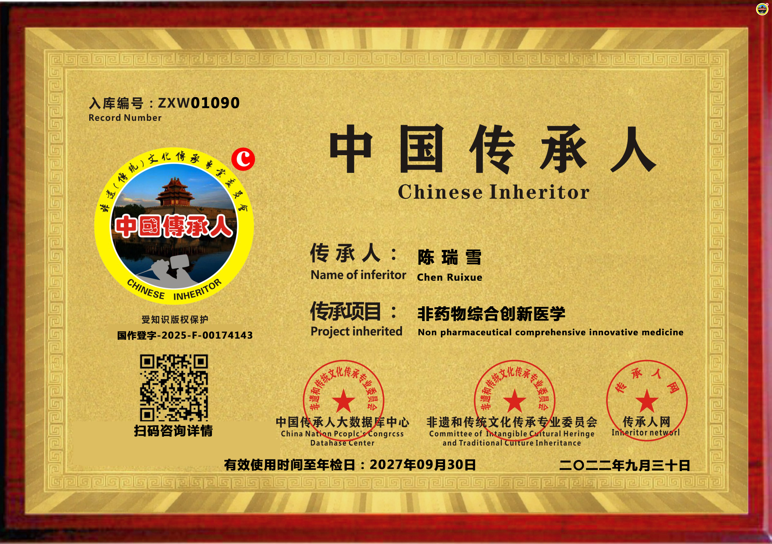 传承人网:2022年10月18日,河南省新乡市陈瑞雪同志申报的“非药物综合创新医学”具有传承价值,准许入库《传承人网·人才智库》。