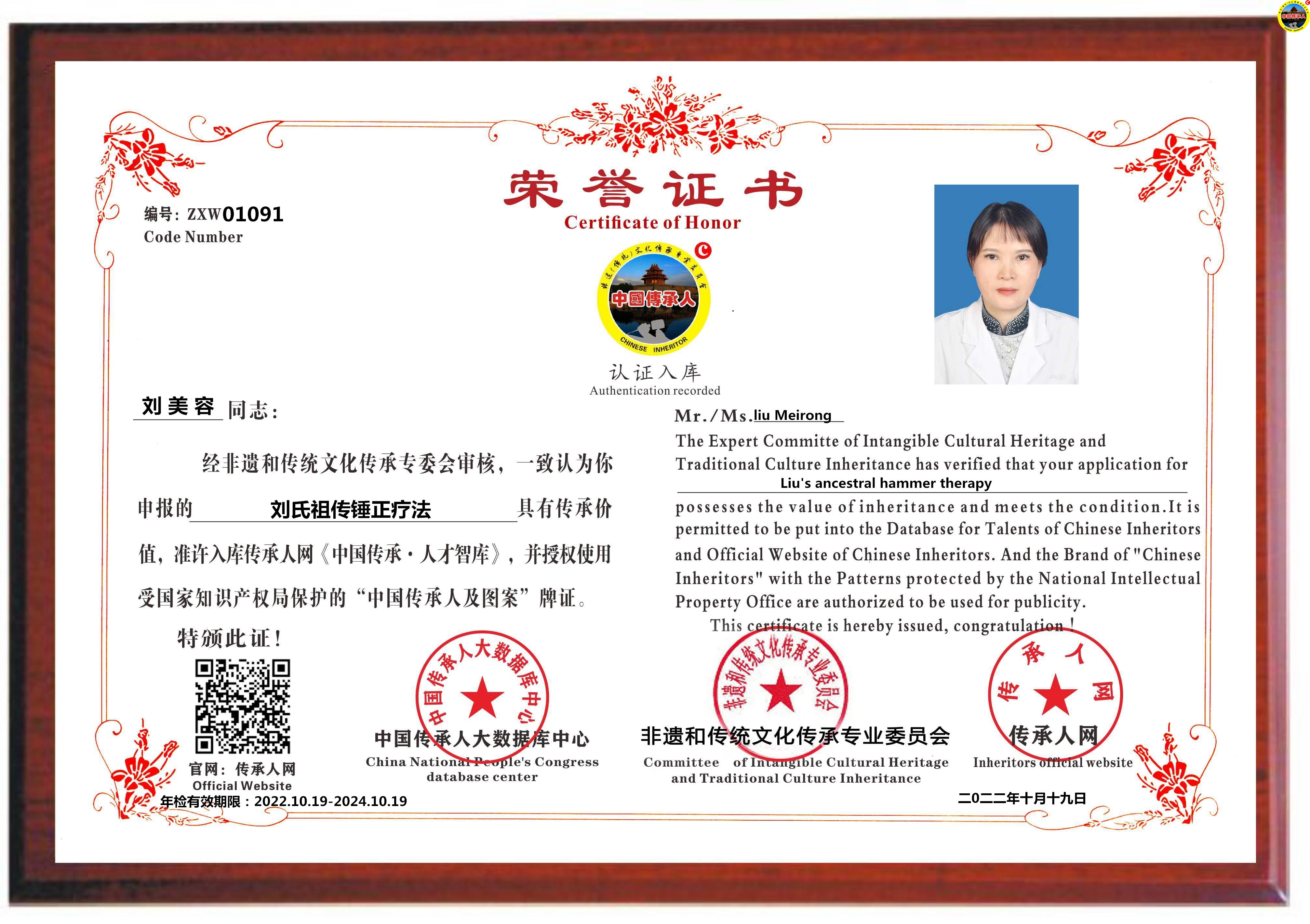 传承人网:2022年10月19日,经中国传承人大数据库中心非遗和传统文化传承专业委员会审核,认为四川省成都市刘美容同志申报的“刘氏祖传锤正疗法”具有传承价值,符合申报条件,准许入库传承人网《中国传承·人才智库》,并授权使用受知识产权保护“中国传承人及图”牌证。