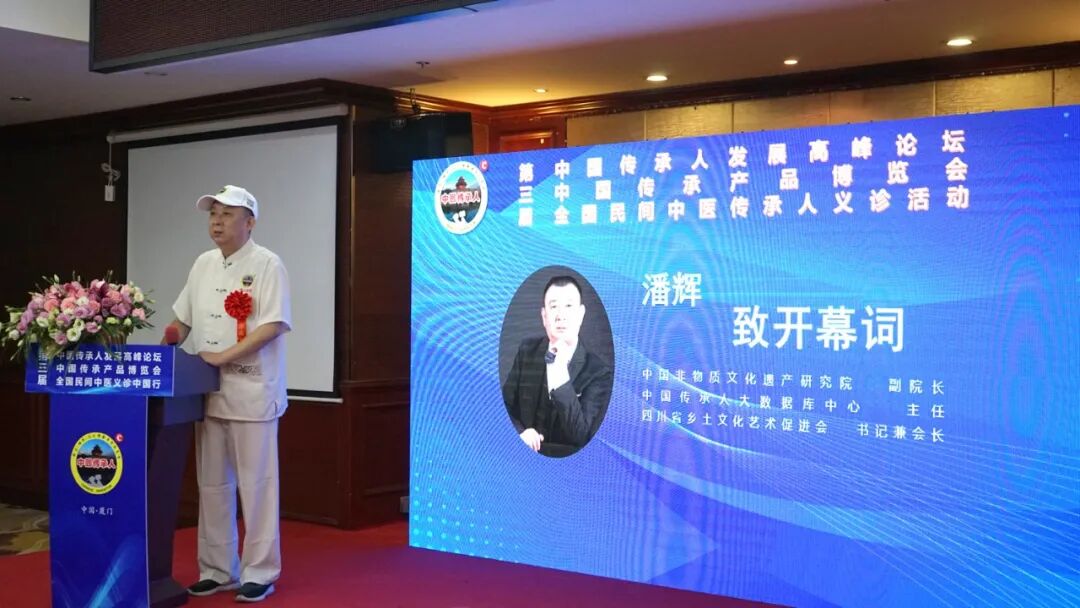 中国传承人大数据库中心主任潘辉上台致开幕词,从做好宣传推广、为传承人包装、发展新业务等多方面展开,全面为传承人荣誉赋能,担当使命,做好传承人事业。