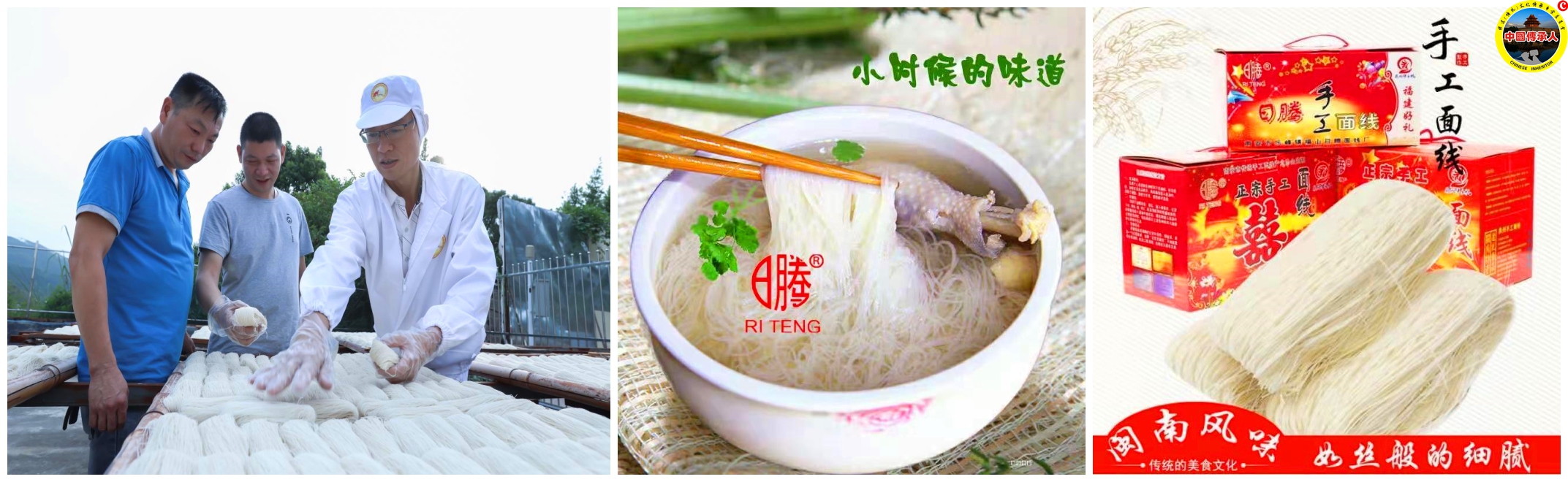 面线制作工艺始于宋朝,至今已经有八百多年历史。面线在闽南又称为“面线”、“面干”, 是闽南民俗文化中象征长寿、吉庆的文化符号。南安市乐峰镇福山日腾面线厂(前身福山日腾手工面线制作铺),始于公元 1899 年。字号“日腾。” 创始人潘乃占(1874 年 4 月---1940 年 7 月),十六岁外出拜师学习手工面线制作工艺(因年代久远师从何人已不可考),习得手工面线制作技艺后,并于 1899 年在自家位于乐峰镇福山村福广 325 号,经营手工面线制作铺。所制作的传统手工面线在南安地区闻名遐迩。 第二代传人潘勇治(师傅潘乃占)1916年7月出生,十八岁开始从事手工面线制作,卒1977年8月。 第三代传人 潘攀贵(师傅潘勇治)1953年10月出生,在面线人家中长大,十三岁开始从事手工面线制作至今,工艺地道,技术精湛。 第四代传人 潘招珊(师傅潘攀贵)1977年09月出生,在面线人家中长大,二十岁开始从事手工面线制作到至今。潘招珊二十多年的制面生涯,致力于研究、保护、传承传统面线制作技艺。并培养传授一批第五代学徒,如潘文水(师傅潘招珊) 、郑明哲(师傅潘招珊)、潘鸿先(师傅潘招珊)、潘文春(师 傅潘招珊)等。