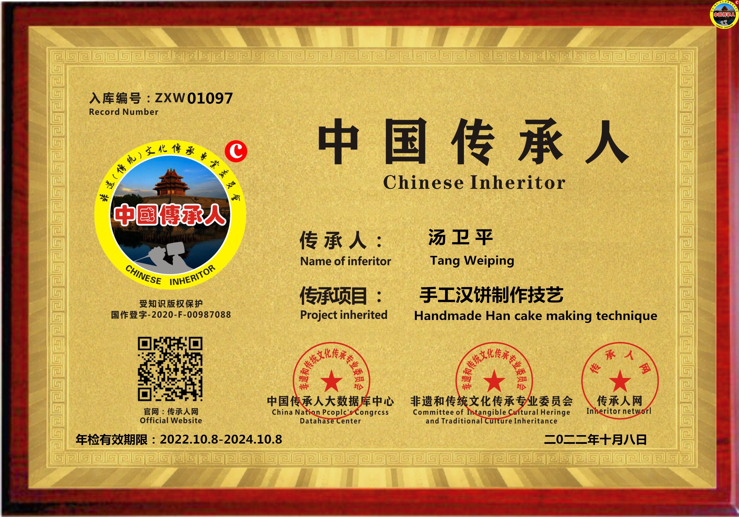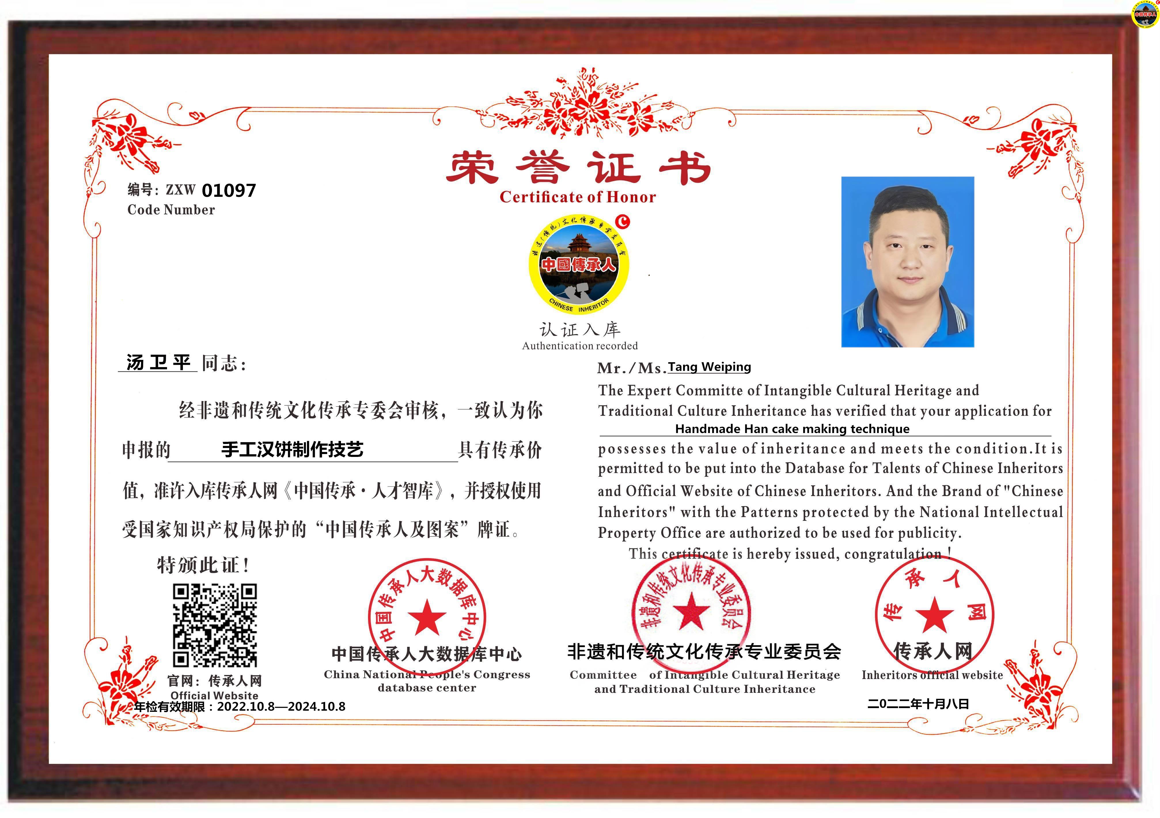 传承人网:2022年11月14日,经中国传承人大数据库中心非遗和传统文化传承专业委员会审核,认为江西省汤卫平同志申报的“手工汉饼制作技艺”具有传承价值,符合申报条件,准许入库传承人网《中国传承·人才智库》,并授权使用受知识产权保护“中国传承人及图”牌证。