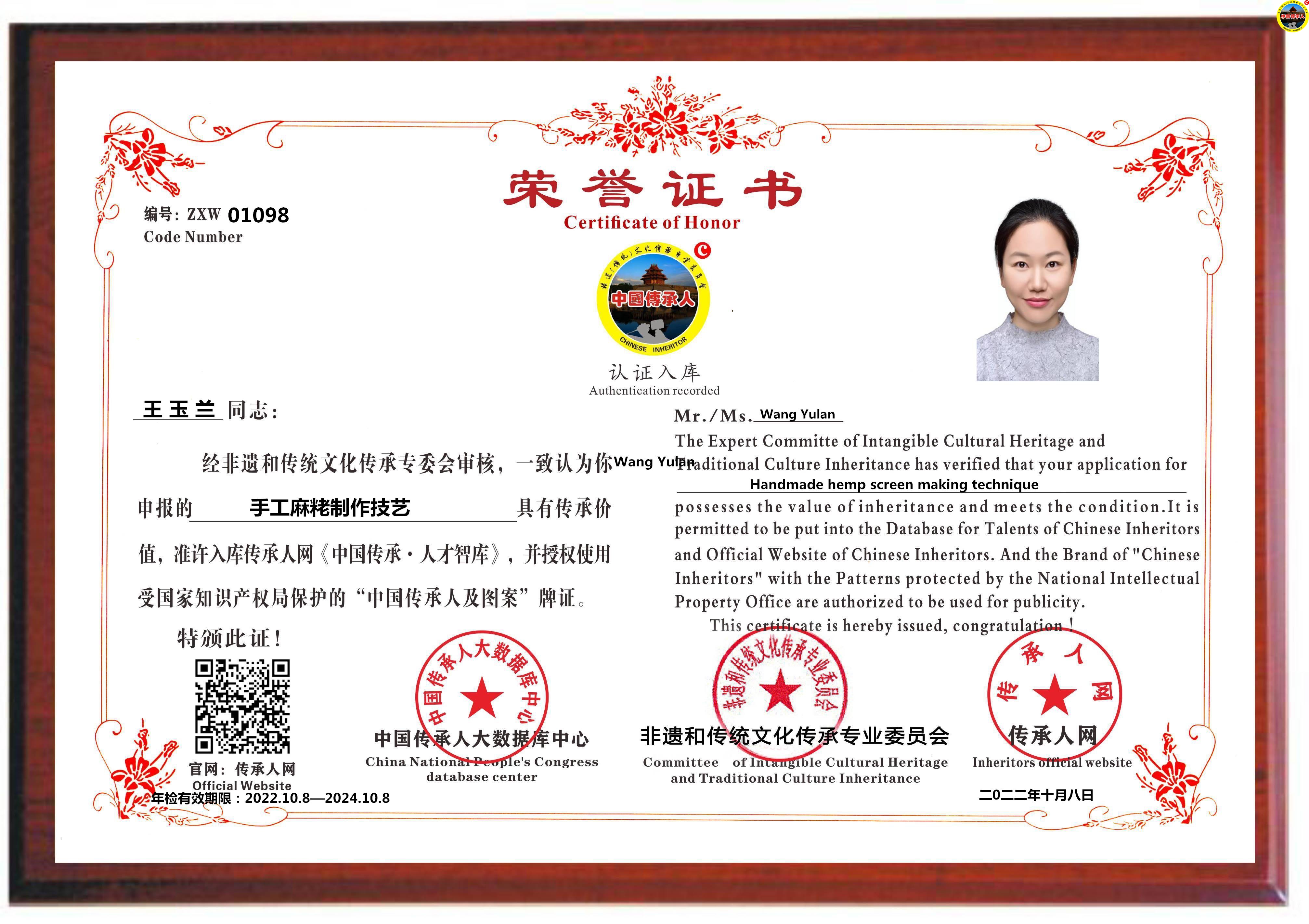 传承人网:2022年10月24日,经中国传承人大数据库中心非遗和传统文化传承专业委员会审核,认为福建省泉州市王玉兰同志申报的“手工麻粩制作技艺”具有传承价值,符合申报条件,准许入库传承人网《中国传承·人才智库》,并授权使用受知识产权保护“中国传承人及图”牌证。