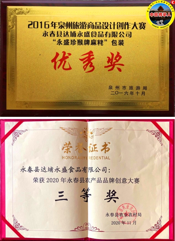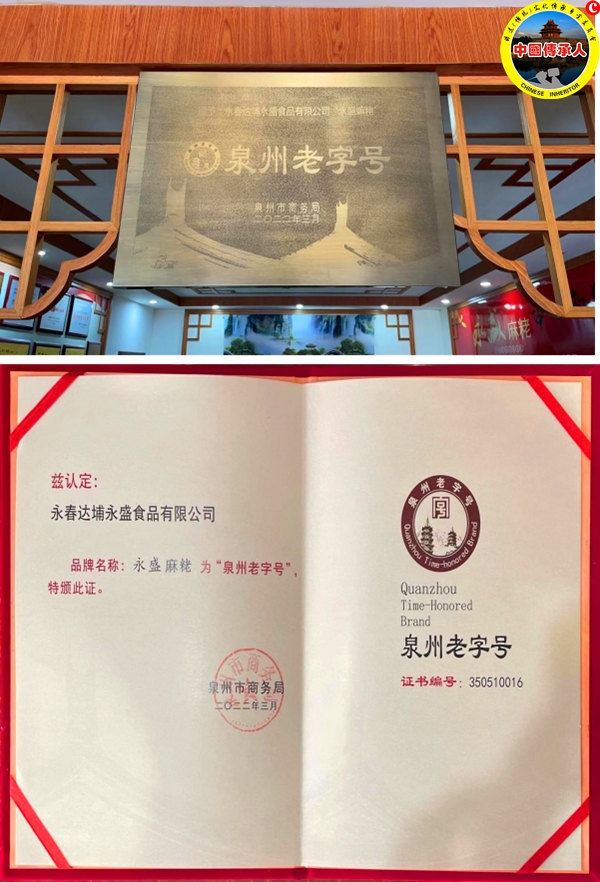“永盛”字号持续使用,从未中断,使这个半个多世纪的老牌老店焕发活力。多年来,永盛食品公司坚持质量第一、信誉第一的经营理念,2010年公司通过国家“QS”认证,2014年通过环境安全管理体系认证和职业健康安全管理体系认证,2016 年被县政府授予“守合同、重信用”,2019年被泉州市农业农村局、泉州市财政局授予“市 级重点龙头企业”,2022年3月,被泉州商务局授予“泉州老字号”。公司生产的永盛麻粩先后荣获中国麻粩行业十佳品牌、中华特色小吃、清新福建旅游好商品、泉州特色伴手礼、永春十佳名小吃等荣誉。