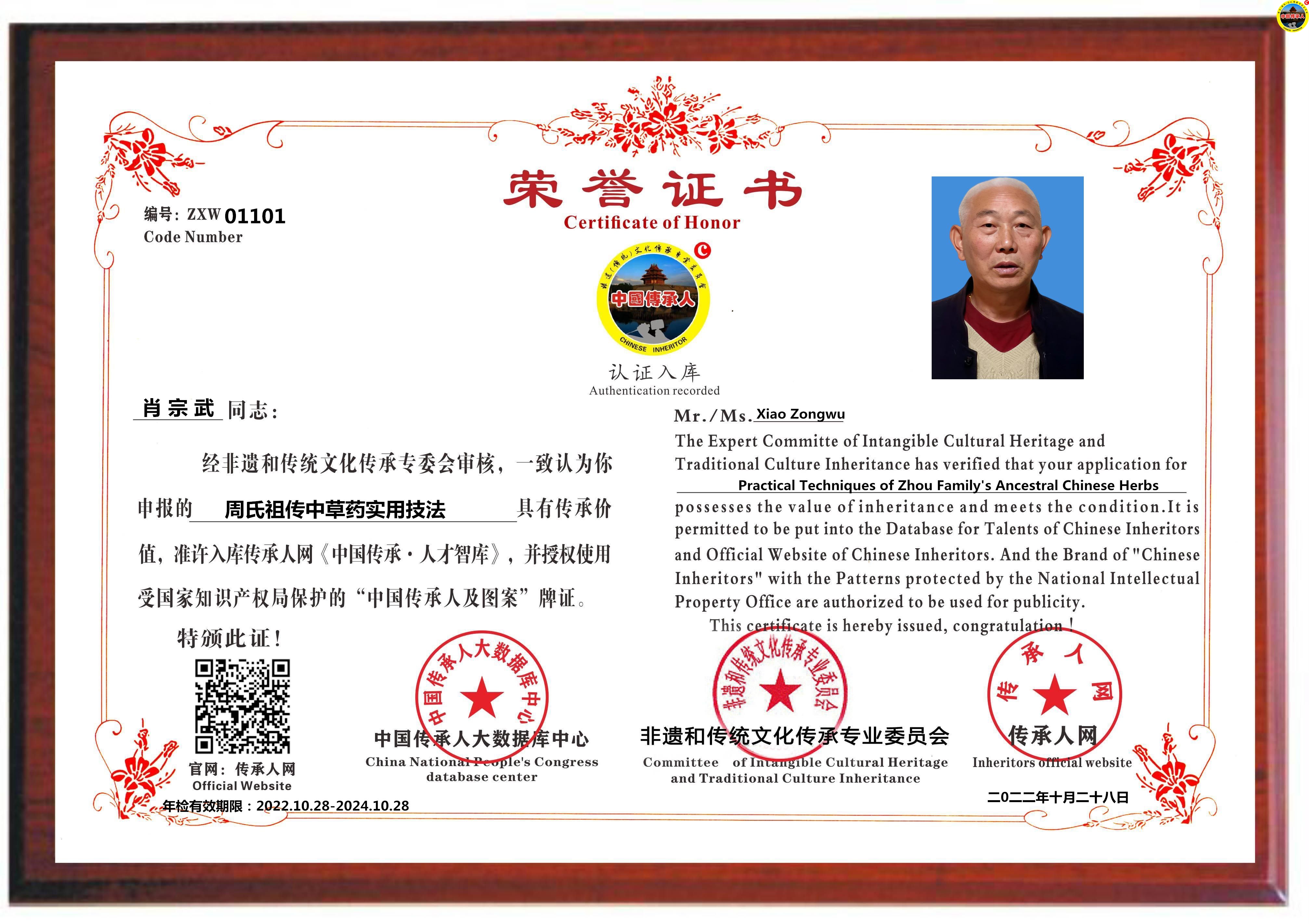 传承人网:2022年10月26日,经中国传承人大数据库中心非遗和传统文化传承专业委员会审核,认为重庆市肖宗武同志申报的“周氏祖传中草药实用技法”具有传承价值,符合申报条件,准许入库传承人网《中国传承·人才智库》,并授权使用受知识产权保护“中国传承人及图”牌证。