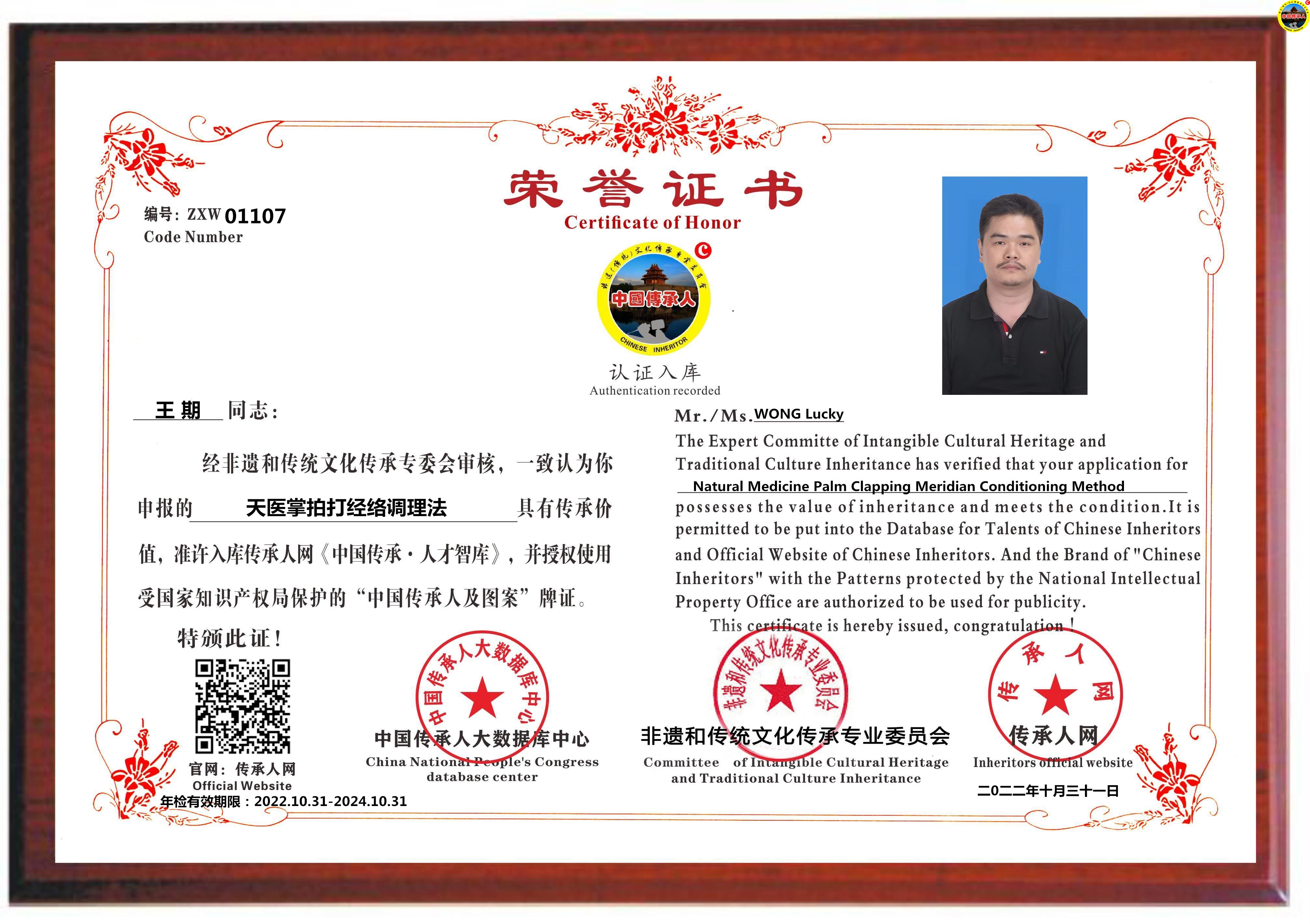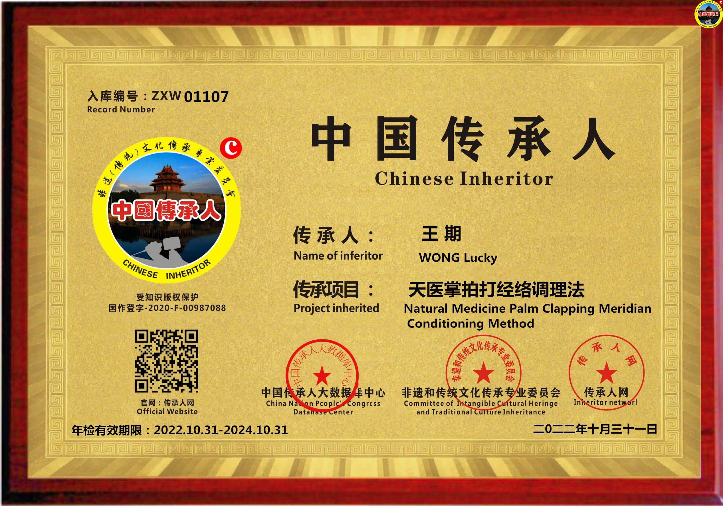 传承人网:2022年11月03日,经中国传承人大数据库中心非遗和传统文化传承专业委员会审核,认为中国香港王期同志申报的“天医掌拍打经络调理法”具有传承价值,符合申报条件,准许入库传承人网《中国传承·人才智库》,并授权使用受知识产权保护“中国传承人及图”牌证。