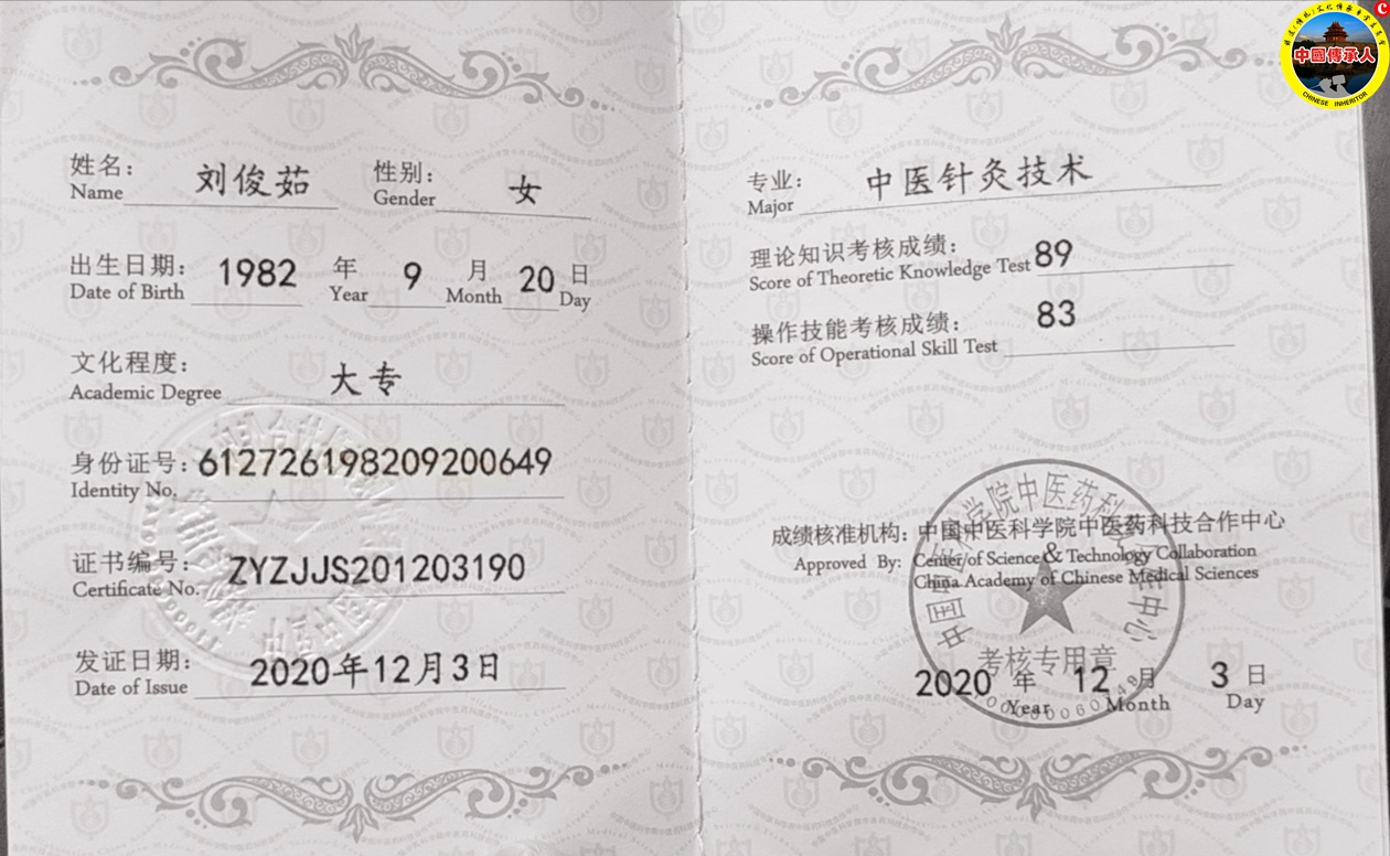 2000年起全面继承家学后,之后二十年,刘俊茹不断钻研和四处进修学习,2001年起六年内在北京中医药研究院多次学习,参加华夏中医针灸培训学习两年,2013年学习董氏奇穴和刺血疗法,2017年到武当山跟随杨建中师傅学习道家针法,2019年学习了中医古典针灸疗法,2021年在西安参加培训学习灵枢易针八字疗法和八卦脐针法,采众家之长创立了几种新的针法加入祖传点刺疗法,也提升了针刺手法、辩证的临床能力。