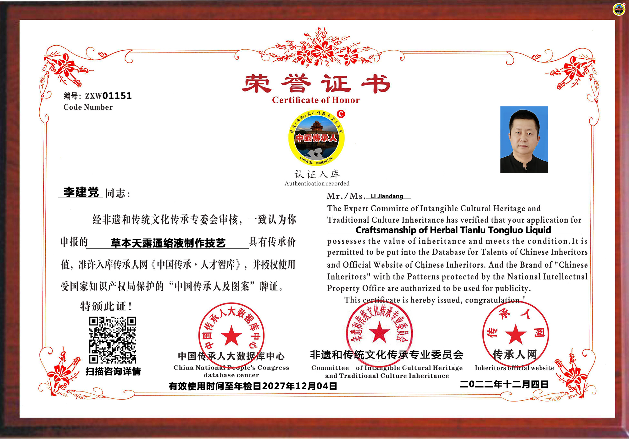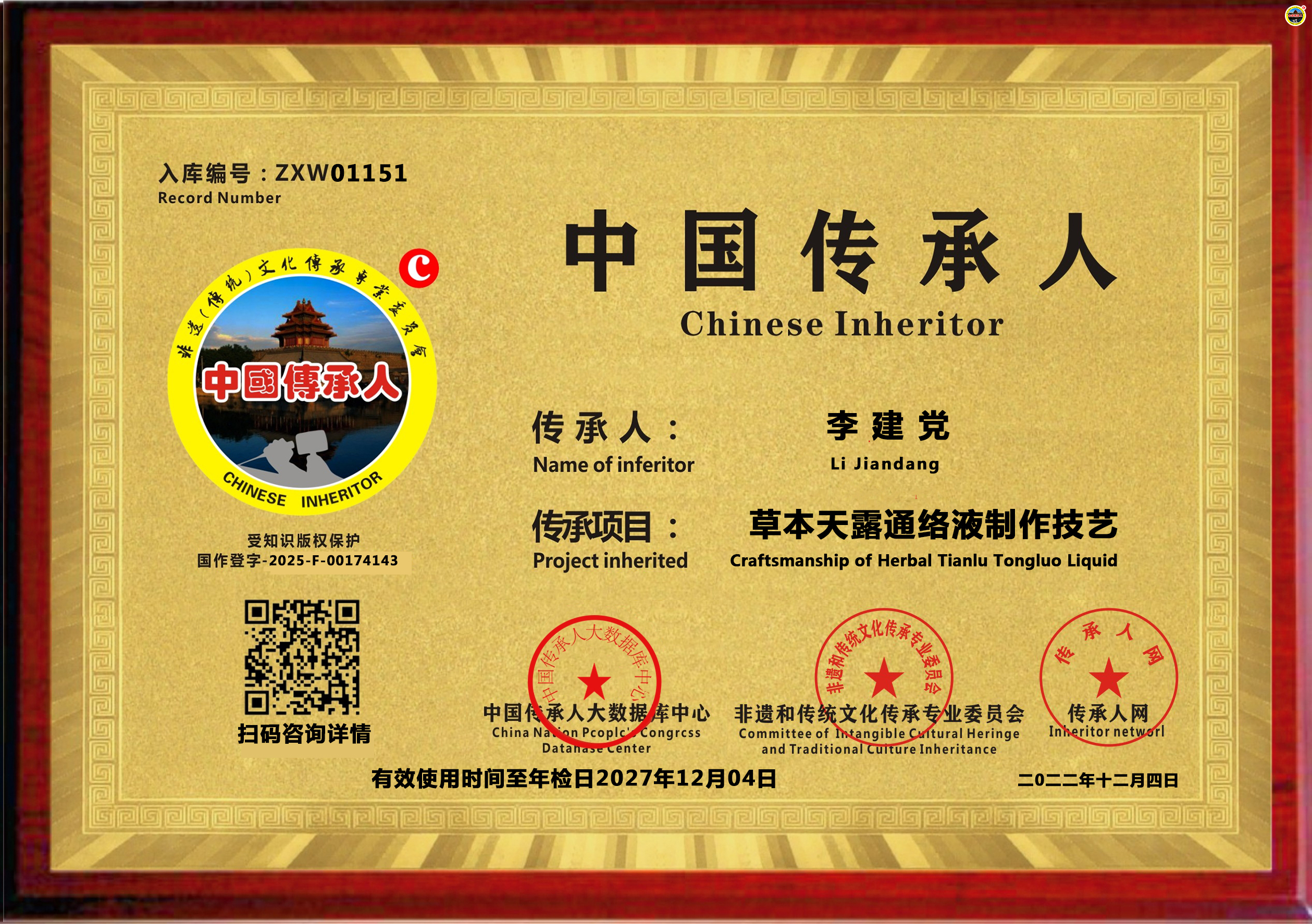草本天露通络液是李建党先生传承祖辈之独家绝密配方研制而成,该秘方是祖辈自明朝时期传至今日,采用全蝎蜈蚣,筋骨豆,红花川乌,透骨草等多种名贵中药,以传统土法浸泡而成,本产品通过外部揉擦,使其穿透筋骨并直捣病灶,把长期遗留在骨骼肌肤里的风,寒,湿,毒,淤排泄出来。具有活血化瘀,化痰,使骨质再生,疏通血脉,溶解血栓,修复神经,强壮筋骨,等作用。