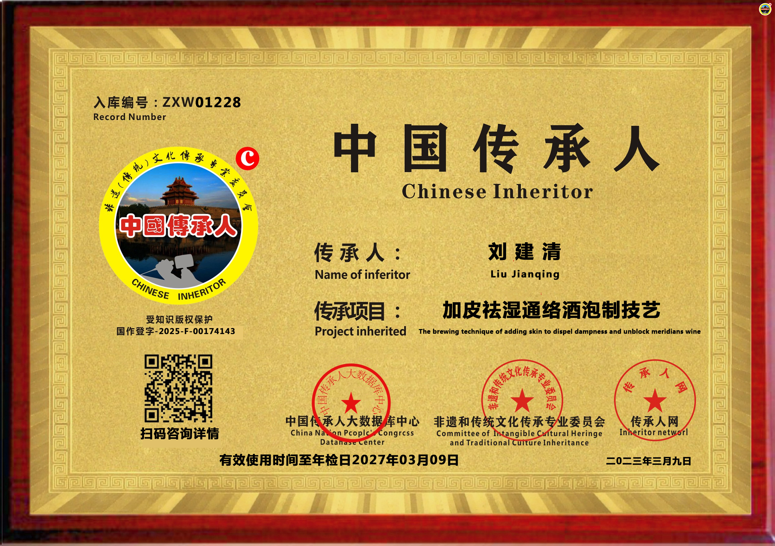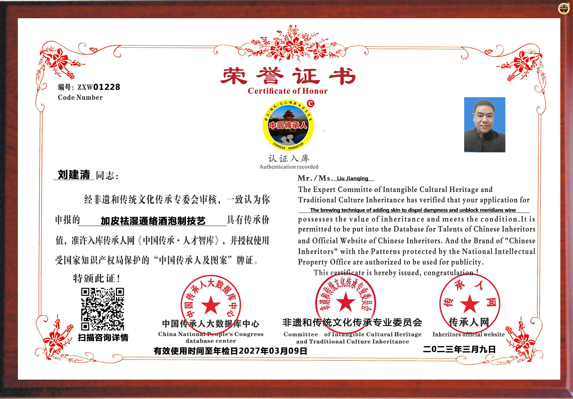传承人网:2023年3月14日,湖南省娄底市刘建清同志申报的“加皮祛湿通络酒泡制技艺”具有传承价值,准许入库传承人网《中国传承·人才智库》,并授权使用受国家知识产权局保护的“中国传承人及图”牌证。