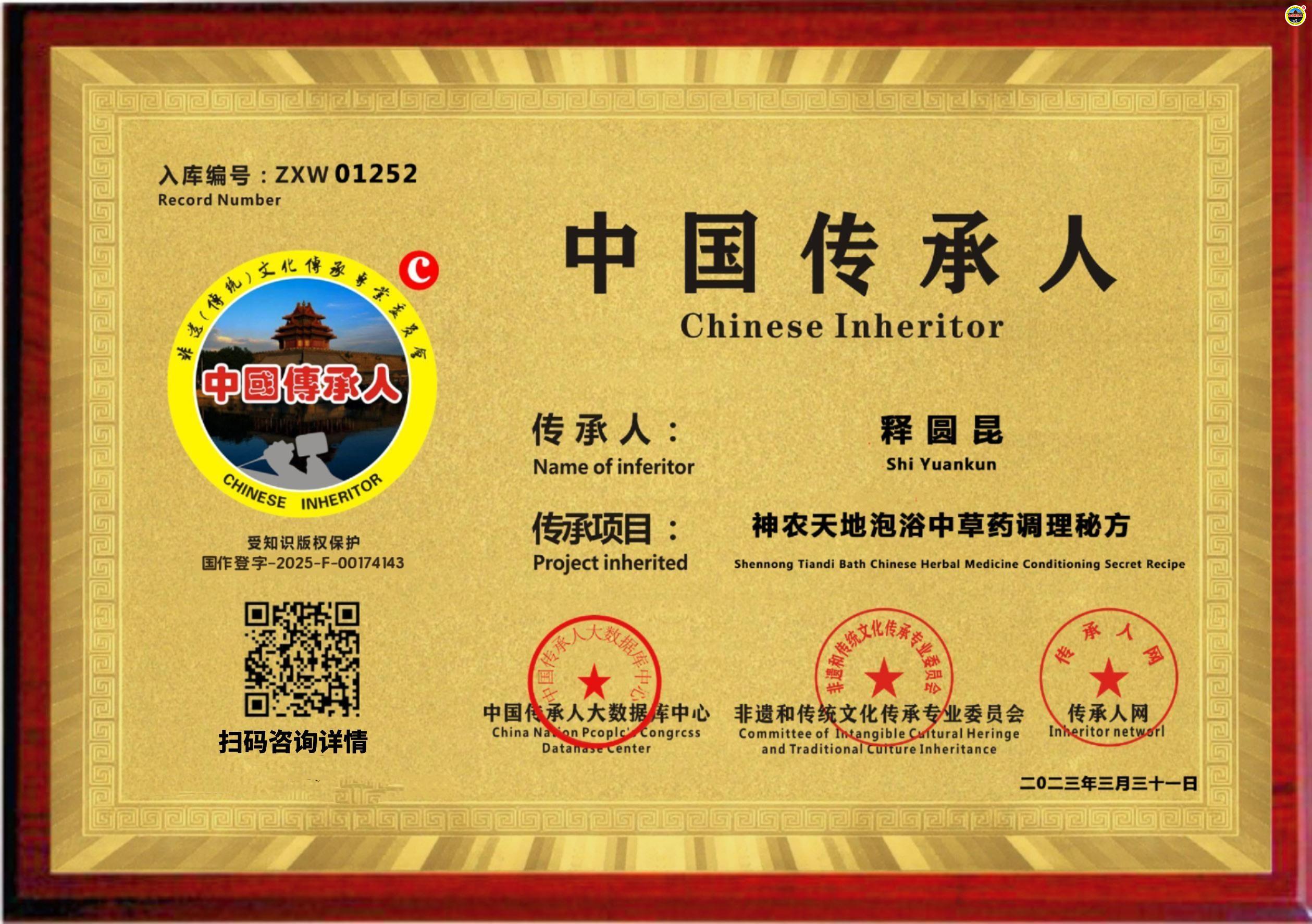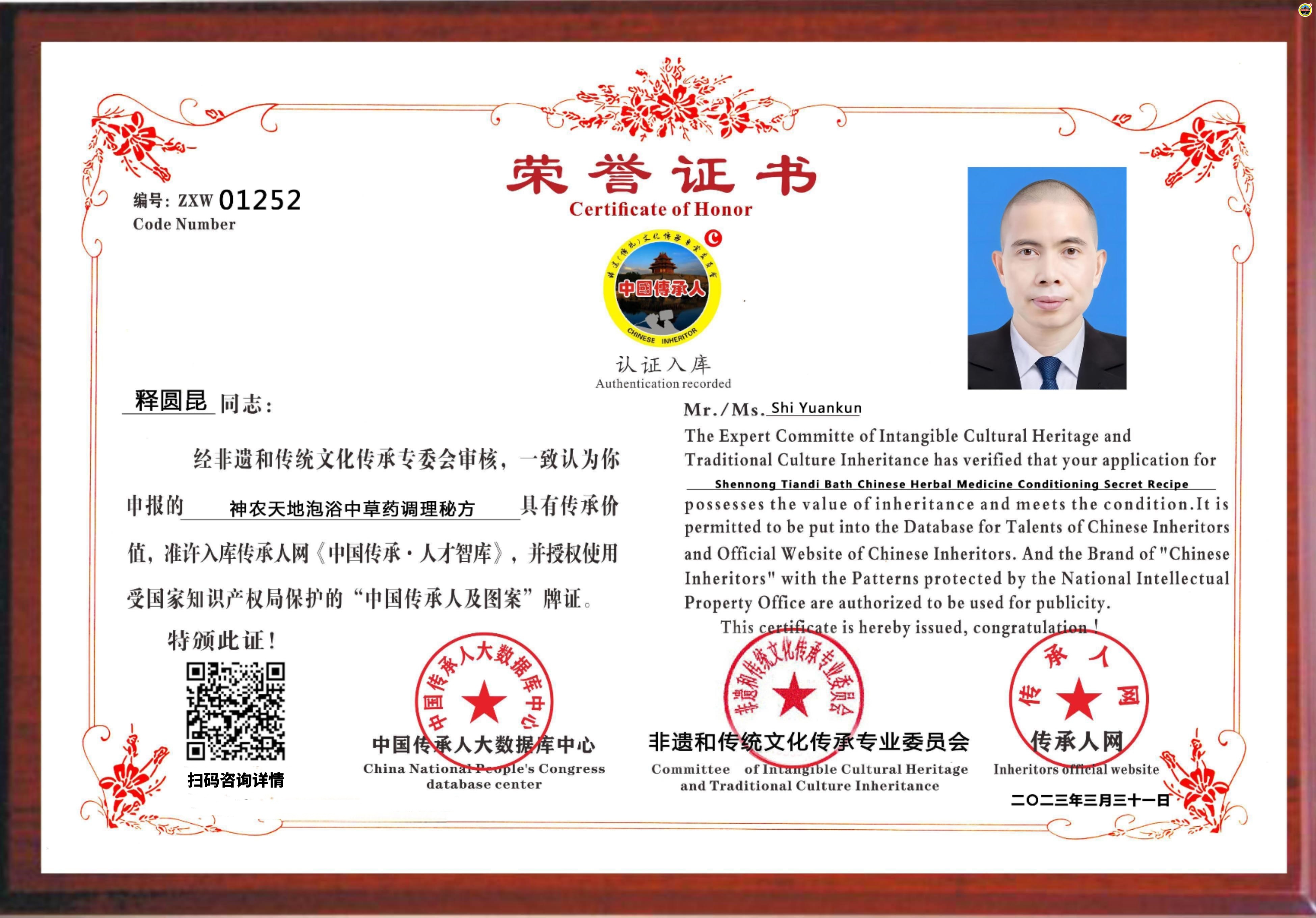 传承人网:2023年04月19日,经中国传承人大数据库中心非遗和传统文化传承专业委员会审核,认为广西南宁市释圆昆同志申报的“神农天地泡浴中草药调理秘方”具有传承价值,符合申报条件,准许入库传承人网《中国传承·人才智库》,并授权使用受知识产权保护“中国传承人及图”牌证。