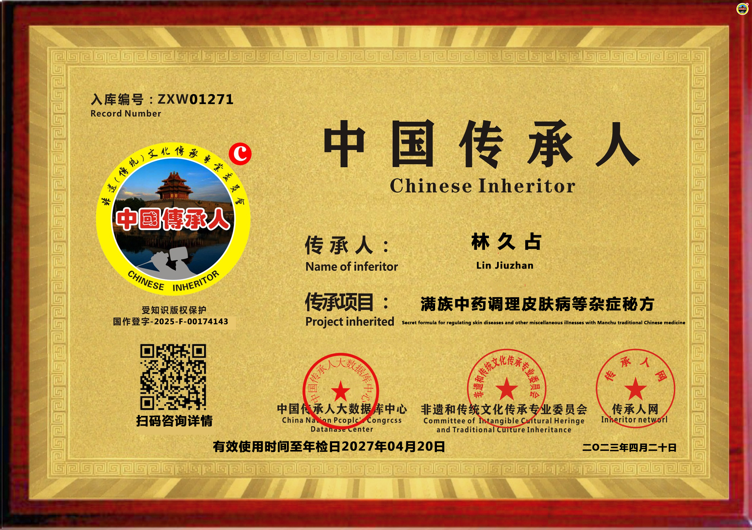 据了解,林久占1963年4月生人,出生在吉林省舒兰市,生活在长春市、武汉市,大专学历,工程师职称。林家祖辈林尚信为山东栖霞东荆夼林氏闯关东第一人,林氏族人凭借着酿酒手艺创办酒坊在吉林省舒兰县申屯扎根。后代学习医理,悬壶济世,后又开办药铺,更有林氏皮肤、骨伤膏药传承至今。林久占在大学毕业后,从事医药行业近30年,在工作中不断学习中医知识,在生活中学习家族传承秘方和技术。通过实践提升自己的技术,掌握传承了林氏皮肤骨伤膏药秘方、满族中药调理皮肤病等杂症秘方、药膳食疗技术等,并获得了中医健康管理师证(高级)、中医预防保健调理技术推广与应用培训等证书。
