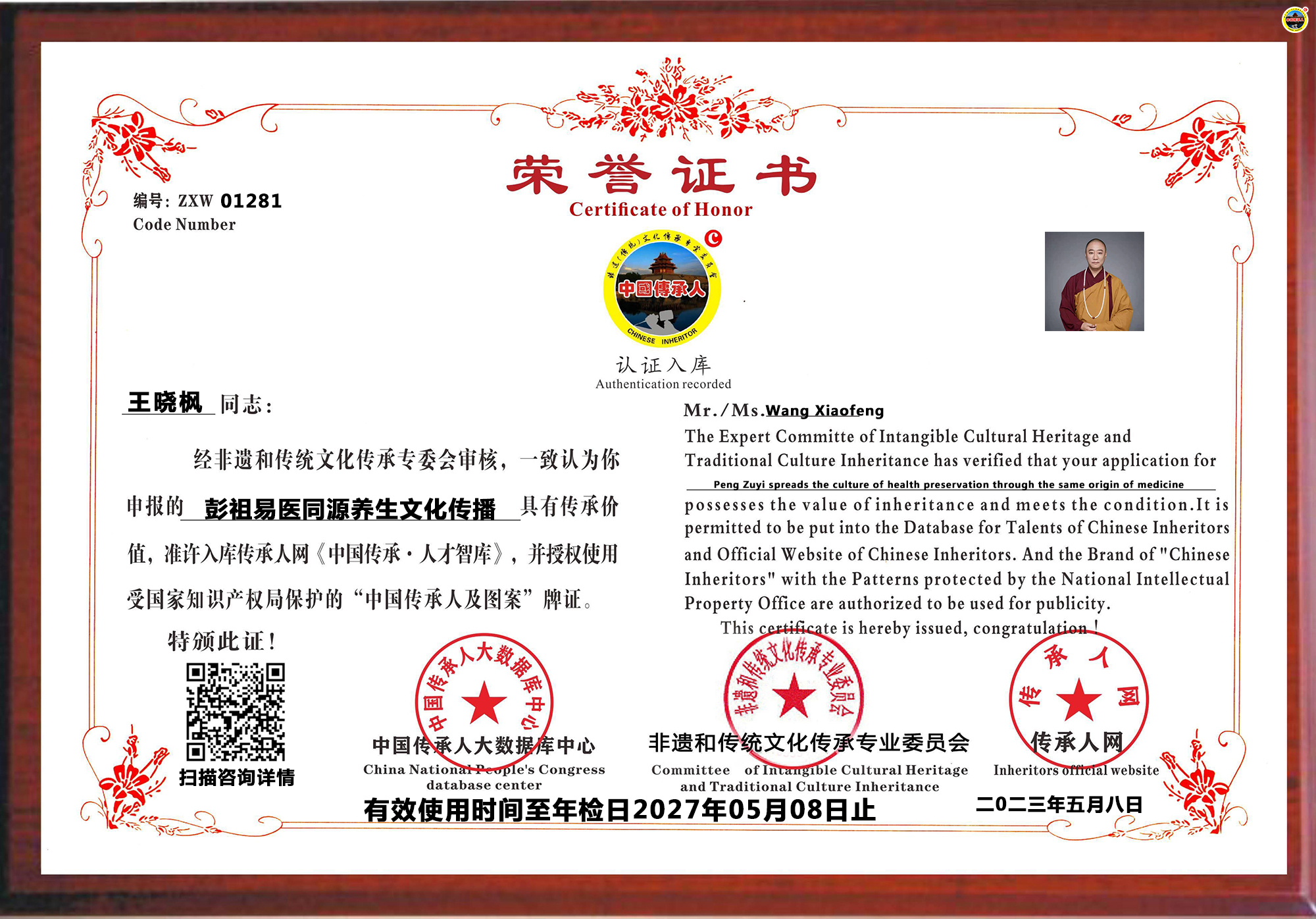 王晓枫19岁开始佛道双修,是世界佛教协会会长“上悟下静”法师传承弟子,多年参悟佛学要义,潜修唐密法脉,取得阿阇梨位。太极五行文化学院院长闫玉华入室弟子,有着二十多年的风水实战经验,编辑出版《中国风水百科》、《书画风水》、《命理五行学》、《五行与现代企业管理》等书。道教先驱彭祖上医唯一外姓传承人,得到彭祖后裔彭治青真传,在彭祖寿经膳食术、导引术、补导术、调摄术、房中术的基础上,不懈追求创新,更有效的提高了人们的生活质量。
