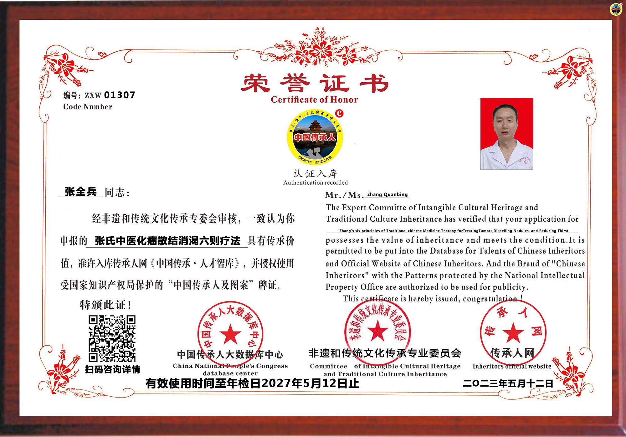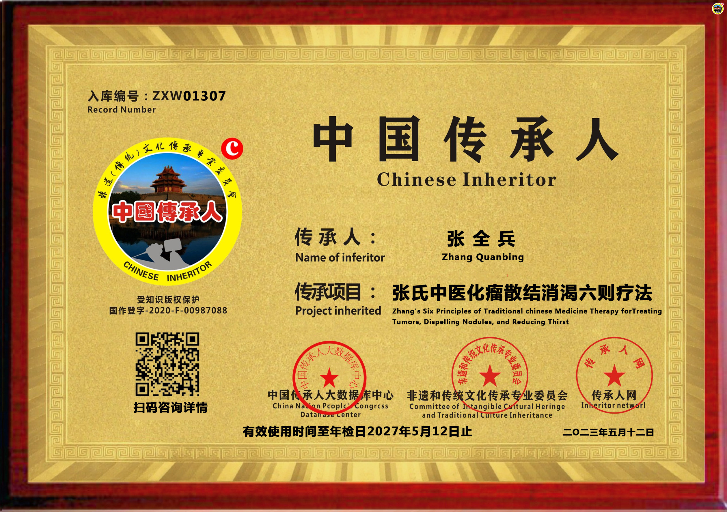张全兵是张氏中医第七代传承人,现为阆中市天宫镇卫生院中医内科骨干医师。他出生于中医世家,自幼受中医世家文化熏陶,习医治病,尽得家传。13岁随父学医,有四十多年从医经验,授徒8人。经过长期临床的实践和苦心钻研,继承和发扬了张氏中医在伤寒、温病、风湿、消渴、等方面的辩证施治,总结形成了完整的“六则疗法”治疗体系和张氏中医药学。(六则疗法即扶正培本法、清热养阴法、活血化瘀法、软坚散结法、行气消积法、降逆化痰法)。