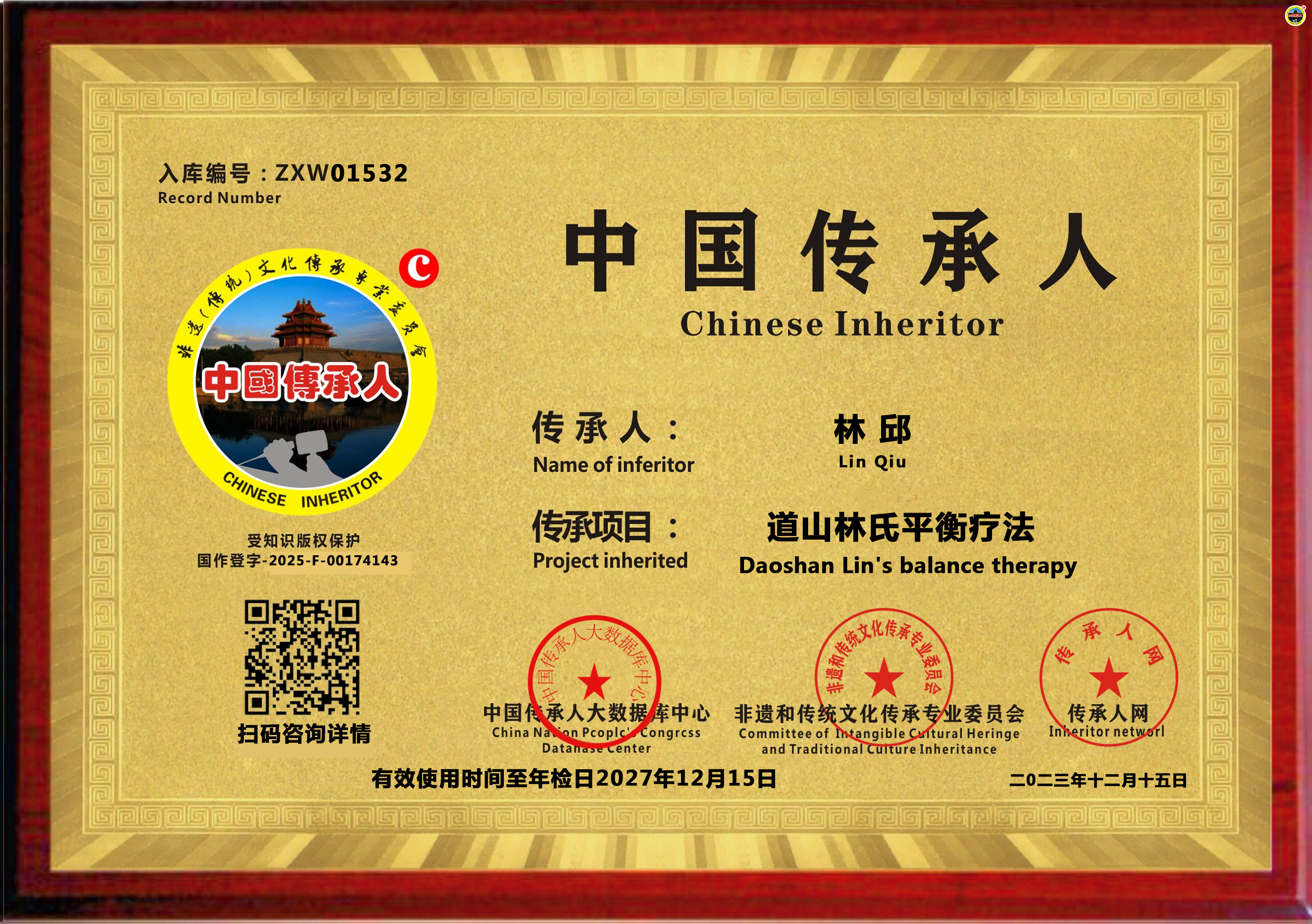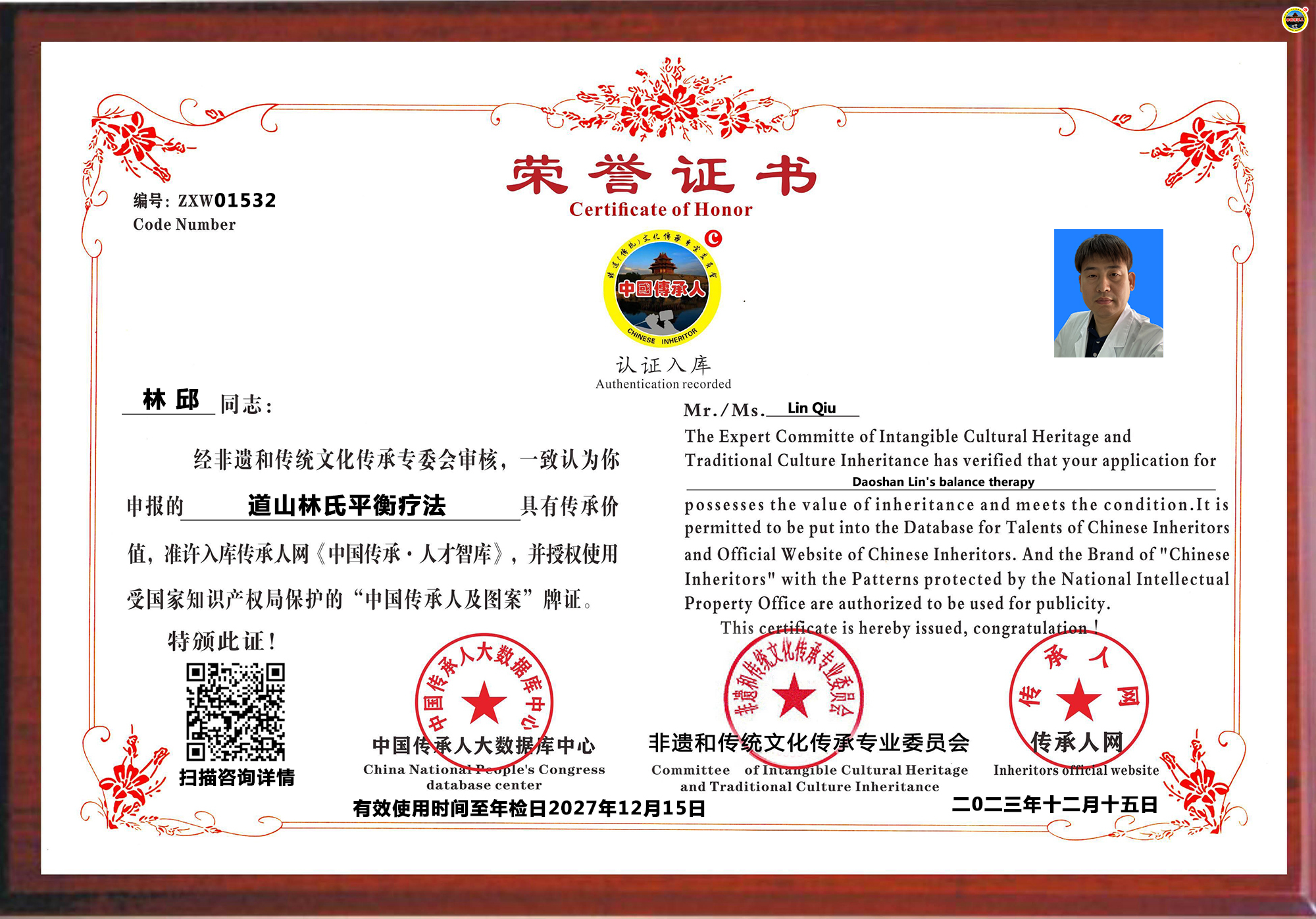 传承人网:2023年12月29日,福建省福州市林邱同志申报的“道山林氏平衡疗法”具有传承价值,准许入库传承人网《中国传承·人才智库》,并授权使用受知识产权保护“中国传承人及图”牌证。