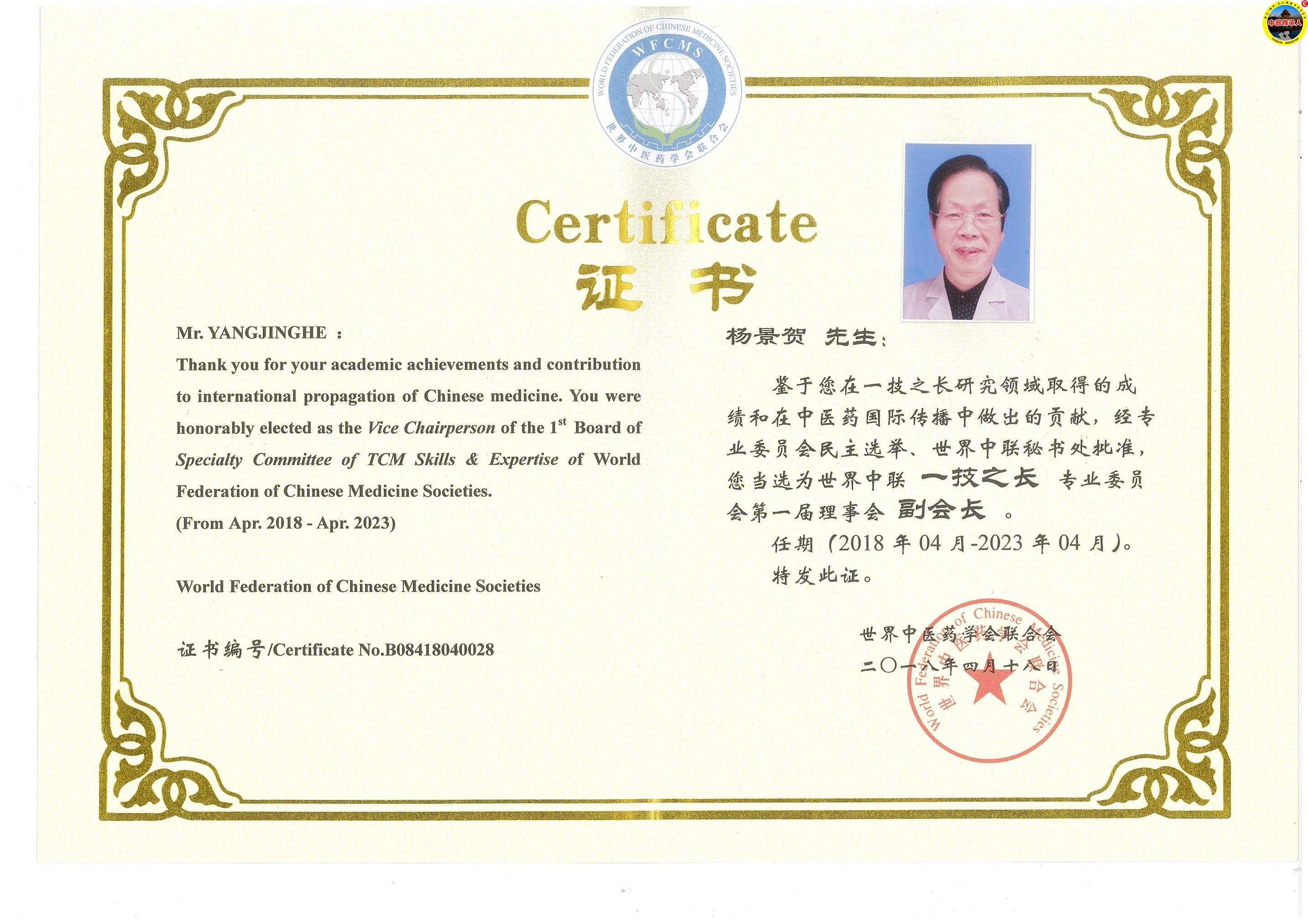 2014年因医术精湛,受任中国民族卫生协会难治病研究专家委员会委员,个人档案被中国民族卫生协会收录进官网;2015年与全国爱国拥军万里行华南行组委会深入军区海军某部为官兵义诊,并赠送一批珍贵治疗药品,受到基层官兵的热烈欢迎。对此,《中国网》《中国社会报》《社会与公益杂志》等各大媒体均做了报道;2015应邀参加中国国际中医药大健康博览会举办的“身边的妙手神医”活动,获"中医民间圣手"荣誉称号;2016年应邀参加中国研究型医院学会移动医疗专业委员会专项研讨会,为中国移动医疗的发展出谋划策;2017年被聘为中国茶疗养生产业技术创新战略联盟专家,并在大会为中国茶疗养生文化的发展建言献策;2018年参加世界中医药学会联合会一技之长专业委员会成立大会暨第一届学术会议,受任世界中医药学会联合会一技之长专业委员会副会长,并接受央视采访;2022年书籍《世界医学革命》中收录杨景贺关于癌症食疗调理的研究理论;2022年个人档案收录进国医网;2022年,受任中国管理科学研究院经济发展研究中心客座教授;2022年,成为中国抗癌协会研究员。
