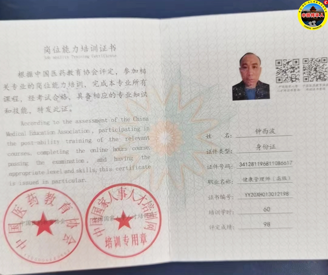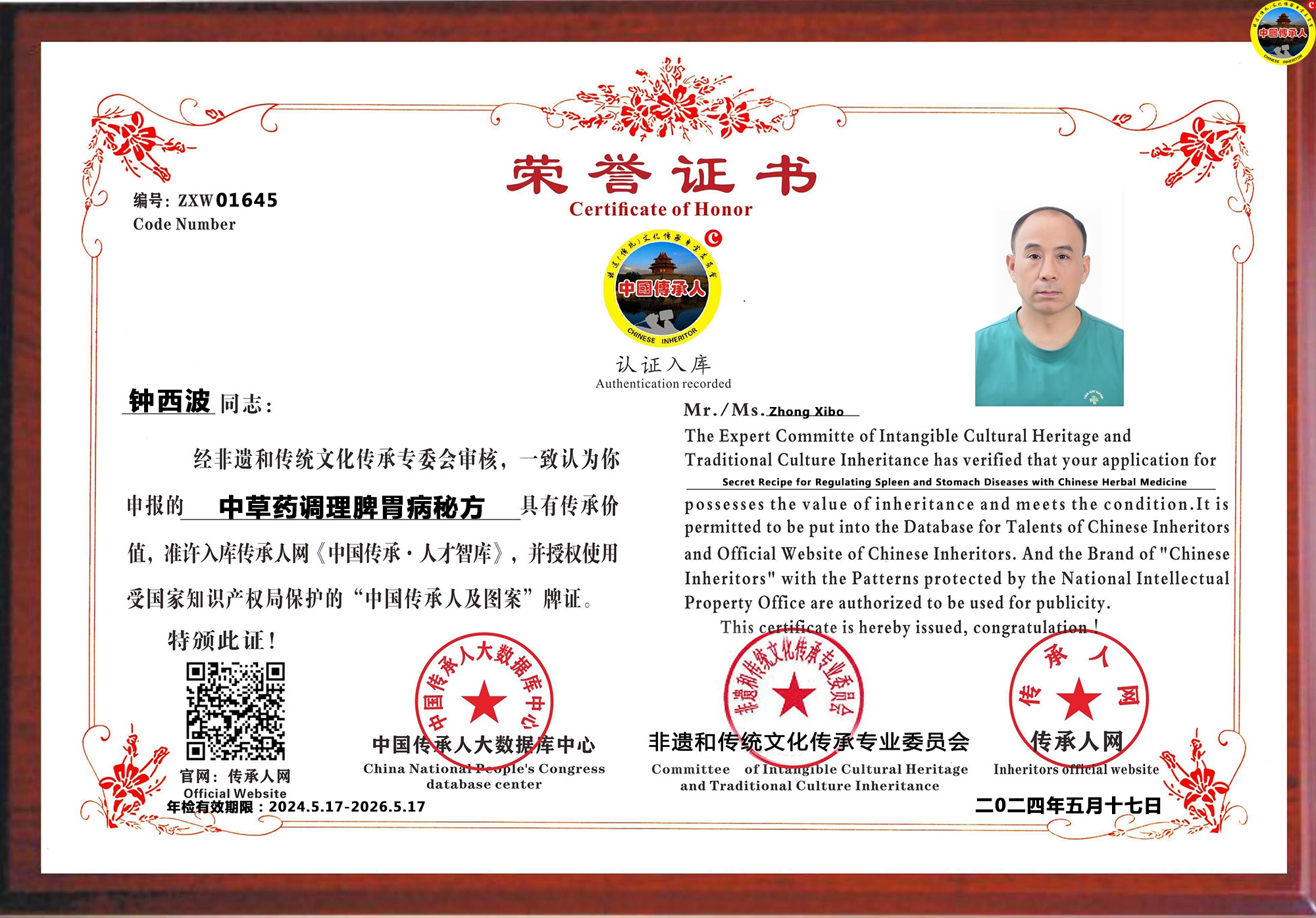 从小在外祖父的熏陶下,他不仅学习了丰富的中医药知识,还亲身体验了中医的博大精深。作为全通升降脾胃论调理脾胃病的第四代传承人,钟西波肩负着重要的使命和责任。中医药学作为中华民族的传统瑰宝,需要更多的人去传承和发扬。他不仅继承了外祖父的祖传秘方和治疗方法,还通过不断的学习和实践,将这些知识运用到实际的临床治疗中,帮助更多的患者恢复健康,得到了广大市民群众的认可。他对全通升降脾胃论中草药调理妇科秘方的配方、制药方法、选材制作、步骤程序、医治方法集聚于心,能继承外祖父祖传秘方这一集数代先辈智慧医治方法及经验之大乘,以其外祖父为榜样,不辞劳苦,鞠躬尽瘁,医者仁心,传承和发扬全通升降脾胃论调理秘方。为传统的中医药发展贡献微薄之力,为人民幸福、社会和谐,民族振兴,国泰民安尽一分力。