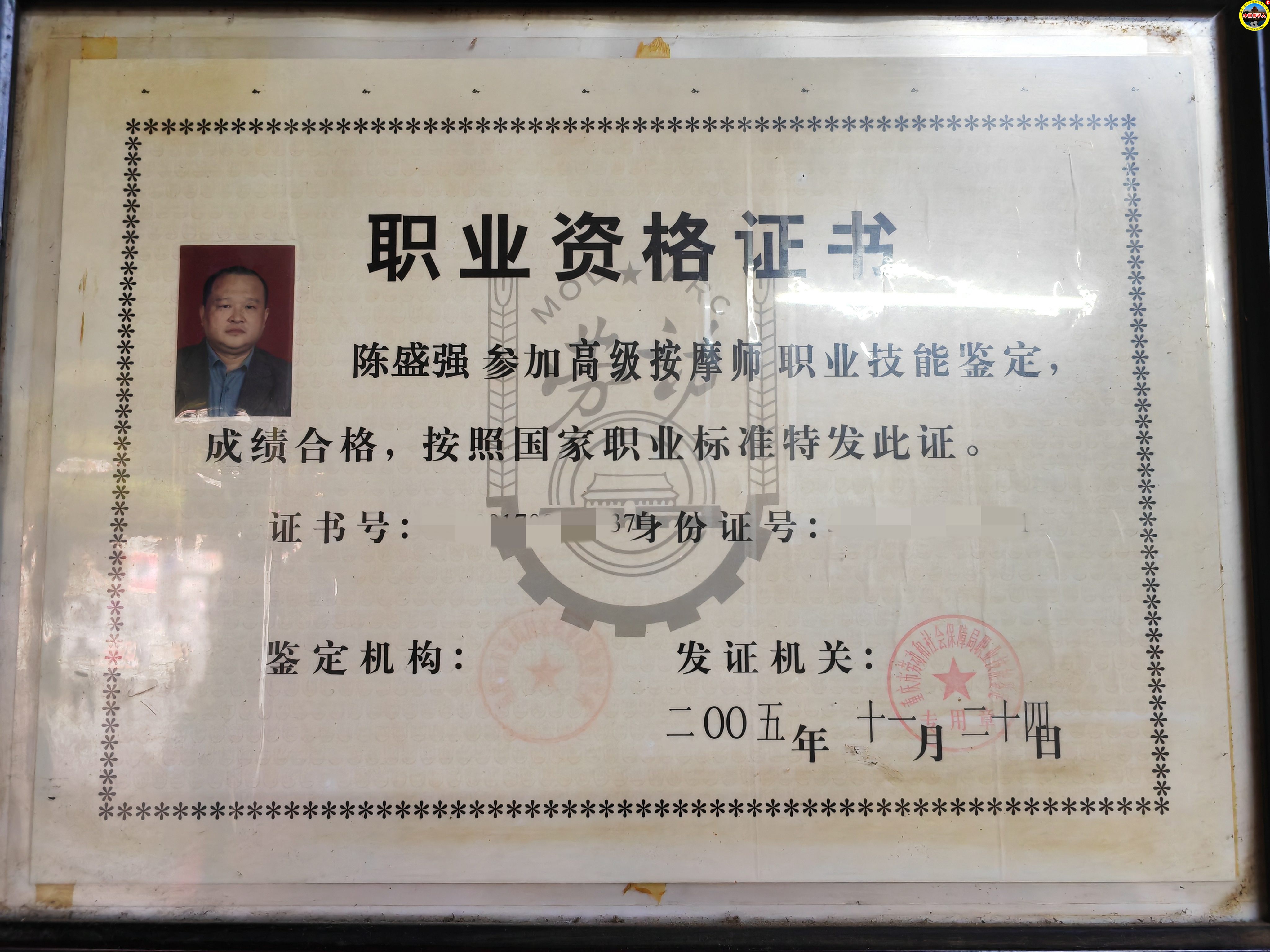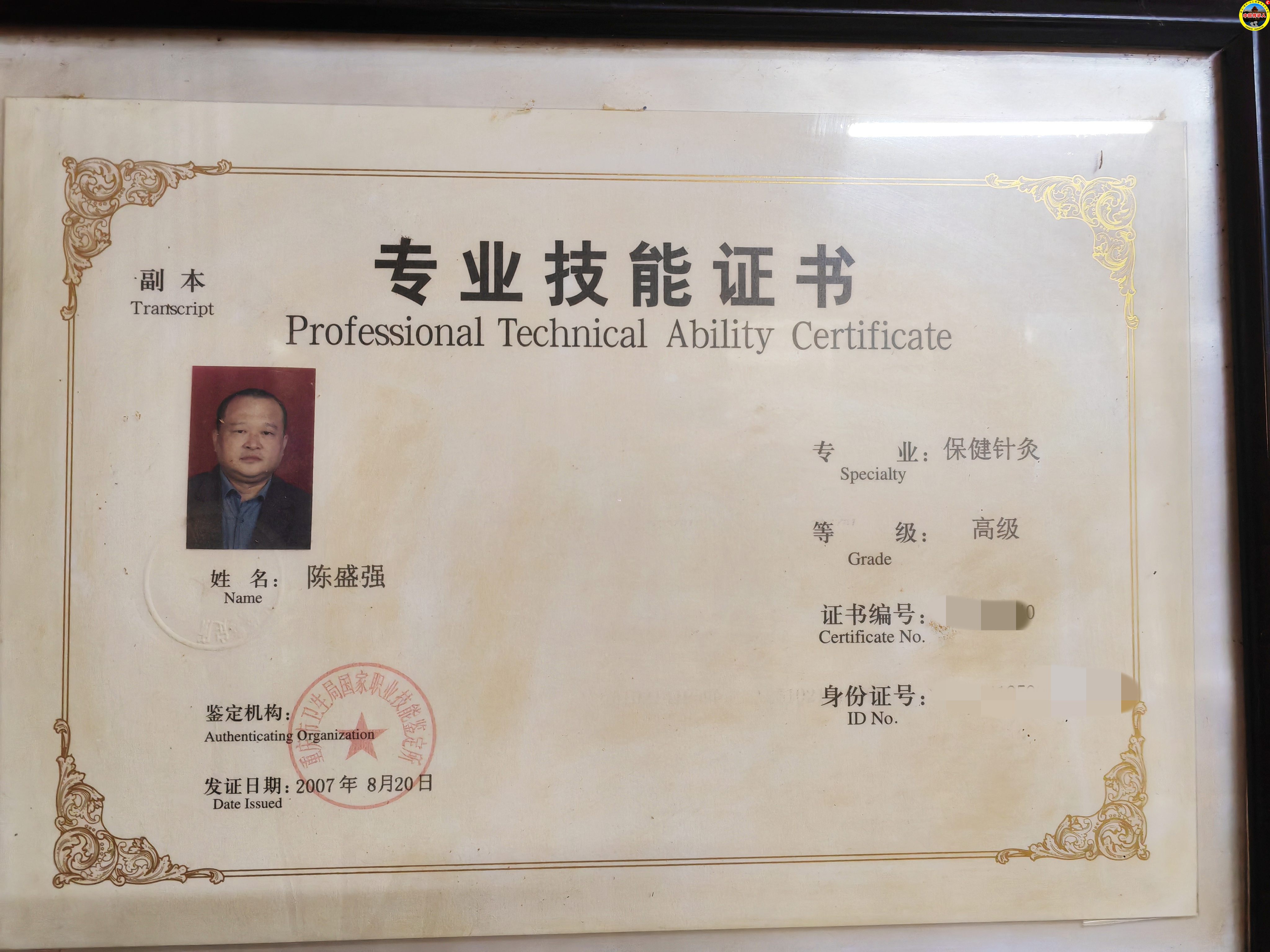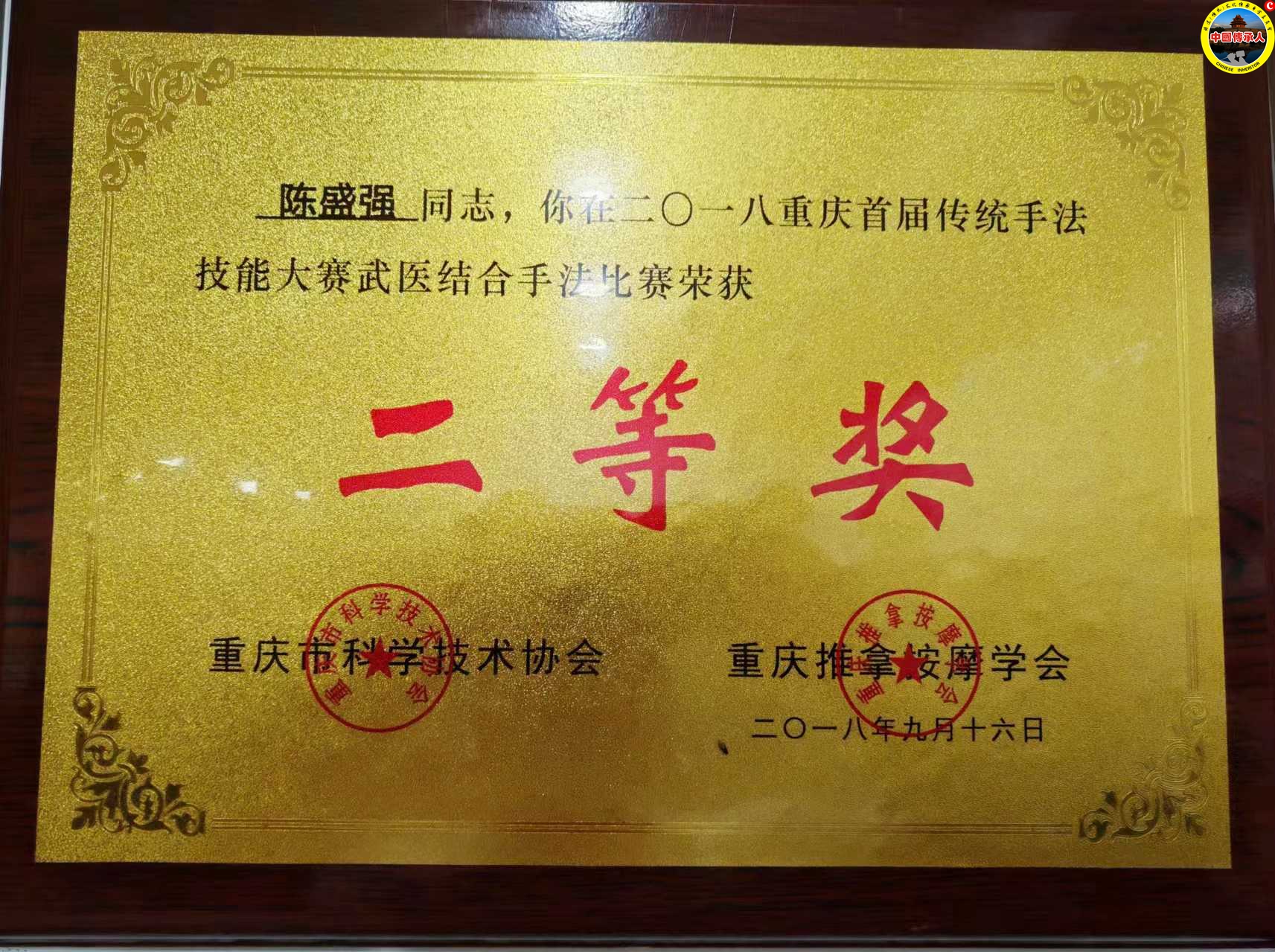 陈盛强传承于上世纪七十年代初,随其叔爷爷陈在然(重庆南岸区知名中医骨伤科医生及武术名家)学习武医正骨术,八十年代师从陈镕時先生(重庆市名老中医),学习内科杂症。2002年4月报经国家工商行政管理局批准,获得执业资格,并独资创办成立“南岸区陈盛强理疗保健所”获准注册登记。