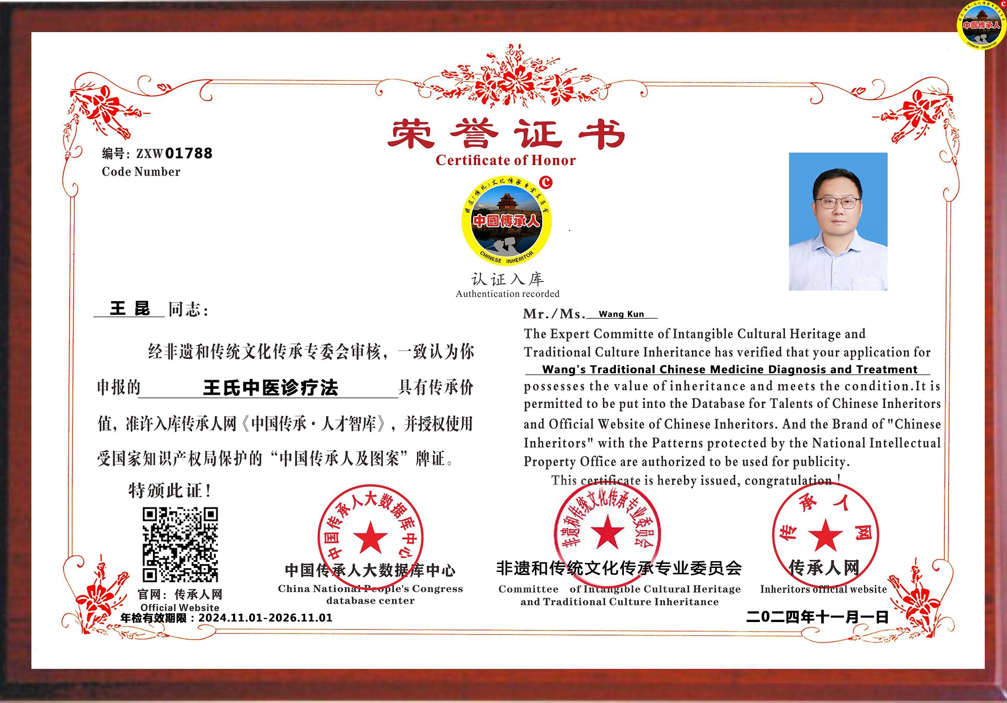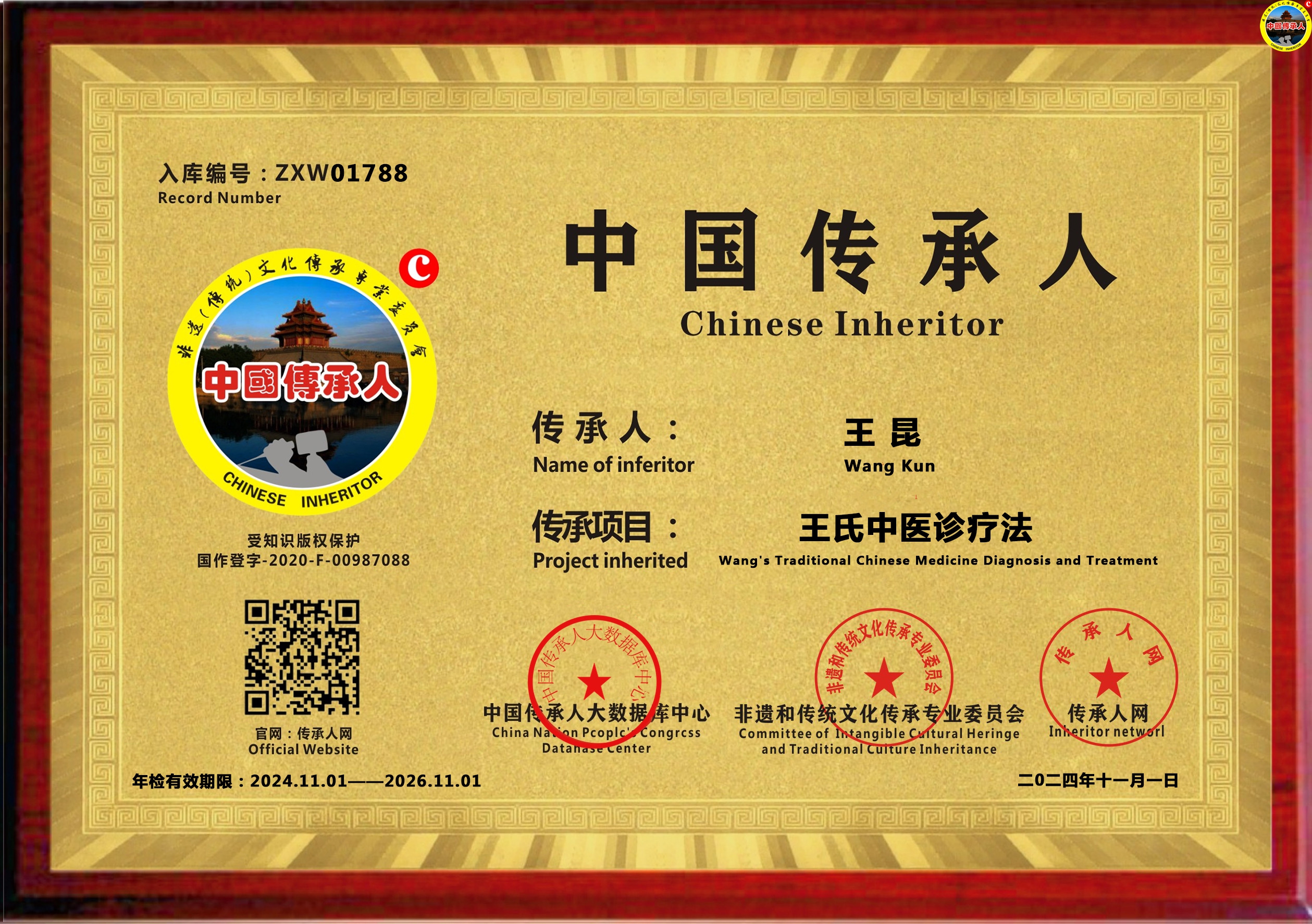 传承人网:2024年11月22日,经中国传承人大数据库中心非遗和传统文化传承专业委员会审核,认为北京市王昆同志申报的“王氏中医诊疗法”具有传承价值,符合申报条件,准许入库传承人网《中国传承·人才智库》,并授权使用受知识产权保护“中国传承人及图”牌证。