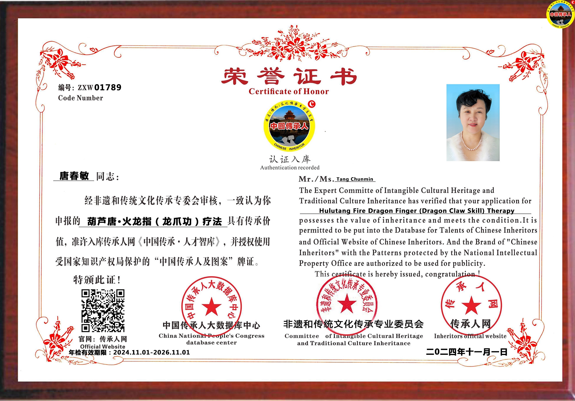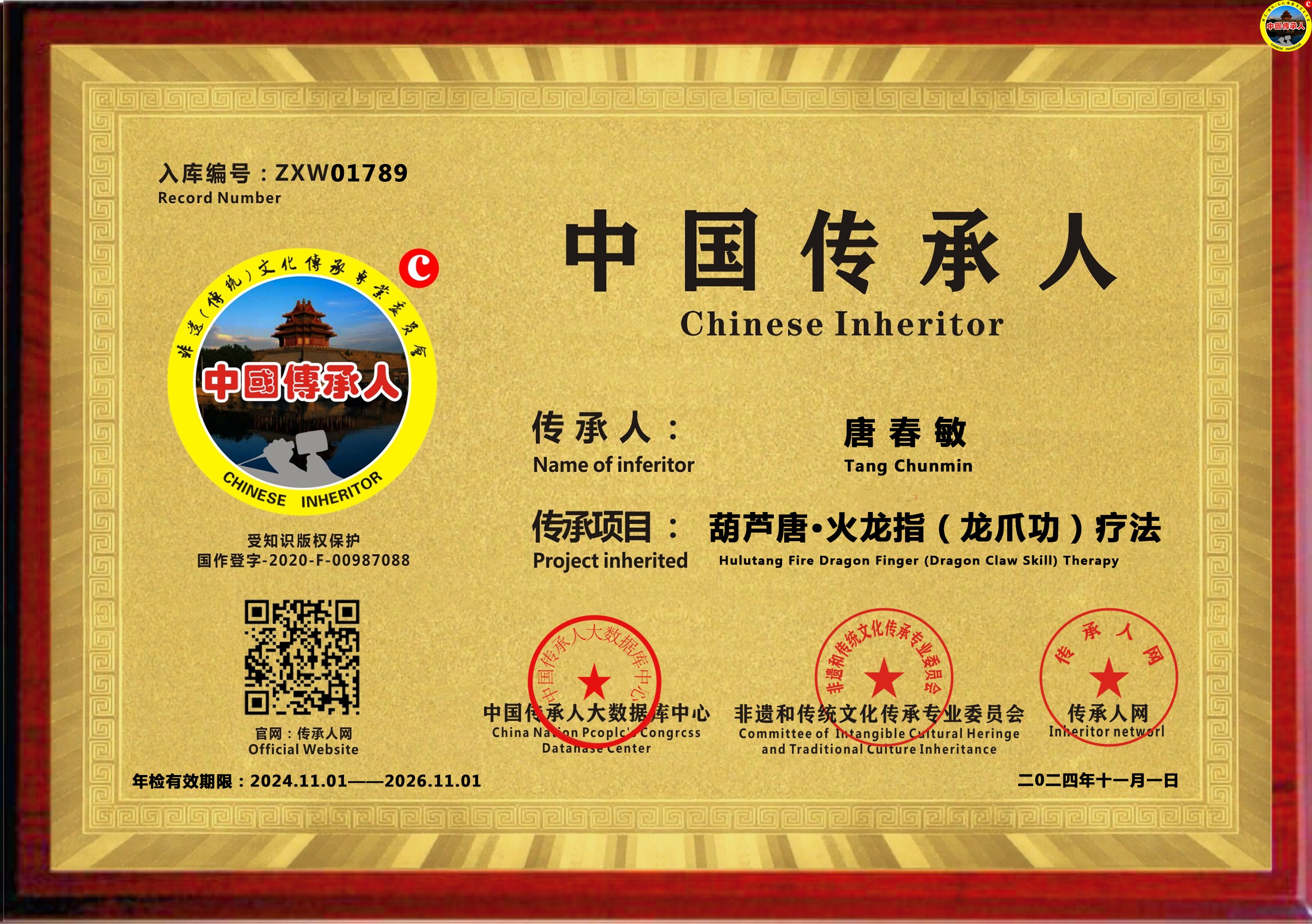 传承人网:2024年11月25日,经中国传承人大数据库中心非遗和传统文化传承专业委员会审核,认为北京市唐春敏(唐悦)同志申报的“葫芦唐·火龙指(龙爪功)疗法”具有传承价值,符合申报条件,准许入库传承人网《中国传承·人才智库》,并授权使用受知识产权保护“中国传承人及图”牌证。