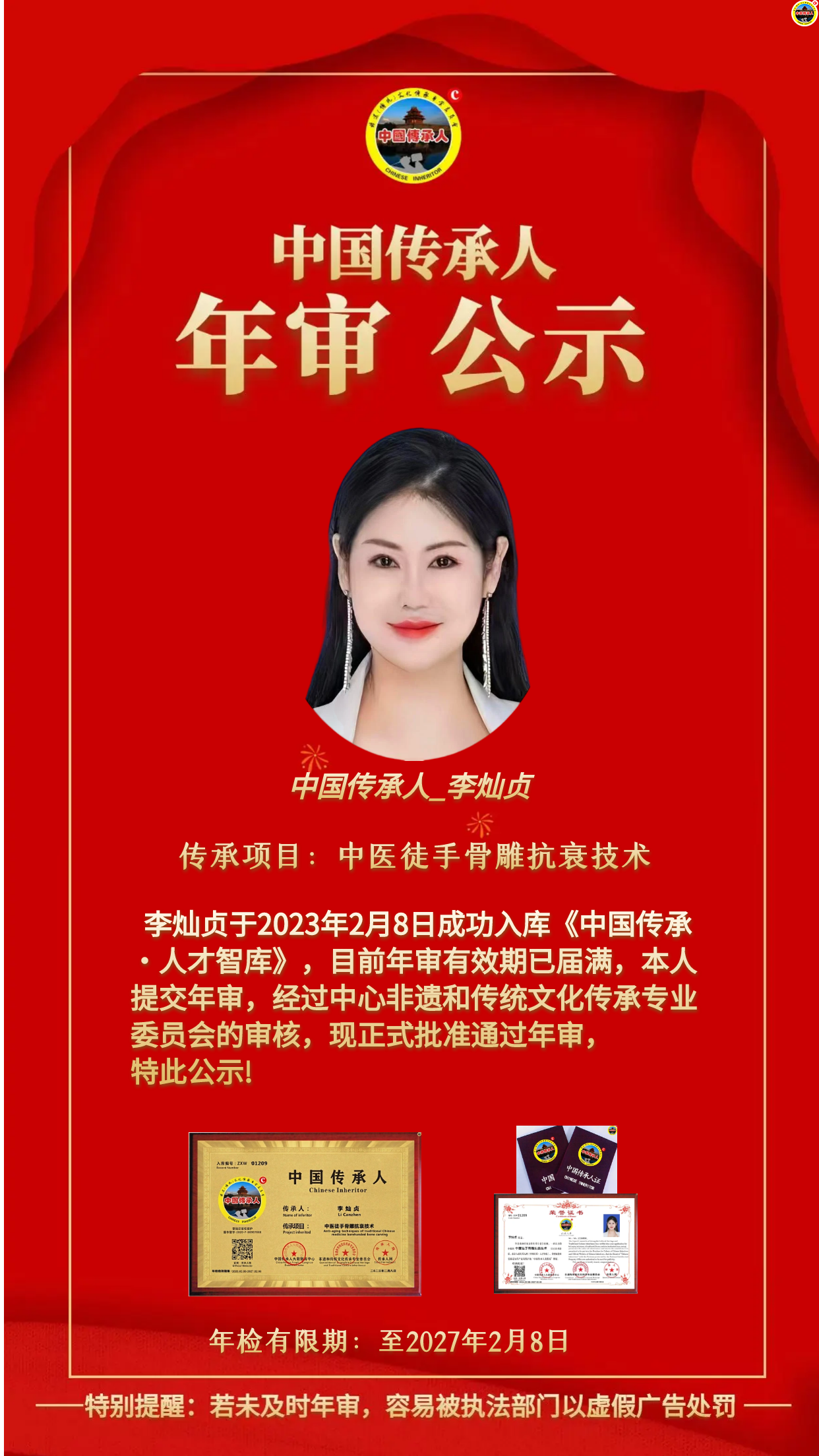 年审公示:1209位“中医徒手骨雕抗衰技术”传承人李灿贞