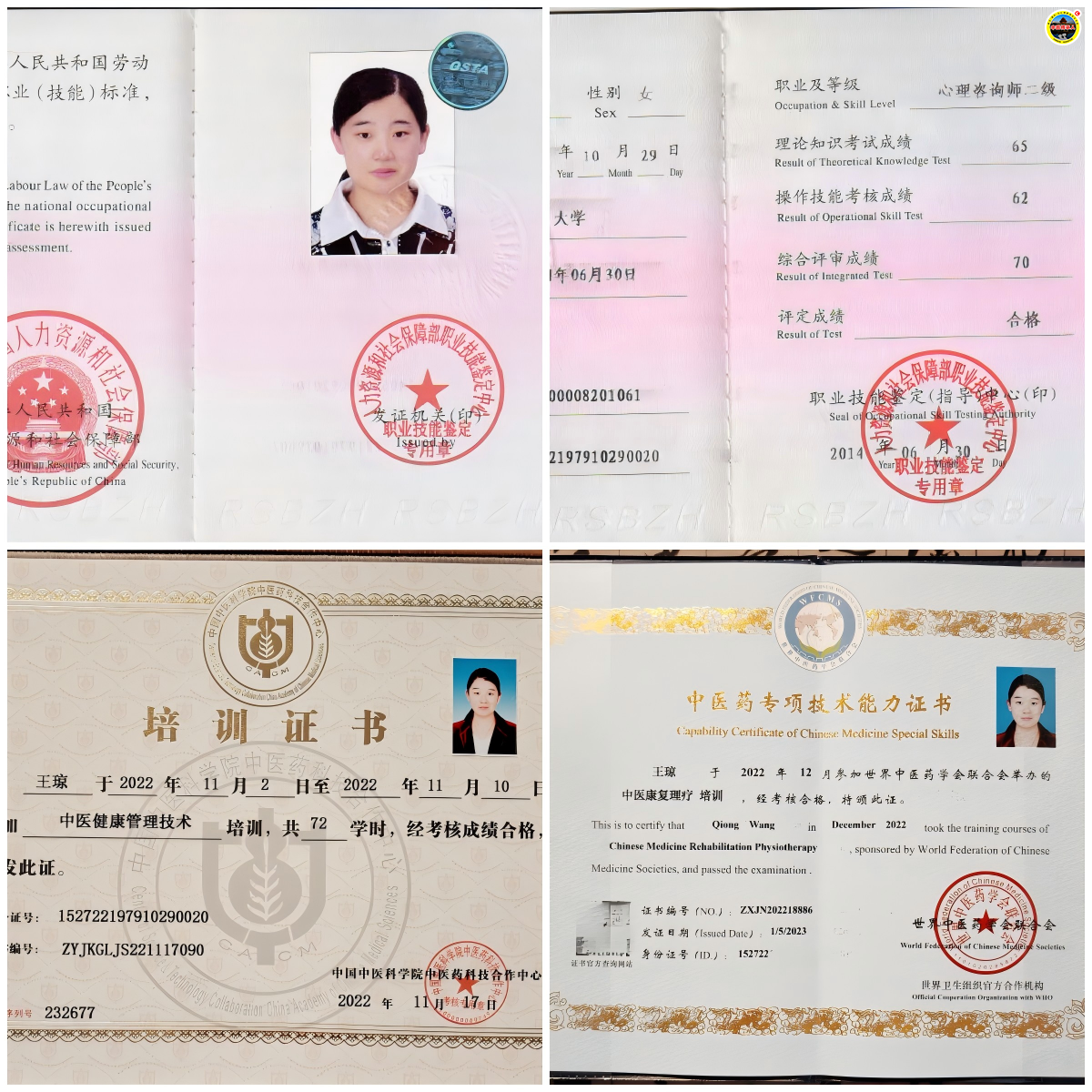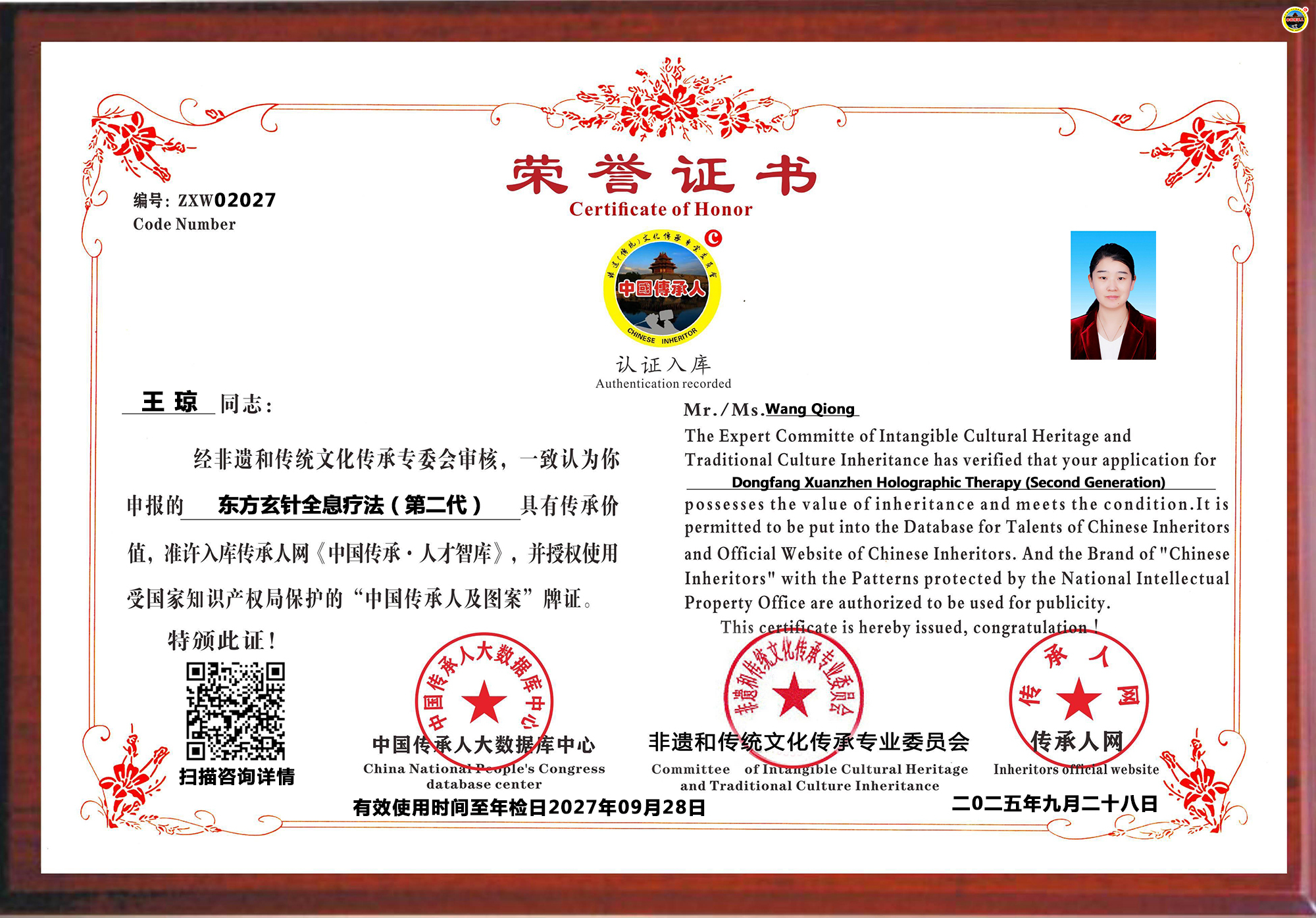 传承人网公示:2025年09月29日,内蒙古鄂尔多斯市王琼同志申报的“东方玄针全息疗法(第二代)”具有传承价值,准许入库传承人网《中国传承·人才智库》,并授权使用受知识产权保护“中国传承人”入库荣誉牌证。