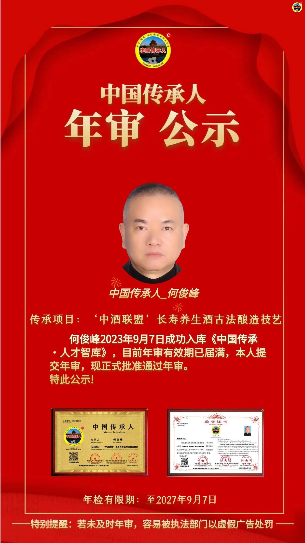 年审公示:1440位“‘中酒联盟’长寿养生酒古法酿造技艺”传承人何俊峰