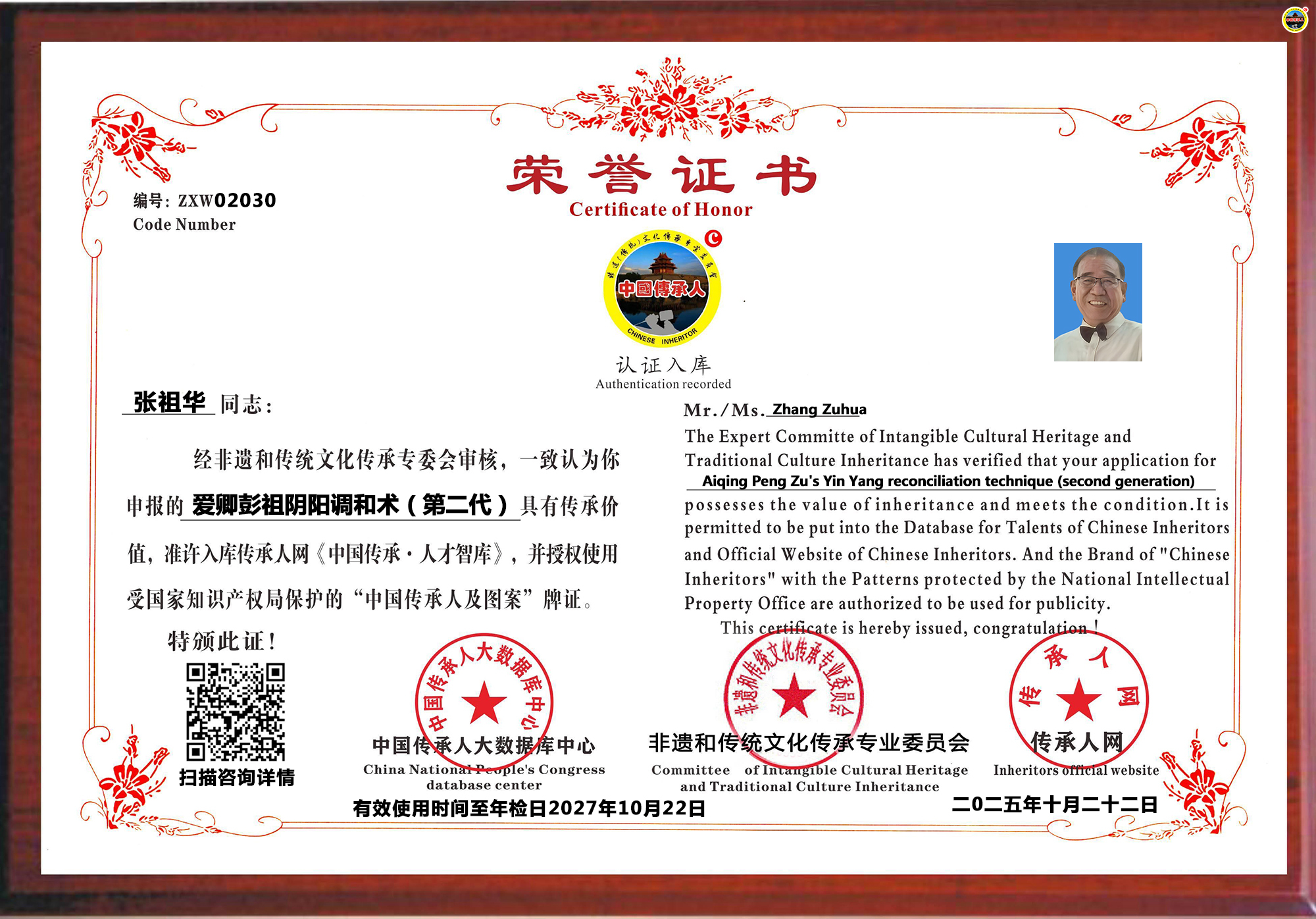 传承人网公示:2025年10月23日,四川省成都市张祖华同志申报的“爱卿彭祖阴阳调和术 (第二代)”具有传承价值,准许入库传承人网《中国传承·人才智库》,并授权使用受知识产权保护“中国传承人”入库荣誉牌证。