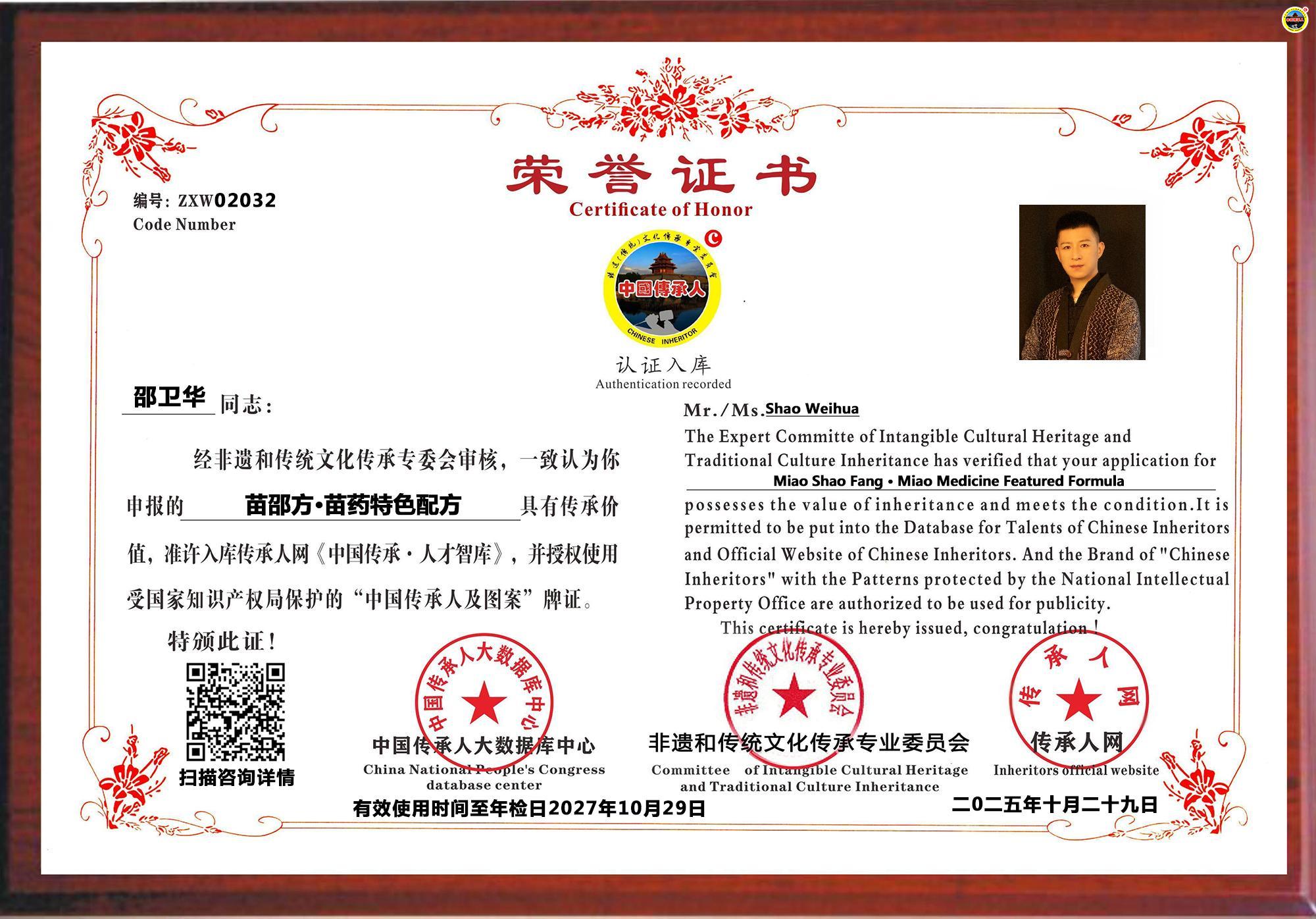邵卫华,男,1979年生,苗族,湘西苗邵方传承人。湘西苗邵方自诞生之日起,便与苗家百草紧密相连。1842年,邵家先辈怀揣着对苗药的热爱与执着,开启了这段跨越世纪的医药传承之旅。七代人薪火相传,始终将苗家百草的特色传承视为使命,深入挖掘苗药资源,传承和创新苗药炮制技艺,让古老的苗药文化在现代社会焕发出新的生机。
