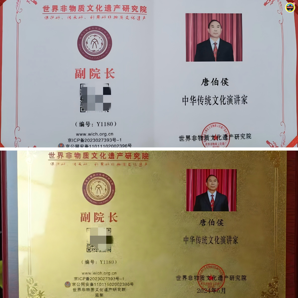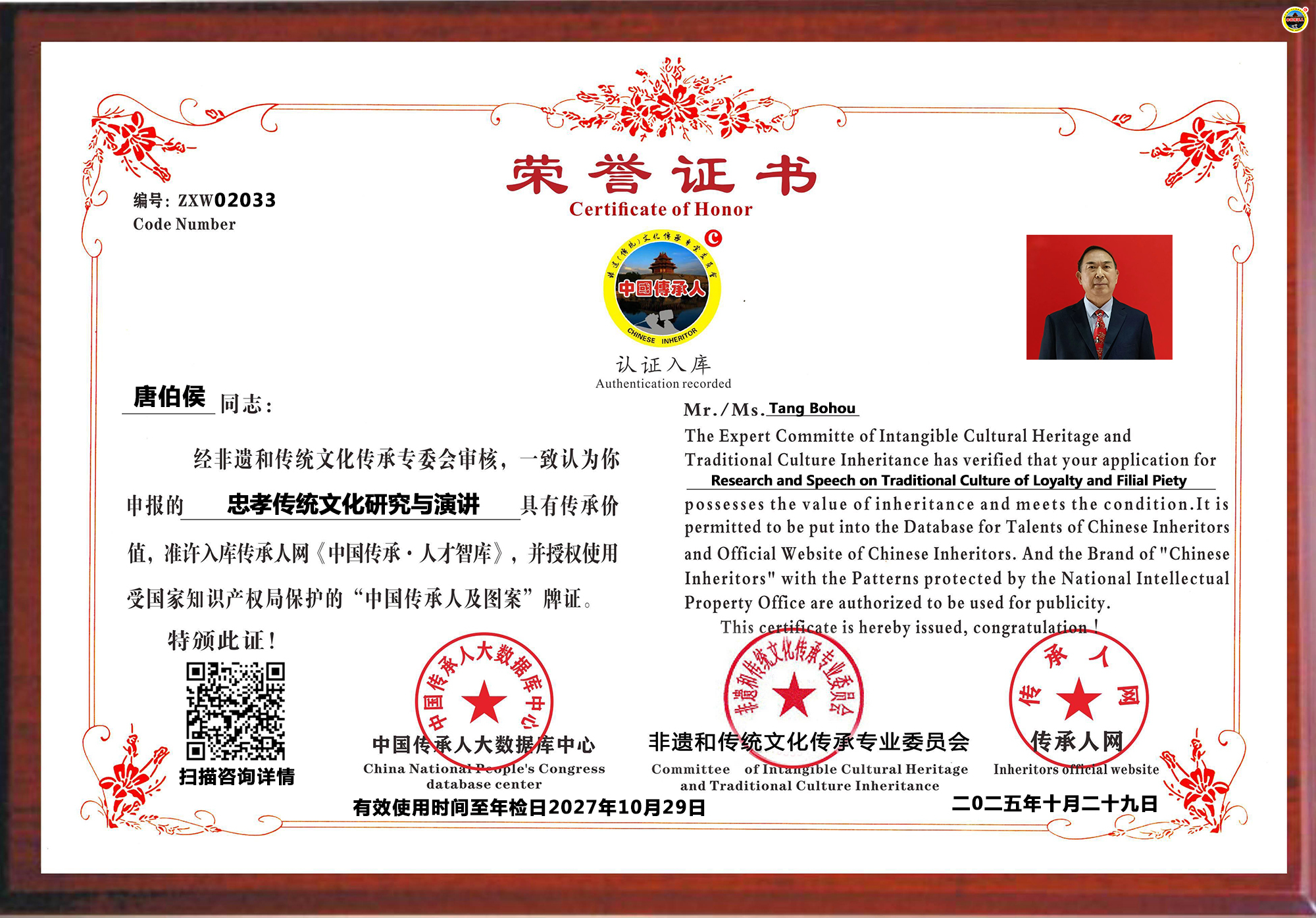 传承人网公示:2025年10月29日,四川省达州市唐伯侯同志申报的“忠孝传统文化研究与演讲”具有传承价值,准许入库传承人网《中国传承·人才智库》,并授予受国家知识版权局保护的"中国传承人"入库荣誉牌证。